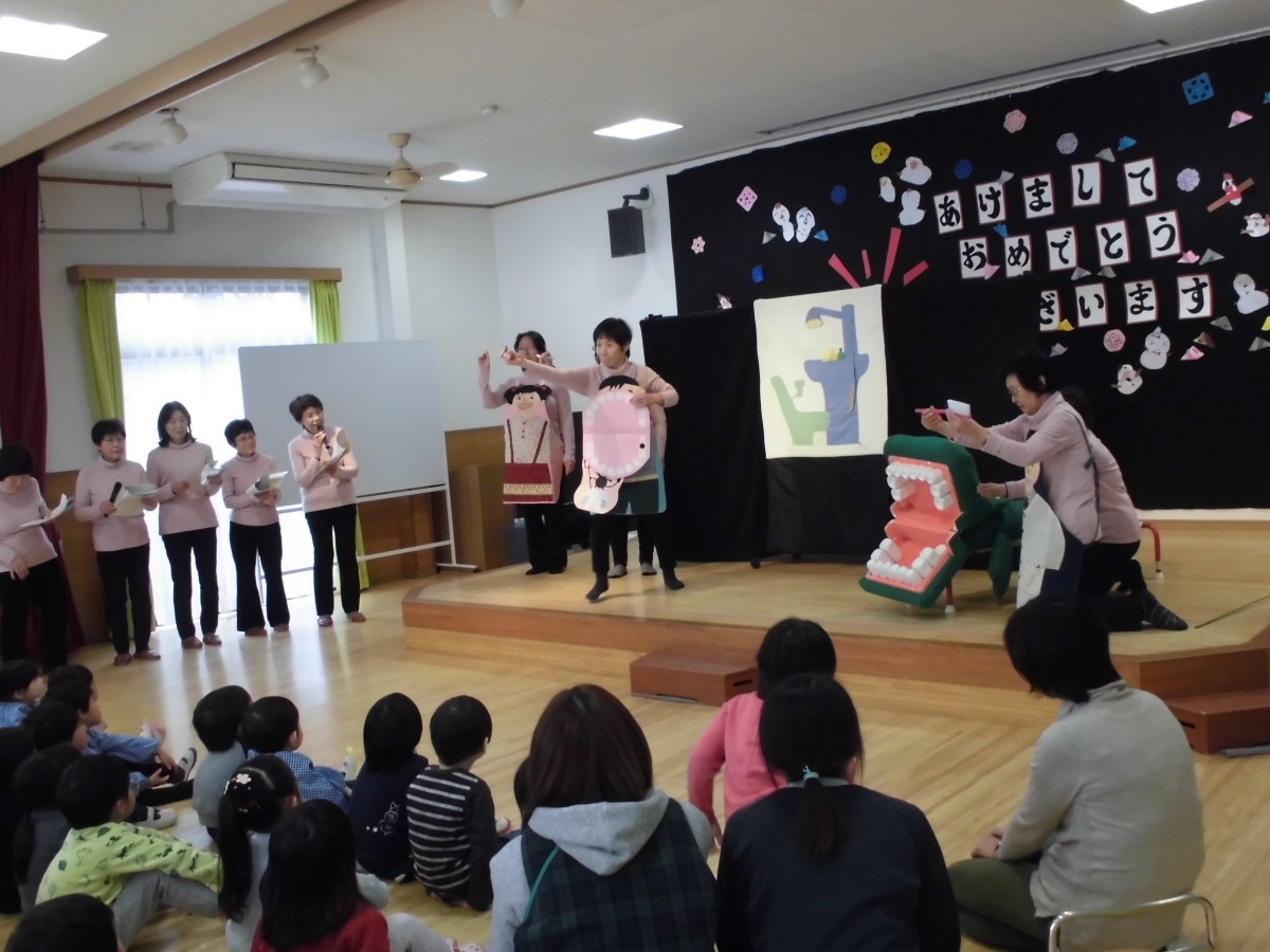 エプロンシアター「歯磨きできるかな4つのお約束」 毎年、「山田こども園」と「すぎのここども園」の子供たちに歯磨きの大切さを伝えています。 ここ2年間は、コロナの影響で訪問できていません。掲載した写真は令和元年のものです。