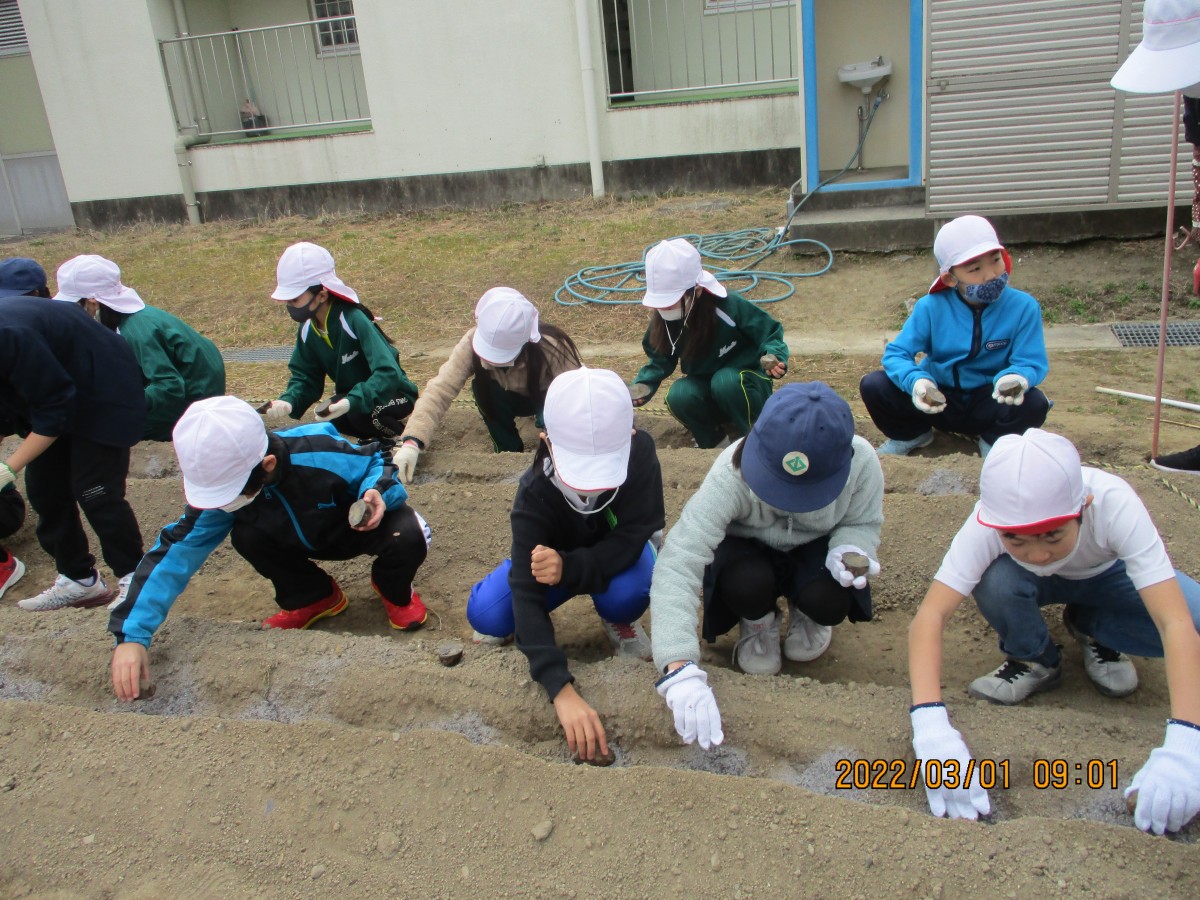 2021じゃがいも植え 小学3年生 <準備作業> ・雑草取り ・元肥料まき耕運機にて耕す ・ウネたて 種芋準備・購入後イモ切り 担任の先生と日程打合せ <植え付け後作業> ・芽が出た後水やり ・追肥及び土寄せ二回