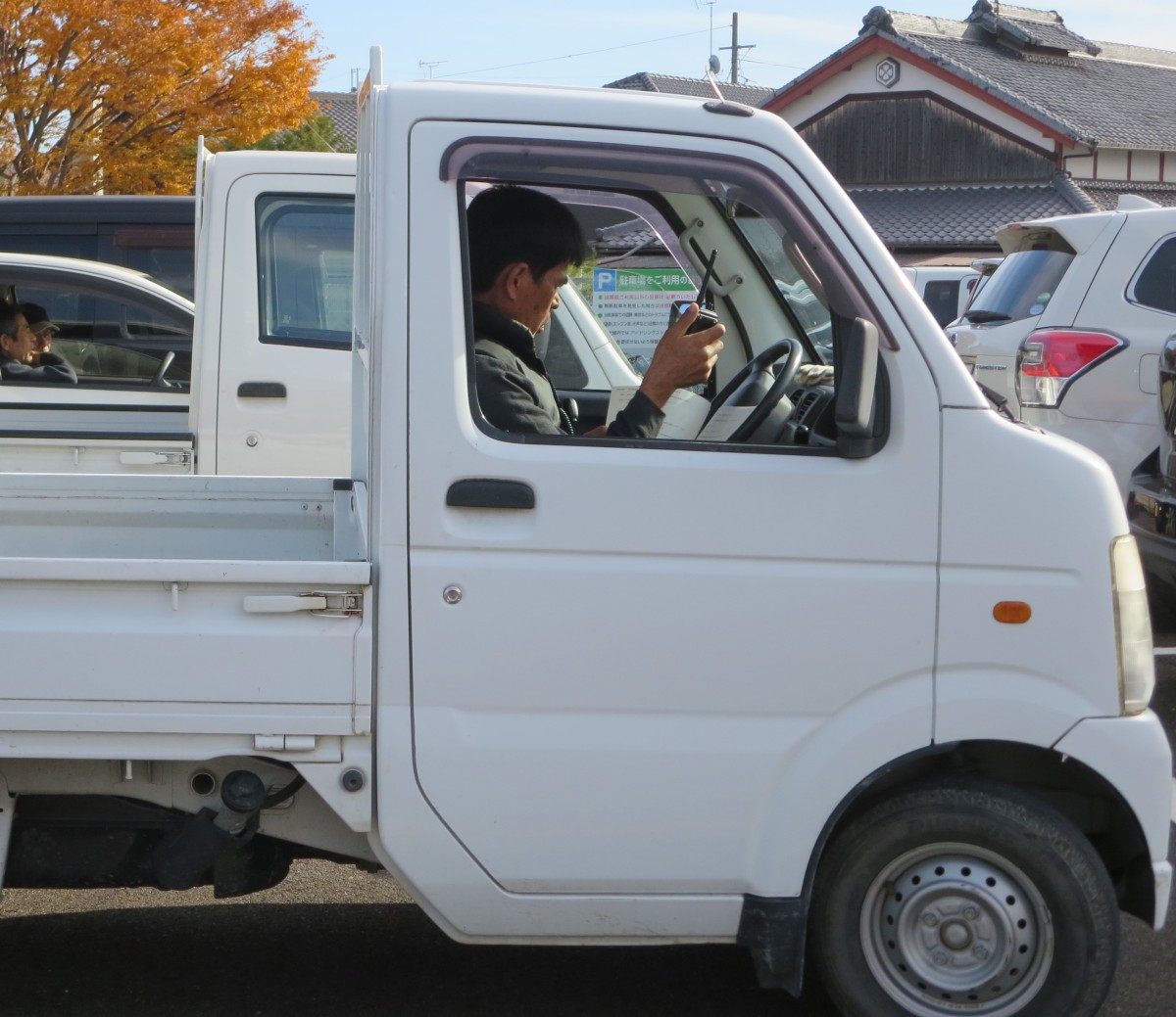 災害発生時に各町内との連絡を取り合うため、駐車場に止めた車と本部でフローチャートを参考に、無線での情報伝達訓練をしました。