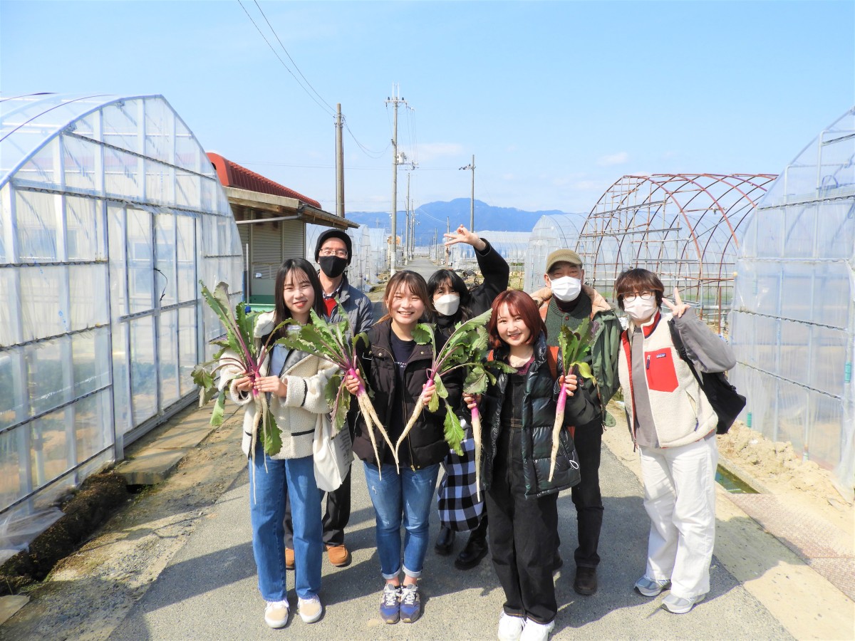 日野菜の収穫体験をさせていただきました。大学生もヤマミラメンバーもはじめての体験でしたが、すぅーっと根っこの部分まで綺麗に抜くのが意外と難しい