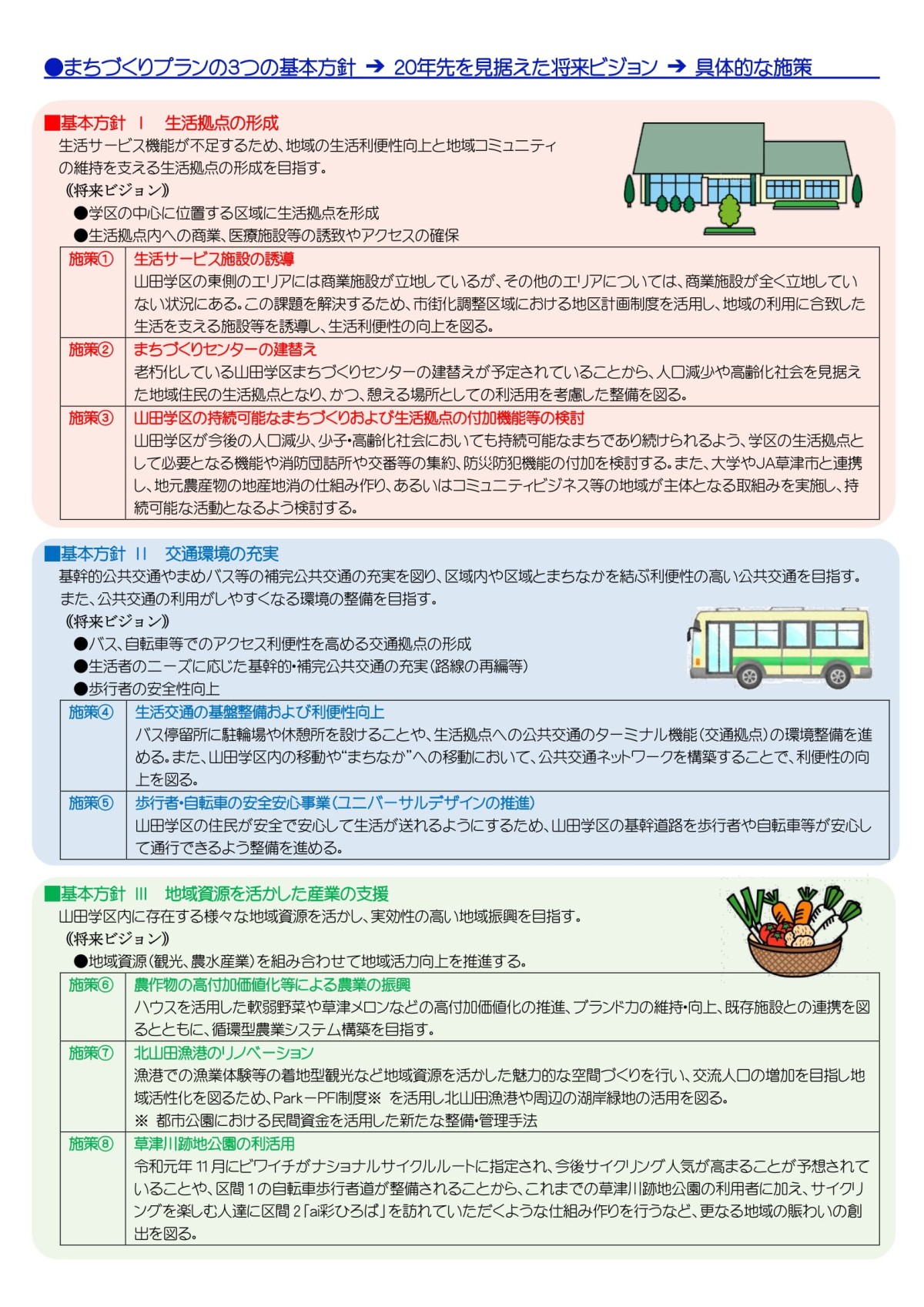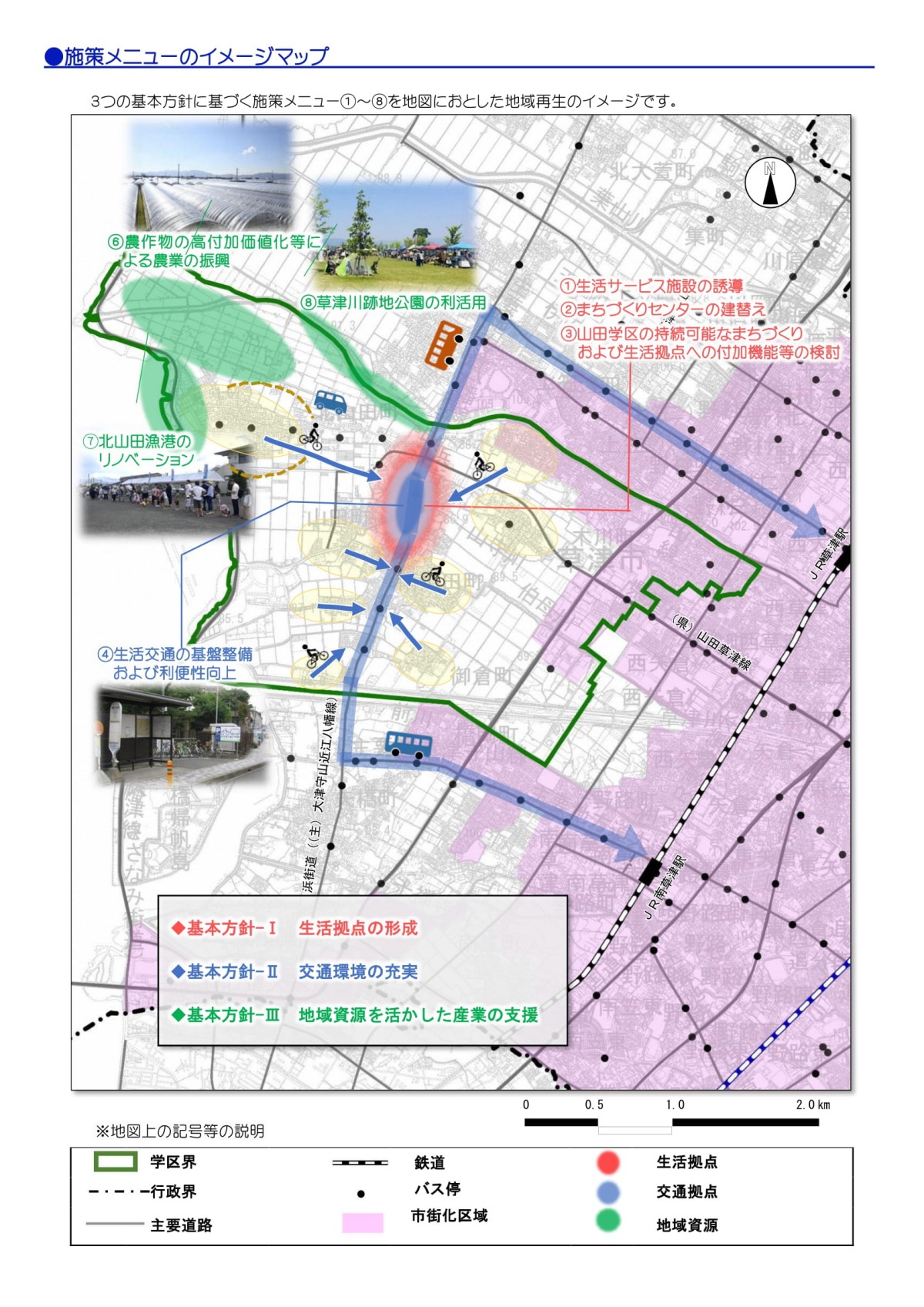 基本方針Ⅰ生活拠点の形成、Ⅱ交通環境の充実、Ⅲ地域資源を活かした産業の支援という3つの方針に着目しながら、