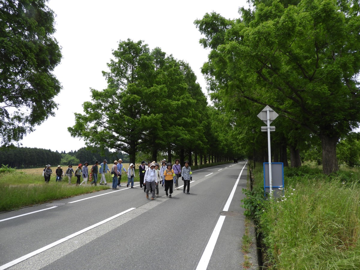 6月1日、晴天、今までで最高の58名の参加です。補助席を使い1台のバスで9時に出発し、予定通り10時30分には日本初のカタカナの町名マキノ町メタセコイヤ並木に到着しました。昭和56年に植樹が開始され、地域の人々の手により育まれた結果、現在の2.5km500本の壮大な並木道になったとのことです。そびえ立つメタセコイヤは新緑の葉が茂り、外から見るとまるで森のようです。並木道の真ん中に立つと左右対称・放射状に伸び、素晴らしい景観ですが、車道もあり危険なため、並木道の外側を歩きました。日差しは強く、少し汗ばむ程でしたが、眼にやさしい緑と爽やかな風、空気の清らかさに全員元気に歩き通す事ができました。