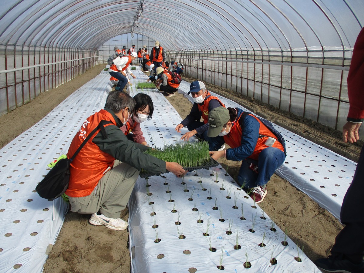 ネギの定植体験をしたハウス内の土は柔らかく、力を入れずに苗を植えることができました。作業後は汗ばむほどでした。 その後、ハウスのパイプラインから出る散水の様子を見ました。 次に訪れた畑では、旬の水菜がハウス内いっぱいに植えられ、それが何棟も続いて壮観でした。新鮮な水菜はシャキシャキと音が聞こえてきそうなほどでした。水菜には鍋用とサラダ用があり、葉の形が違うそうです。