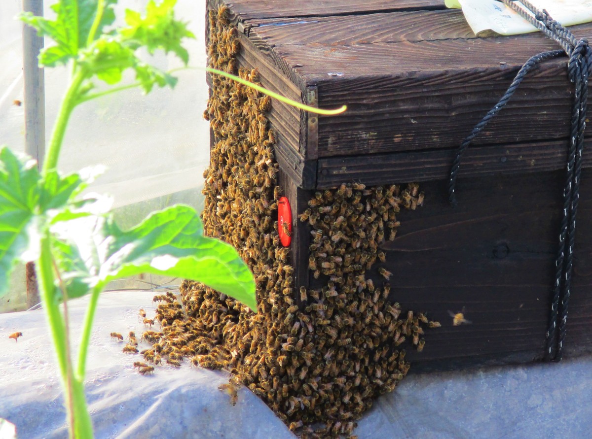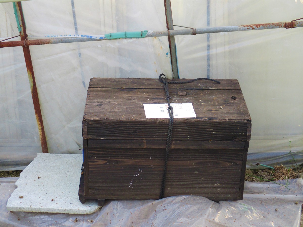 ↓こちらは、今日ハウスに置かれたばかりの巣箱です。ミツバチは巣箱の周りをウロウロ
