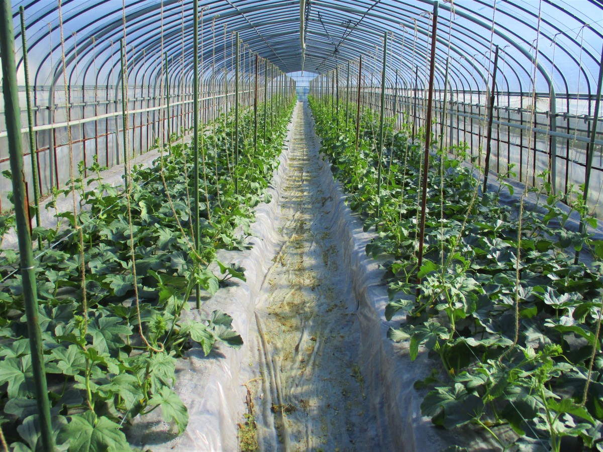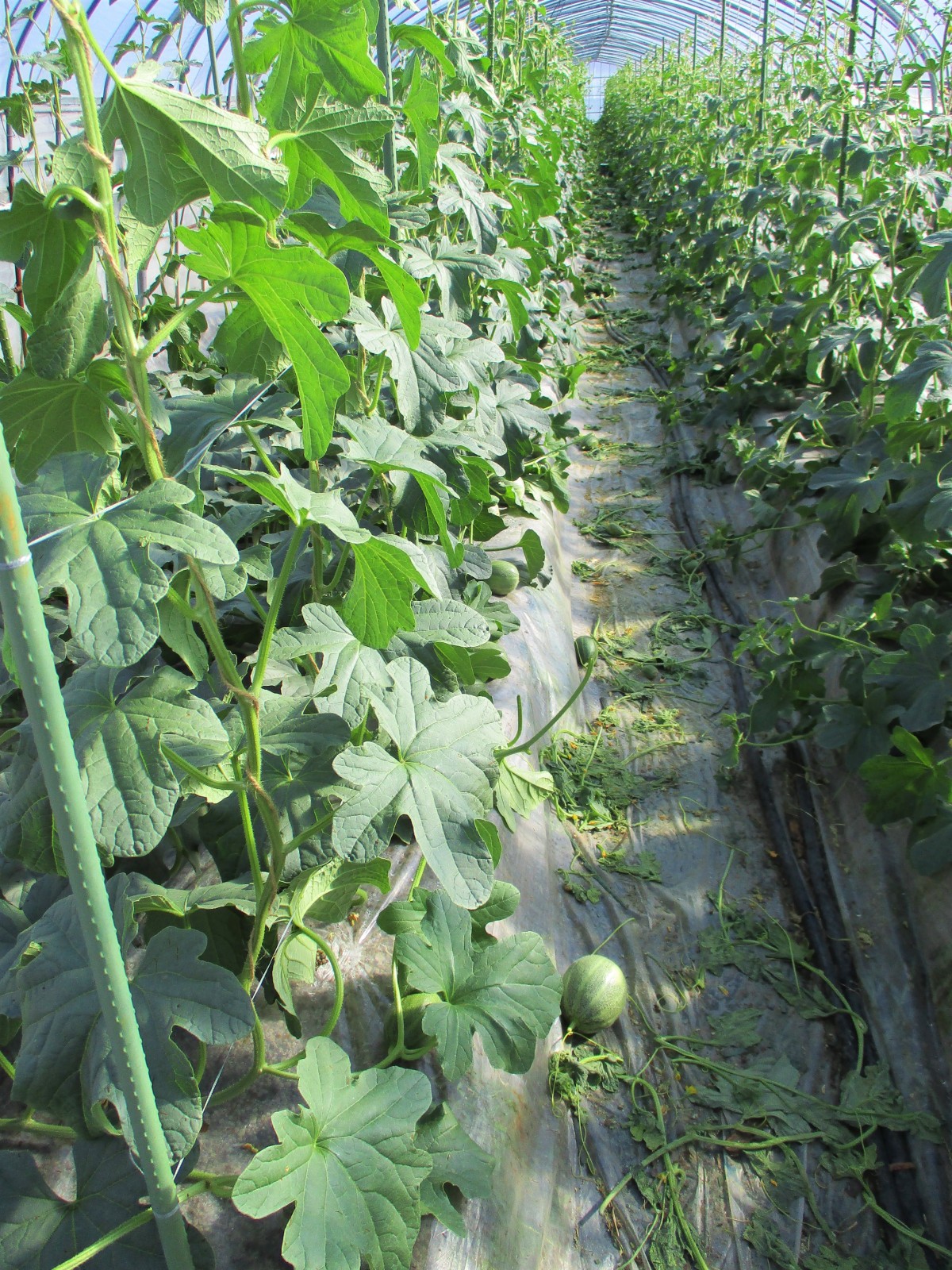 ミツバチのおかげで、10~12cmほどのふっくらとした実がたくさん付いていました。このハウスでは1本のつるにバランスのよい3個の実を残す摘果作業が行われていました。一つのハウスの摘果作業をするのに、お二人で丸一日かかるそうです。暑いハウスの中、ほんとに大変な作業です![]()