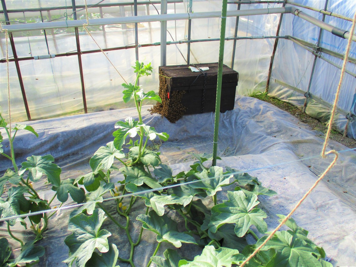 メロンハウスでは今ミツバチがせっせと働き中です!