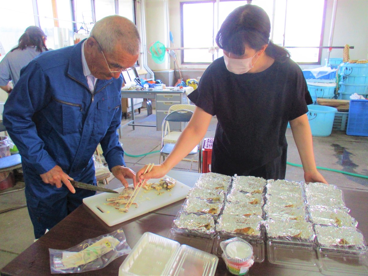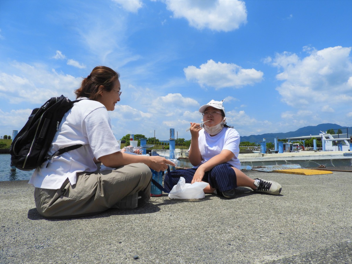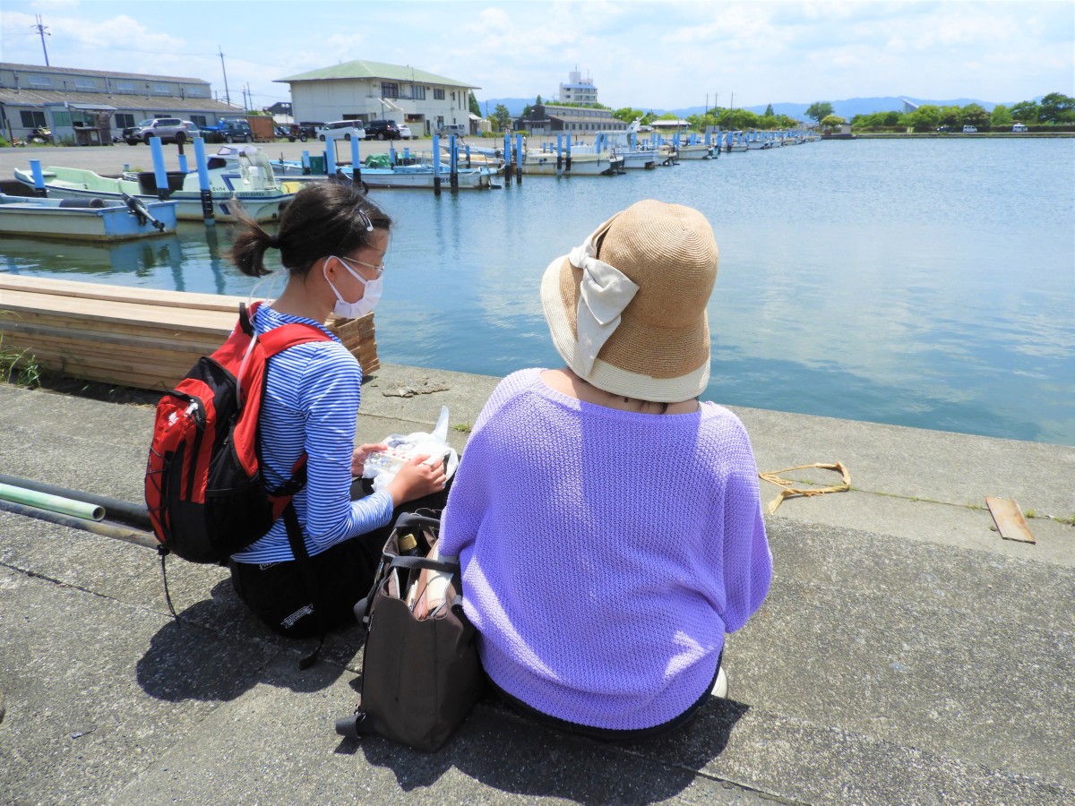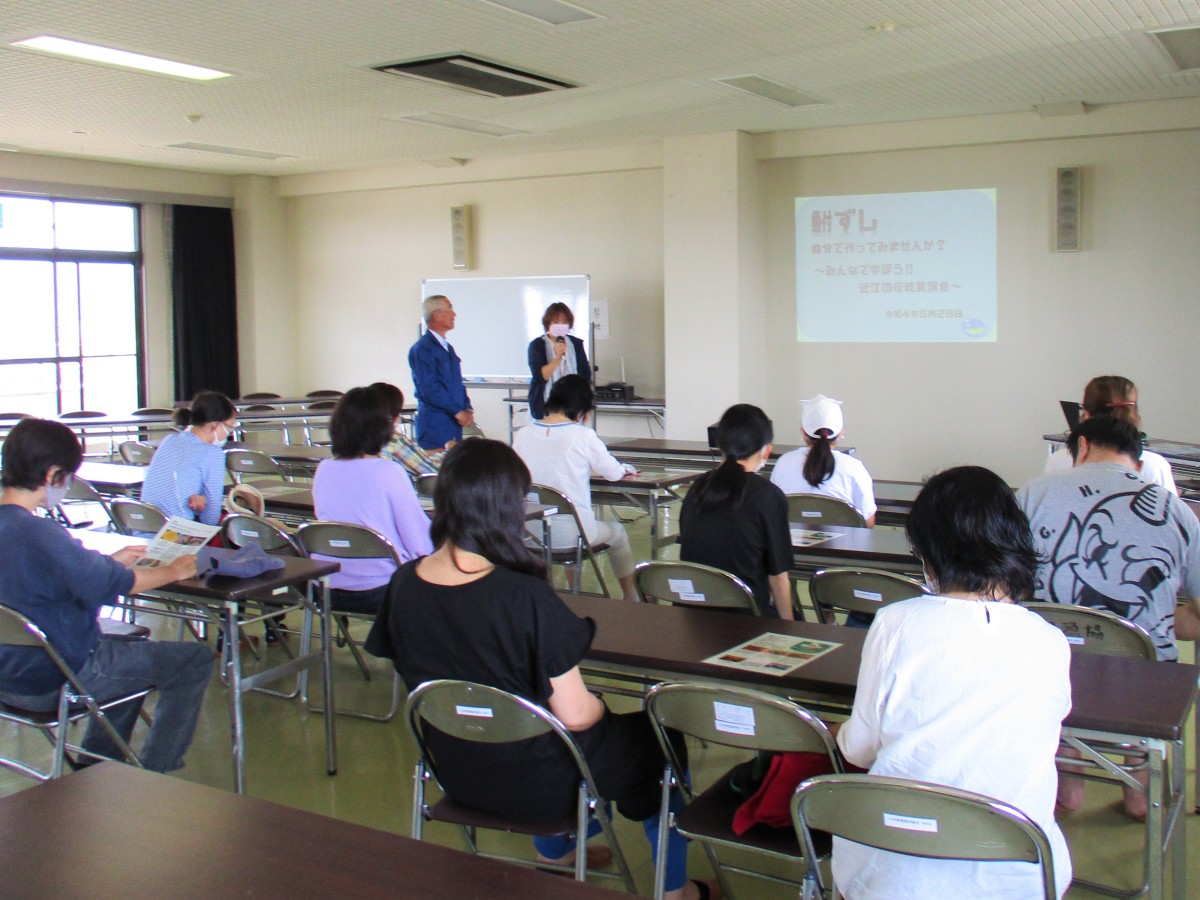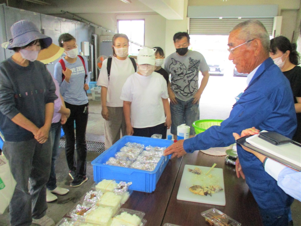 3回連続の鮒ずし講座、第1回目を5月28日(土)、北山田漁港で行いました。山田漁業協同組合 組合長 横江久吉さんから琵琶湖の漁の現況の話を聞き、プロジェクタを見ながら鮒ずしの作り方について学びました。その後は、南湖で朝捕ってきたばかりのモロコを炊いた飴煮や鮒ずしの試食をしました。漁港内には甘いタレのとてもいい香りが漂い、これだけで何杯でもごはんがいけるってくらい幸せな気分になりました。持って帰るも良し、心地よい晴天の下、漁港をバックに食べるも良し。参加者の中には、鮒ずしをまだ食べたことがない小学生や中学生もいて、親御さんに勧められ、おっかなびっくり口に運んでいました。大人でも好き嫌いが分かれる鮒ずしですが「やわらかくて、味も食べやすくておいしい」と大評判でした。「ただ美味しいものを作るだけの講座ではなく、琵琶湖の環境問題なども知ることができて有意義だった」と山田の漁業に興味を持ってくれる人もいました。次回はいよいよ本漬け作業!お楽しみに!(協力:ヤマミラ)