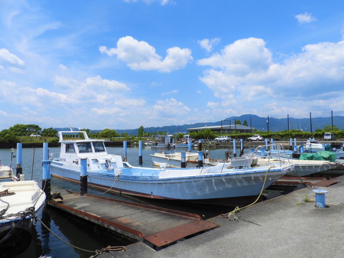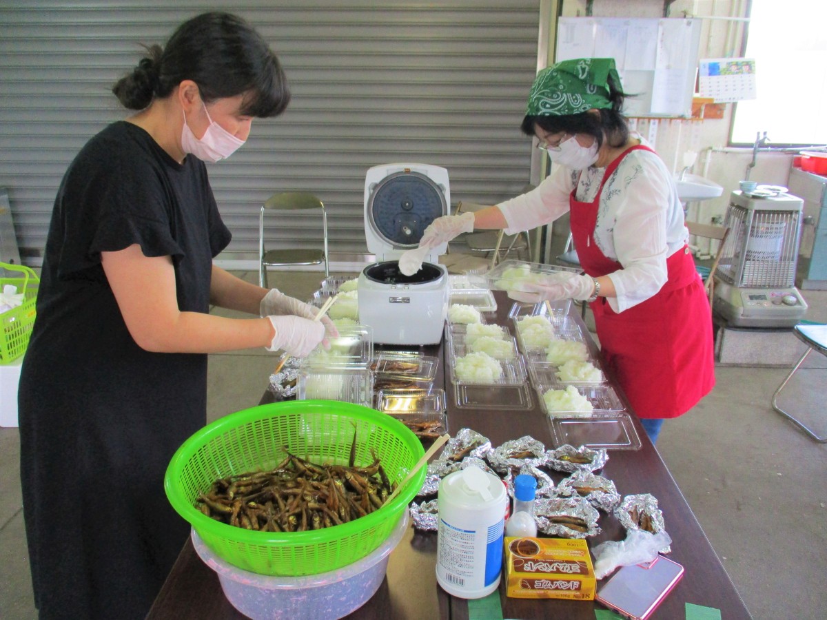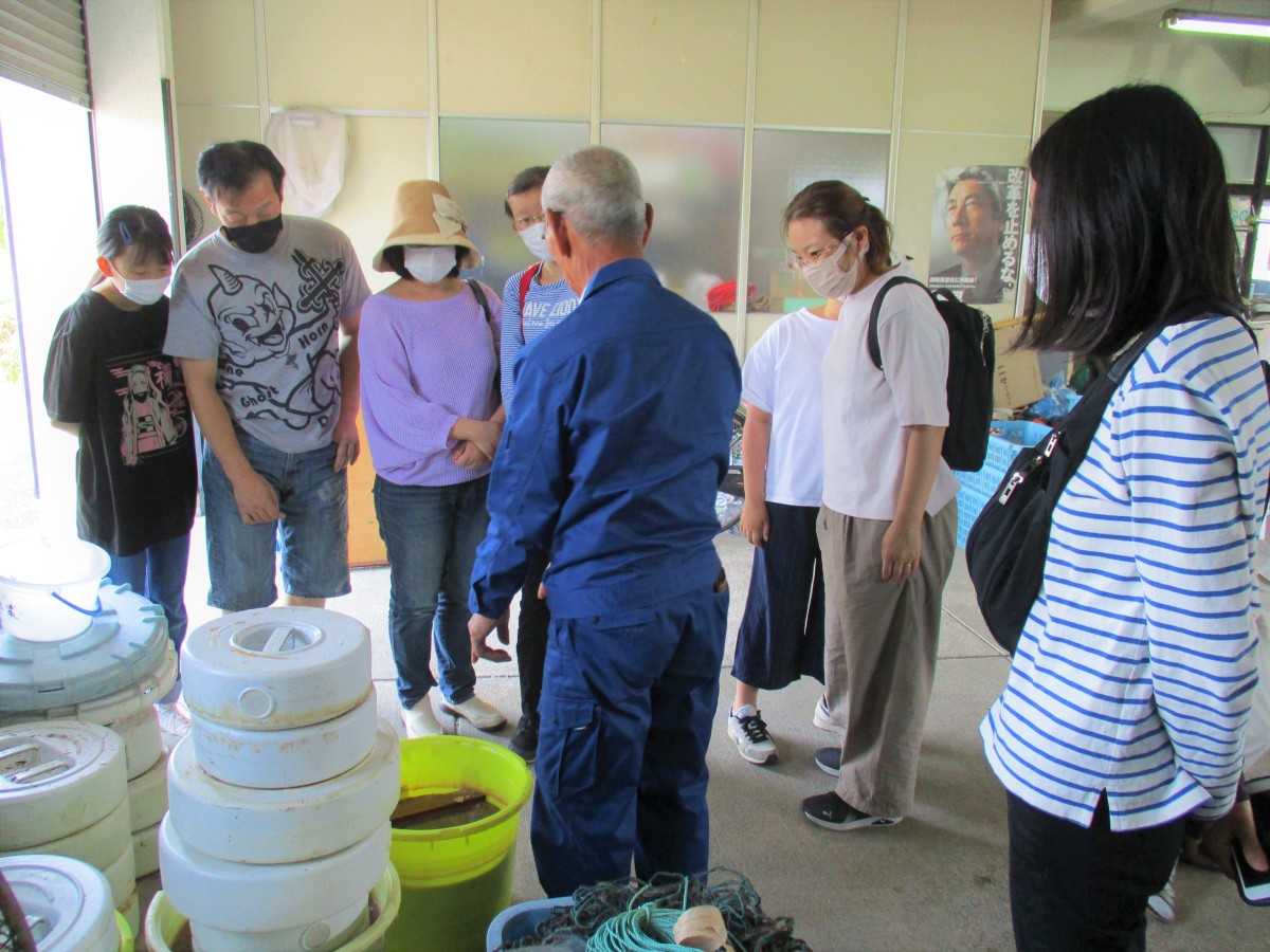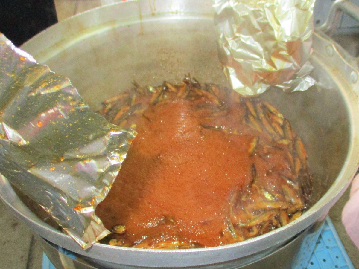 3回連続の鮒ずし講座、第1回目を5月28日(土)、北山田漁港で行いました。山田漁業協同組合 組合長 横江久吉さんから琵琶湖の漁の現況の話を聞き、プロジェクタを見ながら鮒ずしの作り方について学びました。その後は、南湖で朝捕ってきたばかりのモロコを炊いた飴煮や鮒ずしの試食をしました。漁港内には甘いタレのとてもいい香りが漂い、これだけで何杯でもごはんがいけるってくらい幸せな気分になりました。持って帰るも良し、心地よい晴天の下、漁港をバックに食べるも良し。参加者の中には、鮒ずしをまだ食べたことがない小学生や中学生もいて、親御さんに勧められ、おっかなびっくり口に運んでいました。大人でも好き嫌いが分かれる鮒ずしですが「やわらかくて、味も食べやすくておいしい」と大評判でした。「ただ美味しいものを作るだけの講座ではなく、琵琶湖の環境問題なども知ることができて有意義だった」と山田の漁業に興味を持ってくれる人もいました。次回はいよいよ本漬け作業!お楽しみに!(協力:ヤマミラ)