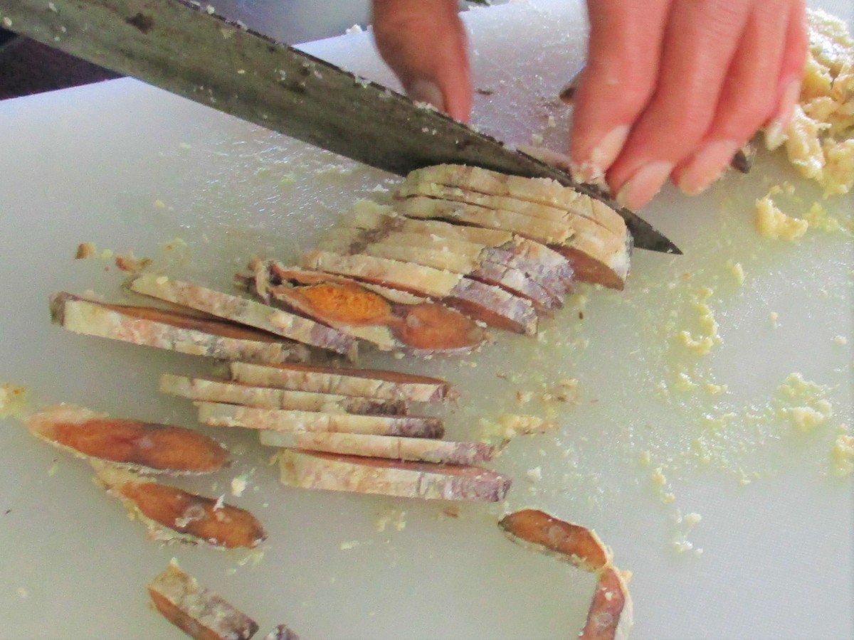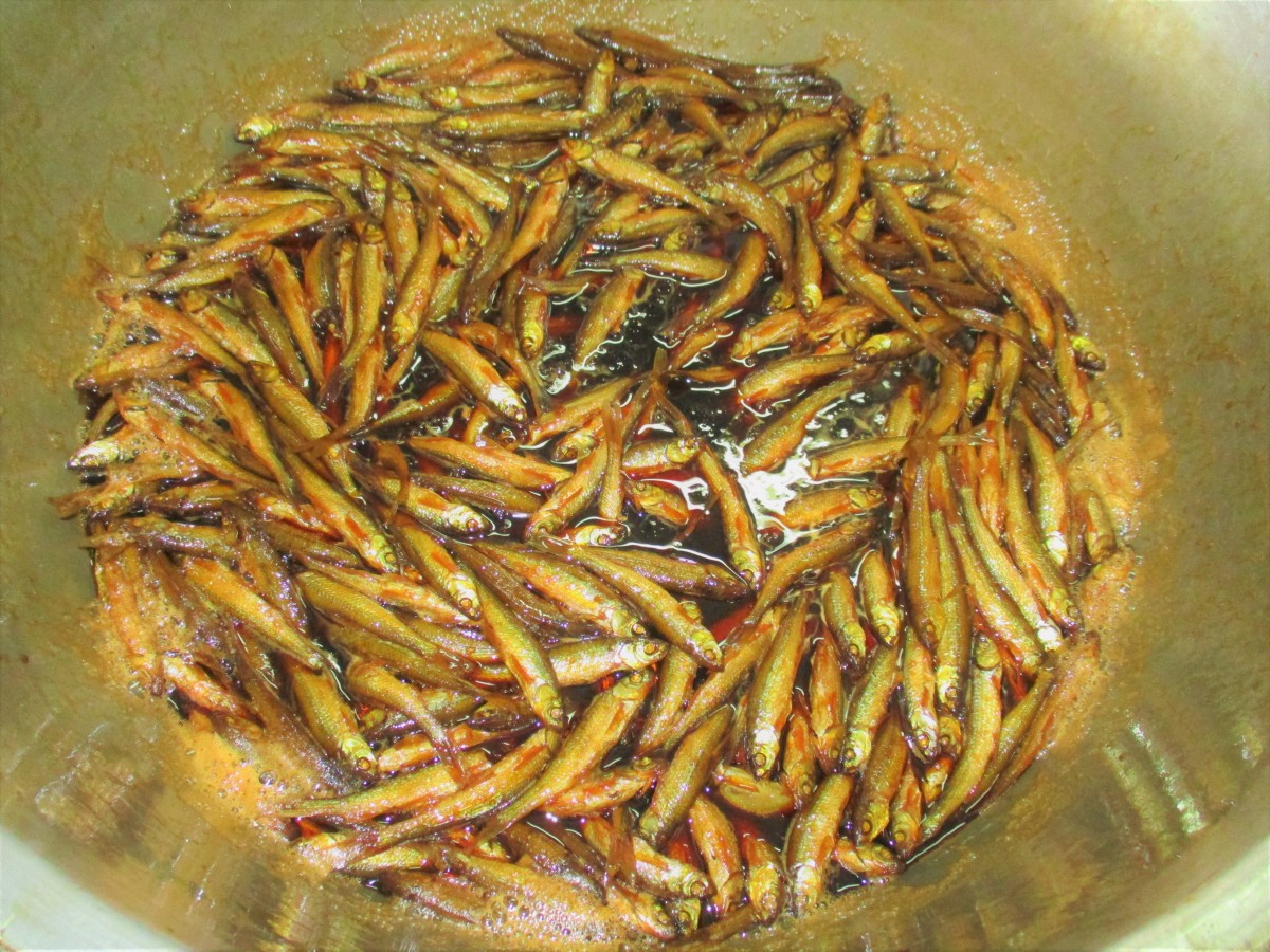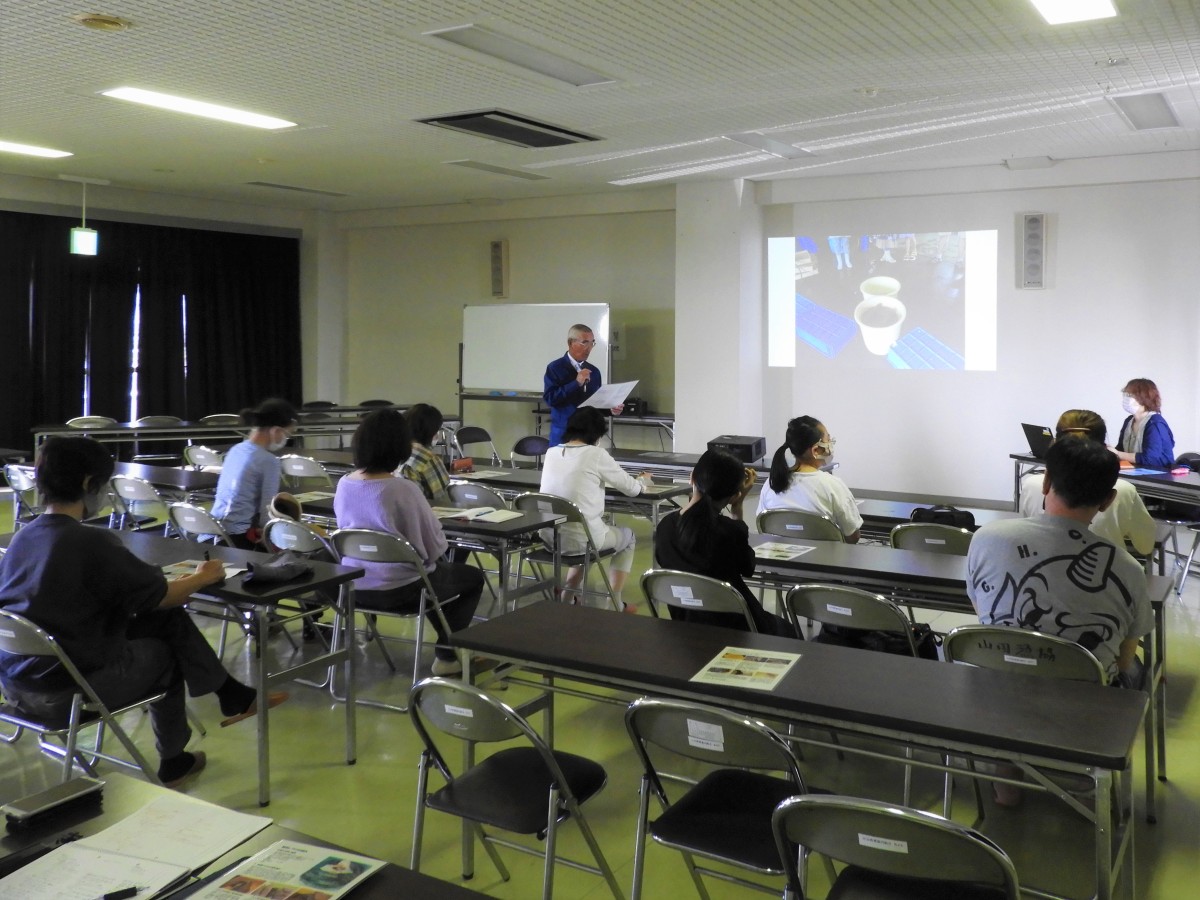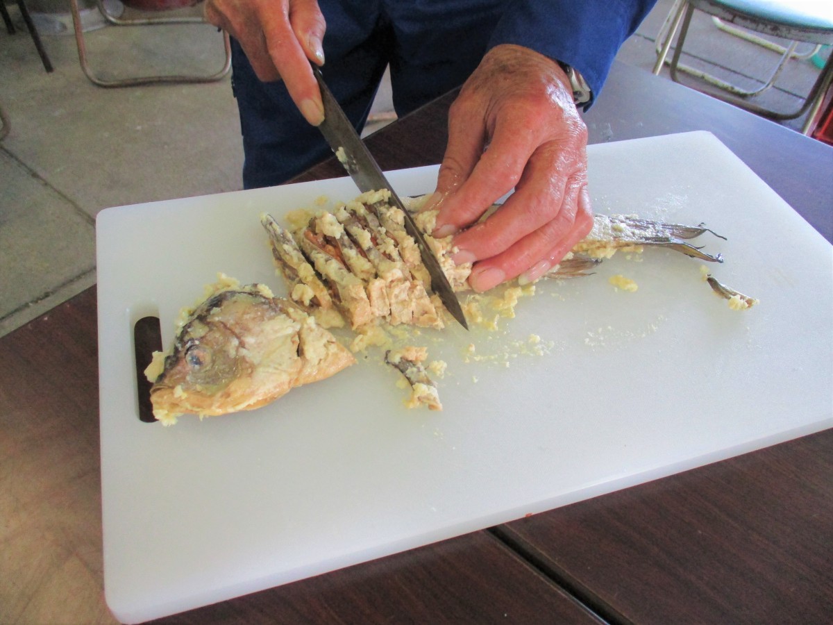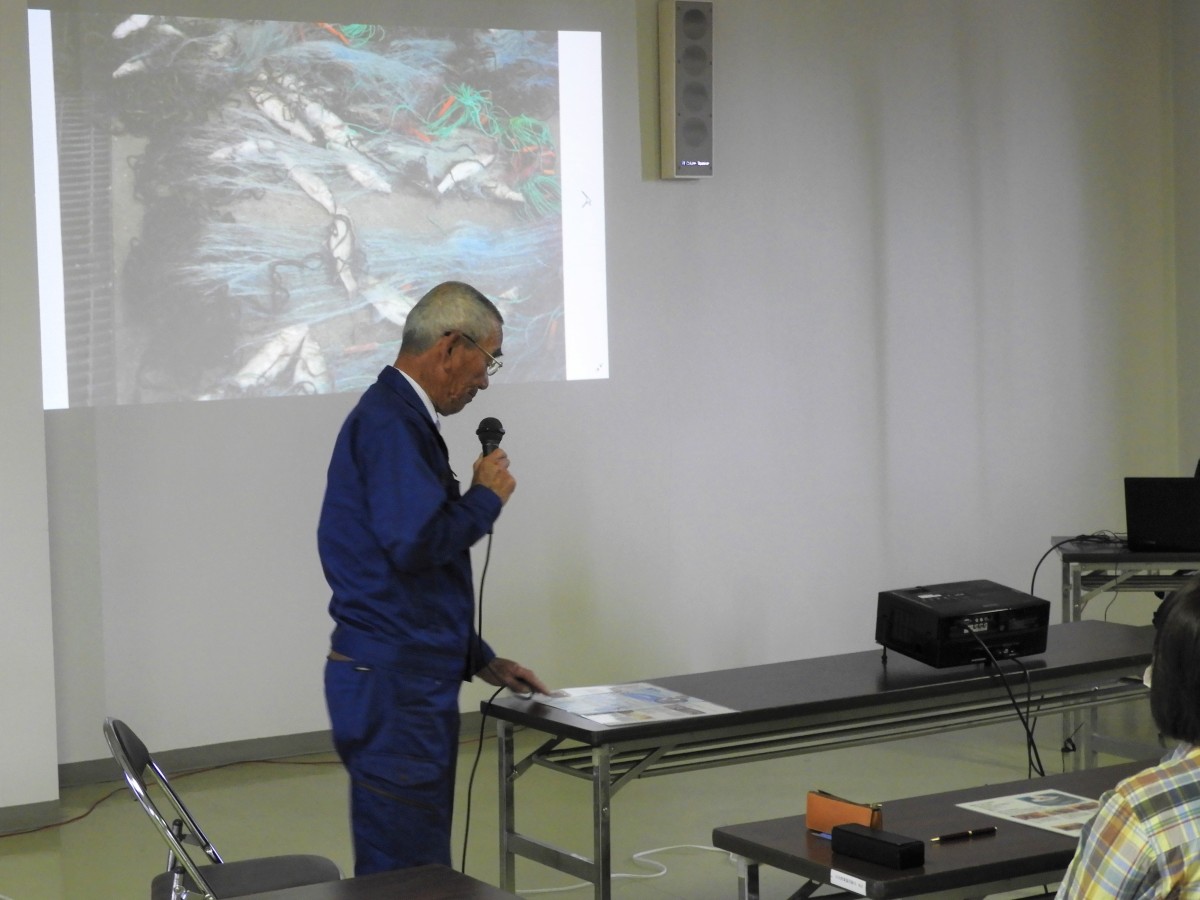 3回連続の鮒ずし講座、第1回目を5月28日(土)、北山田漁港で行いました。山田漁業協同組合 組合長 横江久吉さんから琵琶湖の漁の現況の話を聞き、プロジェクタを見ながら鮒ずしの作り方について学びました。その後は、南湖で朝捕ってきたばかりのモロコを炊いた飴煮や鮒ずしの試食をしました。漁港内には甘いタレのとてもいい香りが漂い、これだけで何杯でもごはんがいけるってくらい幸せな気分になりました。持って帰るも良し、心地よい晴天の下、漁港をバックに食べるも良し。参加者の中には、鮒ずしをまだ食べたことがない小学生や中学生もいて、親御さんに勧められ、おっかなびっくり口に運んでいました。大人でも好き嫌いが分かれる鮒ずしですが「やわらかくて、味も食べやすくておいしい」と大評判でした。「ただ美味しいものを作るだけの講座ではなく、琵琶湖の環境問題なども知ることができて有意義だった」と山田の漁業に興味を持ってくれる人もいました。次回はいよいよ本漬け作業!お楽しみに!(協力:ヤマミラ)