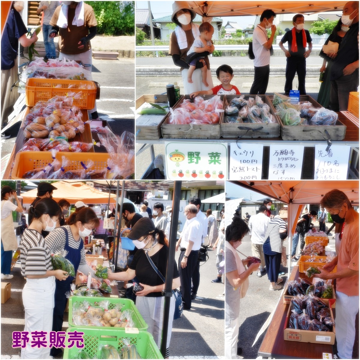 地元野菜コーナーでは、賀茂なす、三度豆、トマト、万願寺とうがらし、きゅうり、ジャガイモなどが並びました。朝採りで新鮮な野菜は、一袋100円コーナーもあり、どれもお値打ち品でした。