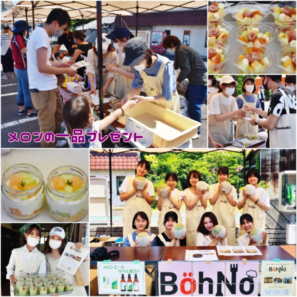 立命館大学の学生団体BohNoからは山田のメロンを使った「メロンチーズケーキ」「メロンパスタ」「メロンスープ」3品を考案、提供していただきました。彩り鮮やかでこの季節にピッタリの爽やかな仕上がりでした。早く来られた皆さんは、どの一品にしようか頭を悩まされていましたが、それぞれ先着30食限定ということもあり、アッという間にチケットがなくなりました。1ヶ月ほど前からこのメロンまつりのために、センターでも試作を重ねがんばってくれました!