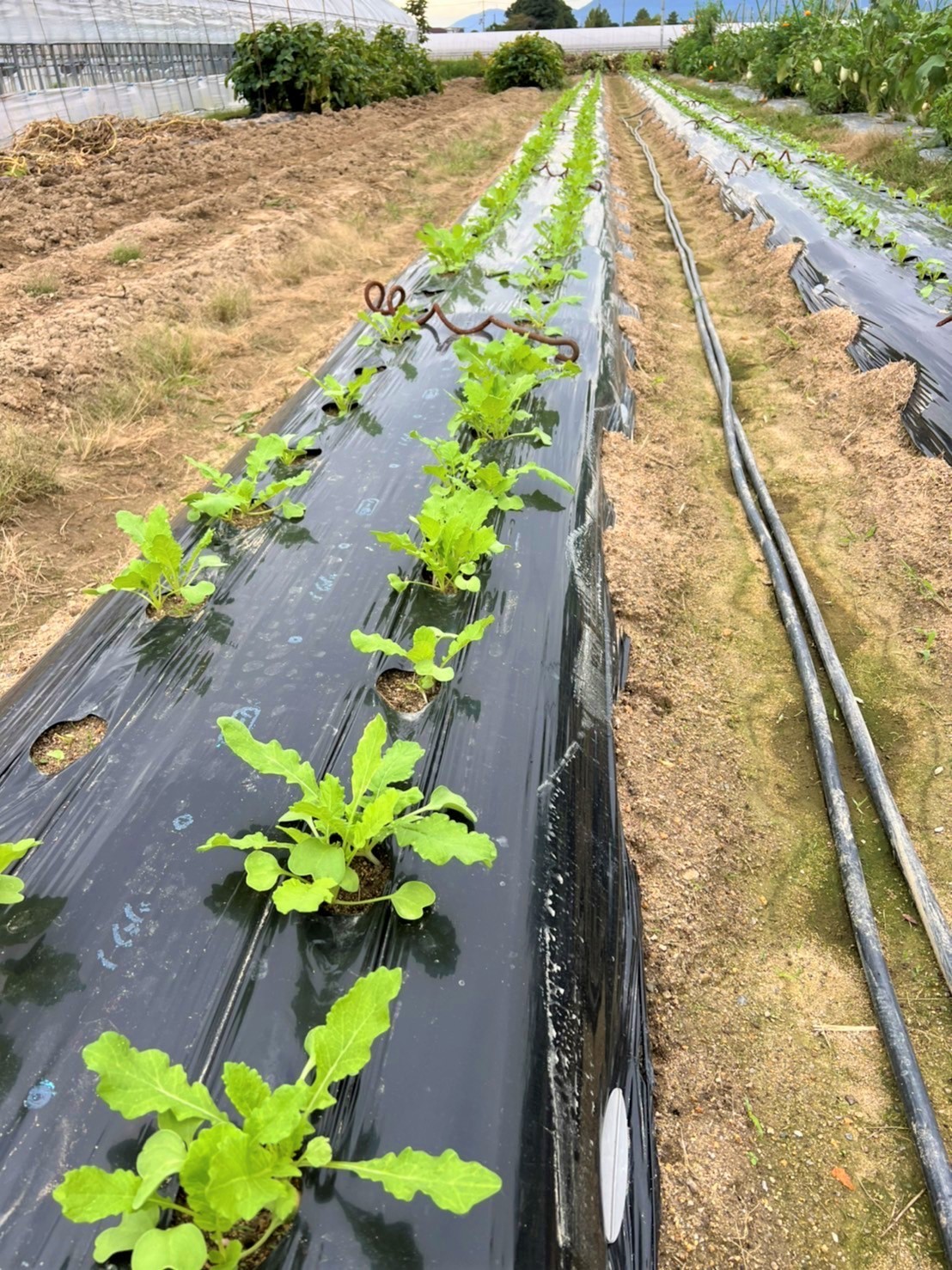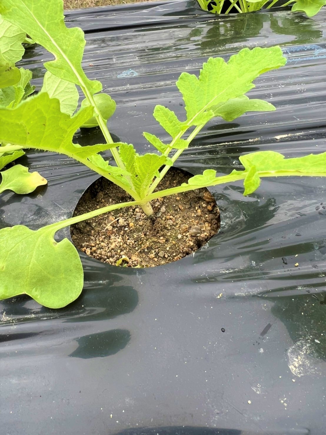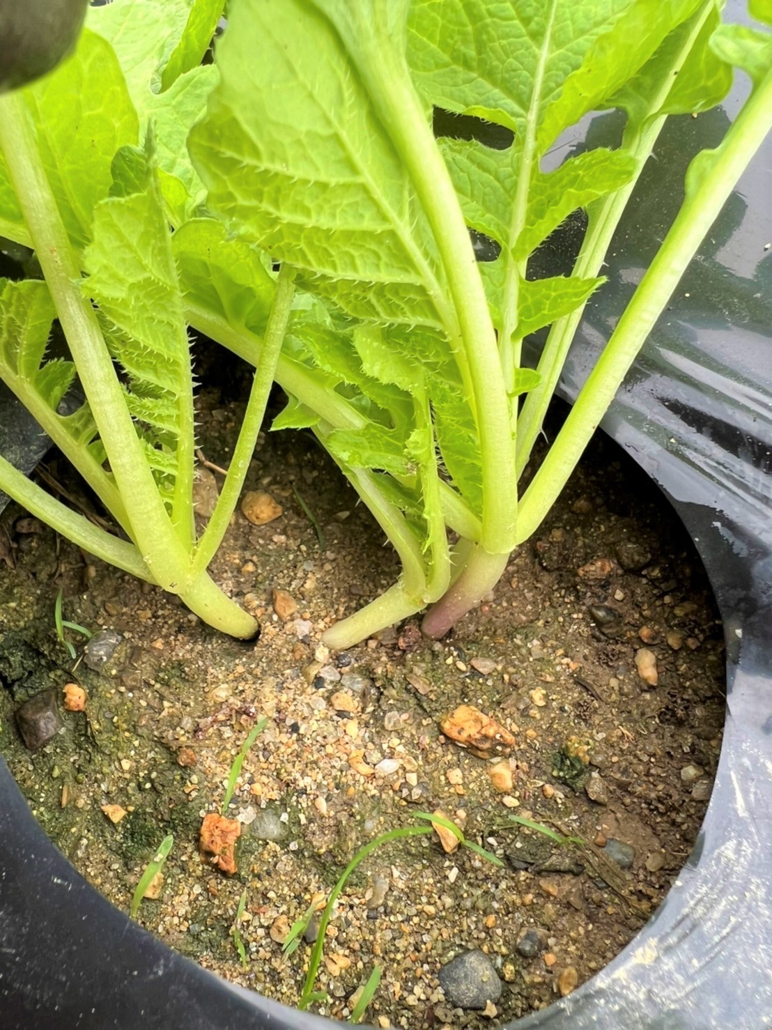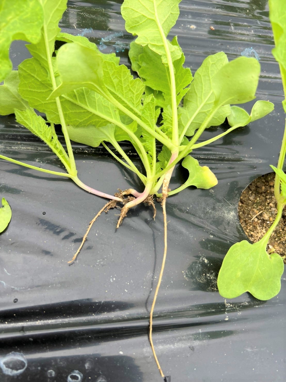 本日、間引き作業完了です! 9月24日に植えたねずみ大根、すくすく成長し、3つの中で一番元気な苗だけを残す間引き作業が行われました。 ねずみ大根は白首大根なので、間引く際には根が紫色の苗を優先的に抜きます。 紫色の根は先祖帰りとか他の花粉が混じっているとかいろいろ言われているようですが、ほんとのところは分かりません。 (先祖帰りというのはご先祖様の遺伝子が出てきてしまって、育っても違う大根になるとか!?)