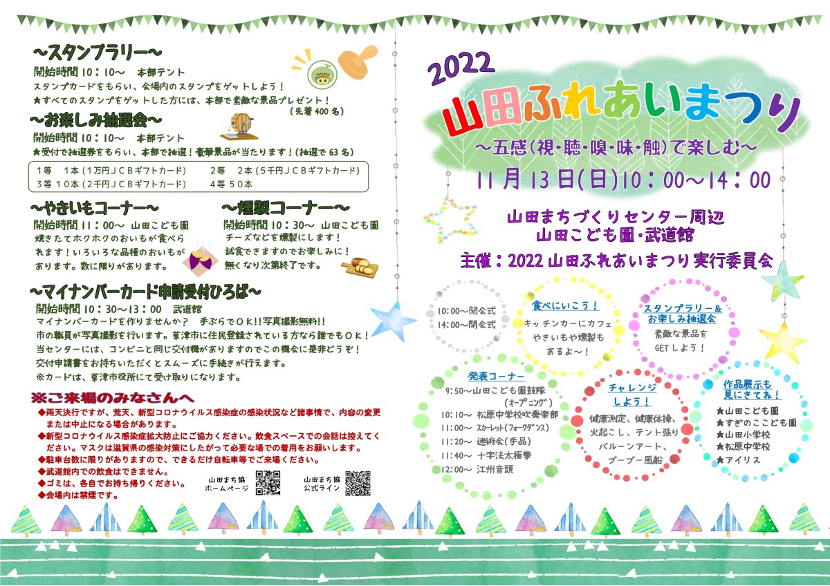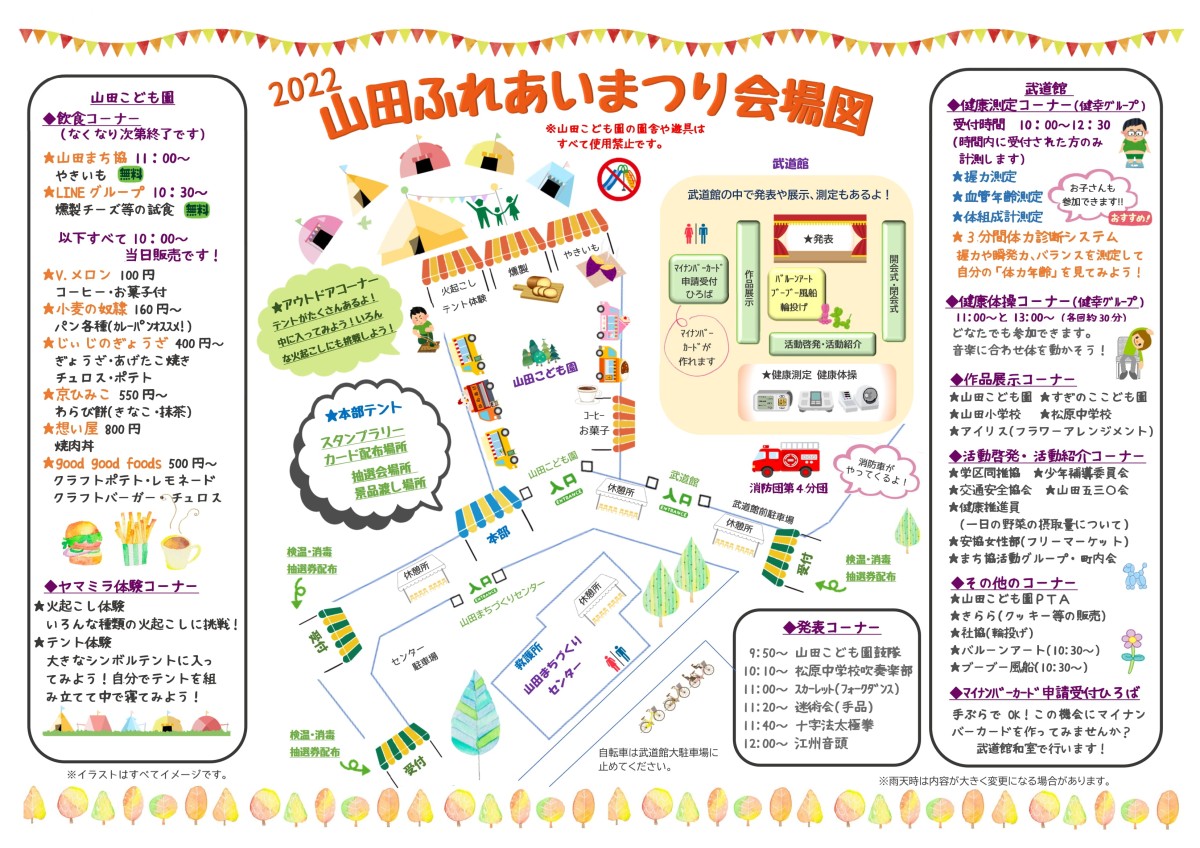 武道館では、山田こども園の鼓隊・松原中学校の吹奏楽演奏、健康測定や体力診断、輪投げやバルーンアートなど、山田こども園ではテント立てや火起こしなどのアウトドア体験など盛りだくさん!見たり、食べたり、体験したり、測定したり・・・五感で楽しむ山田ふれあいまつり!皆さんのお越しをお待ちしています!