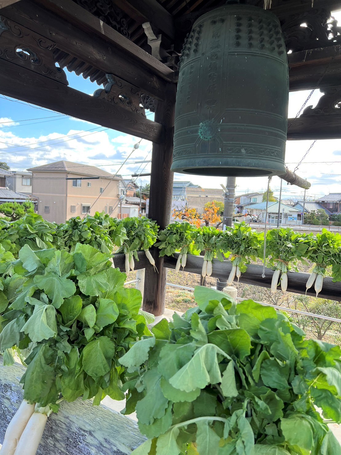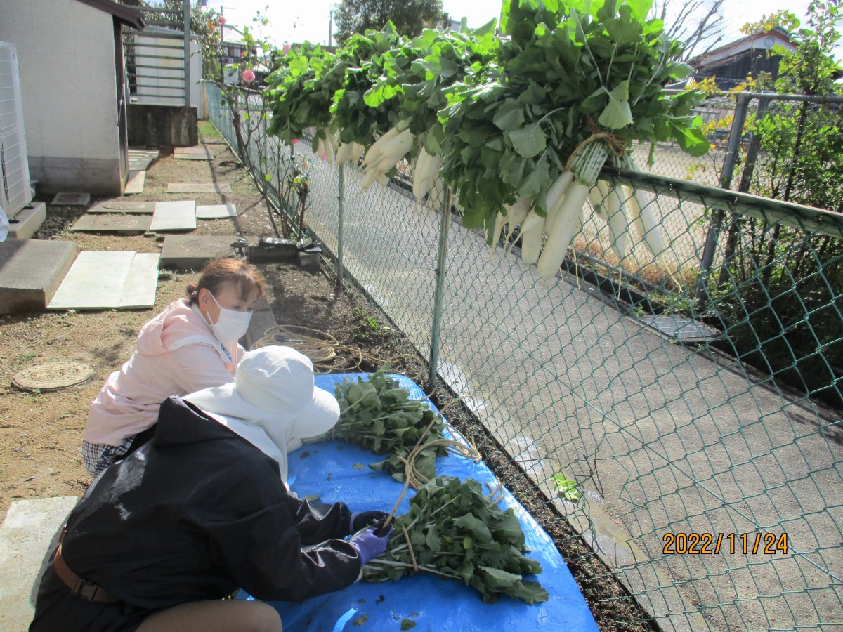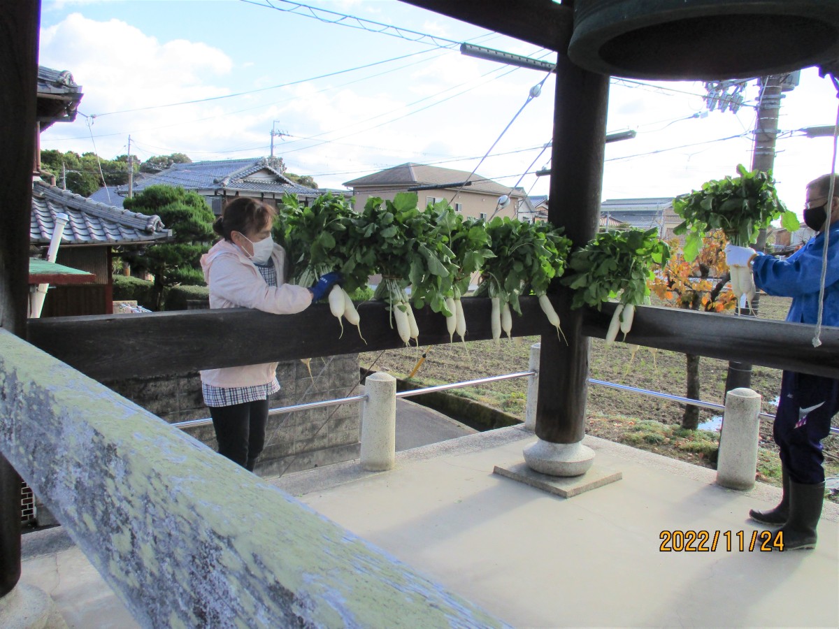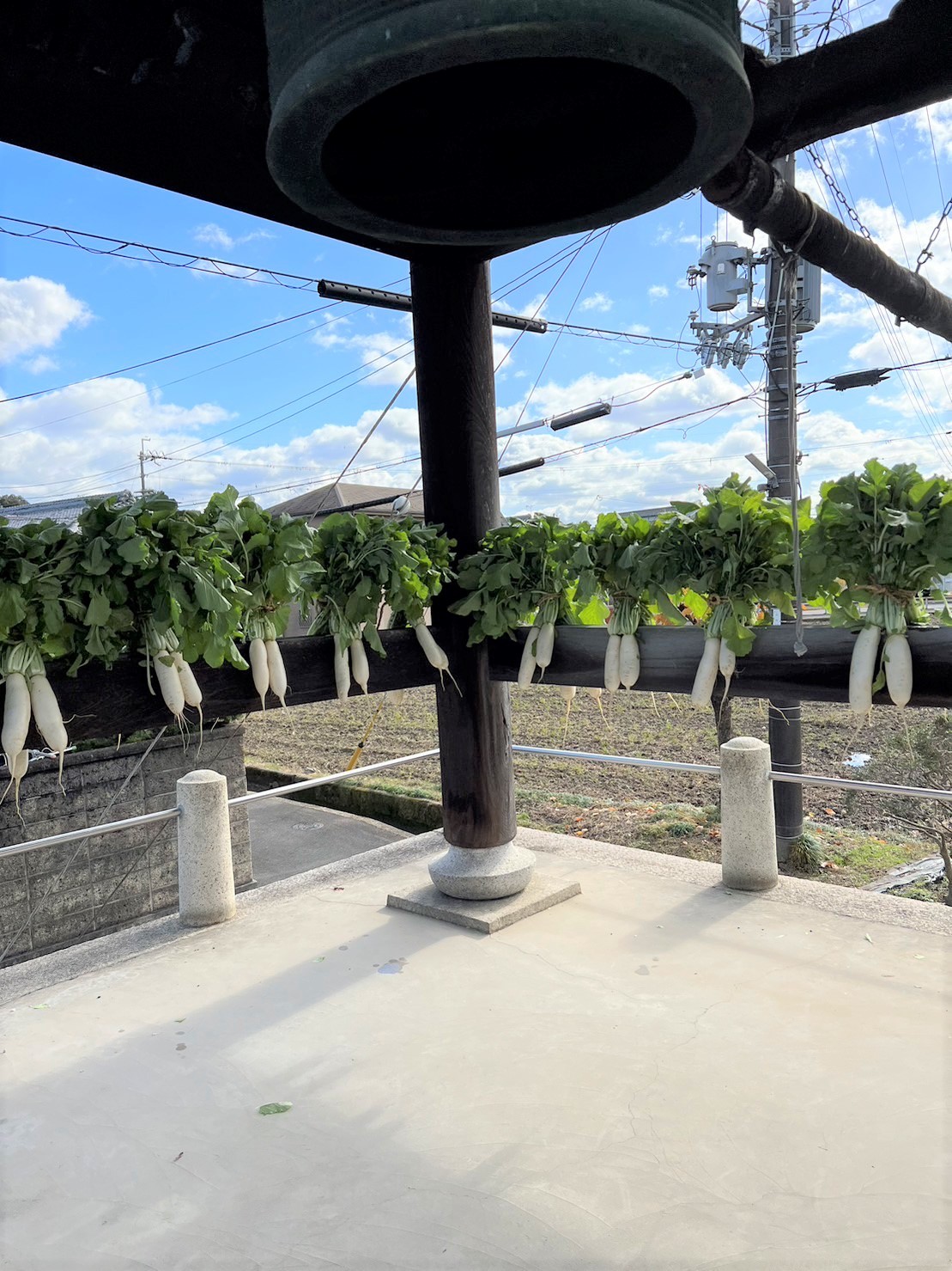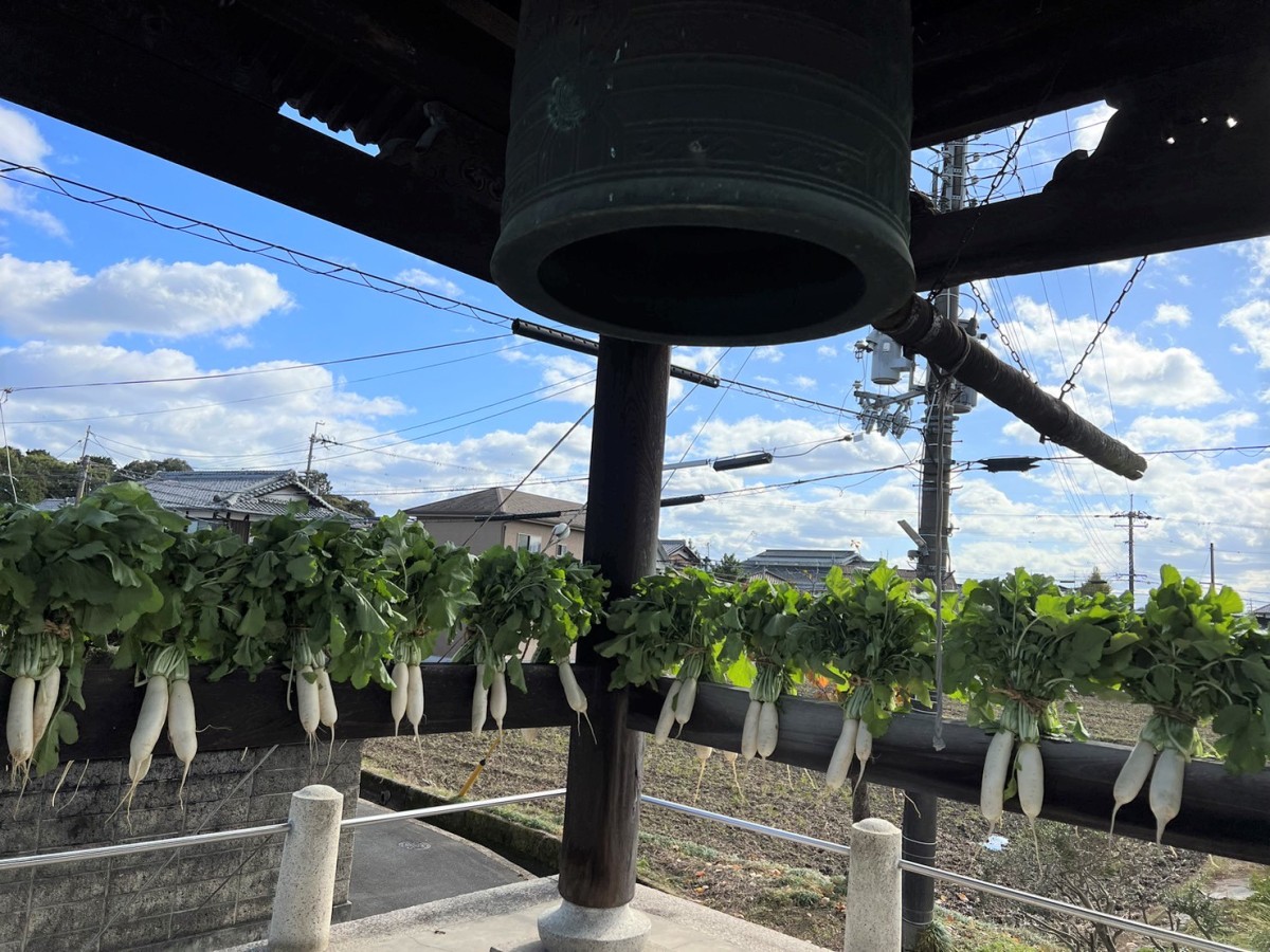 11月24日、ねずみ大根の収穫&干し作業を行いました。雨で日程がずれたため、少ない人数での開催となりましたが、お尻が丸くてかわいいねずみ大根150本をあっという間に収穫することができました。その後、まちづくりセンターへ持ち帰り、1本1本丁寧に洗います。大根の洗浄といえば冷たい水で手が凍えるイメージですが想像とは裏腹に、暖かい陽気で大根を洗う水も気持ちよく感じられました。洗い終わったねずみ大根は、先生から教わった、ほどけない結び方で4本組にしっかりまとめ、雨に濡れない場所で2週間ほど干して乾燥させます。干し場所は山田ならでは!? なんと鐘撞堂にたくさんの山田ねずみ大根が並びました!昔もこうして並べられていたようですが、今ではとても珍しくどこか懐かしさを感じる光景です。次回はいよいよたくあん漬け作業です!お楽しみに!