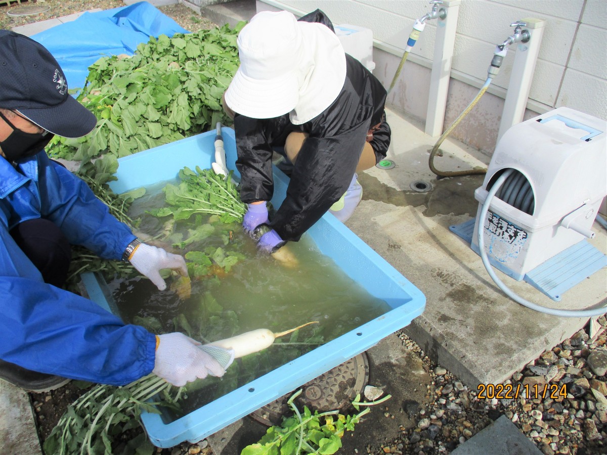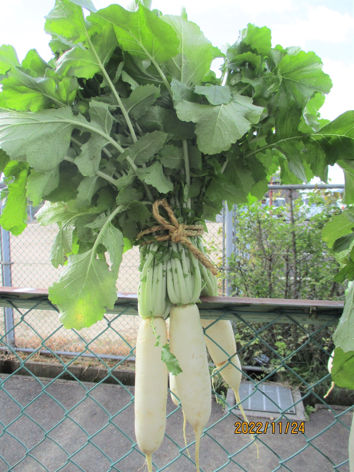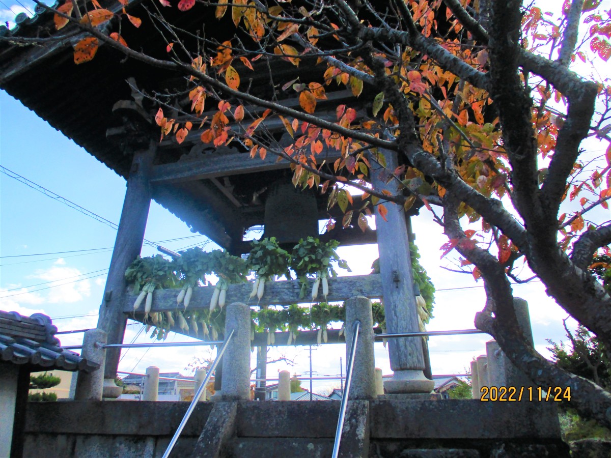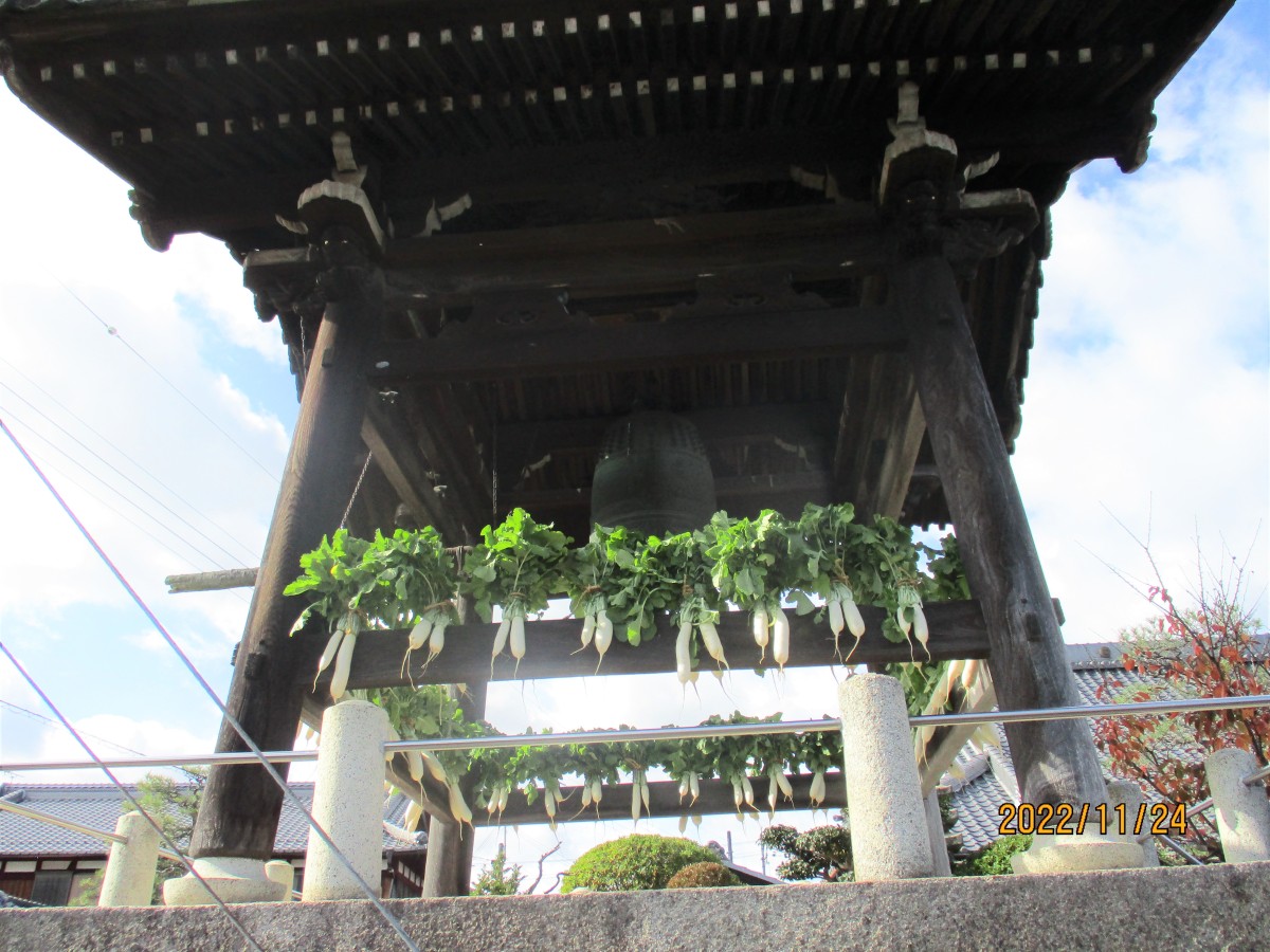 11月24日、ねずみ大根の収穫&干し作業を行いました。雨で日程がずれたため、少ない人数での開催となりましたが、お尻が丸くてかわいいねずみ大根150本をあっという間に収穫することができました。その後、まちづくりセンターへ持ち帰り、1本1本丁寧に洗います。大根の洗浄といえば冷たい水で手が凍えるイメージですが想像とは裏腹に、暖かい陽気で大根を洗う水も気持ちよく感じられました。洗い終わったねずみ大根は、先生から教わった、ほどけない結び方で4本組にしっかりまとめ、雨に濡れない場所で2週間ほど干して乾燥させます。干し場所は山田ならでは!? なんと鐘撞堂にたくさんの山田ねずみ大根が並びました!昔もこうして並べられていたようですが、今ではとても珍しくどこか懐かしさを感じる光景です。次回はいよいよたくあん漬け作業です!お楽しみに!