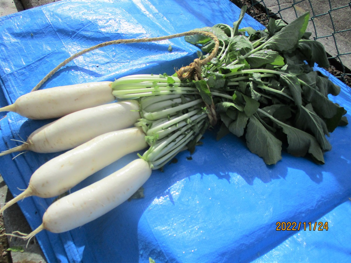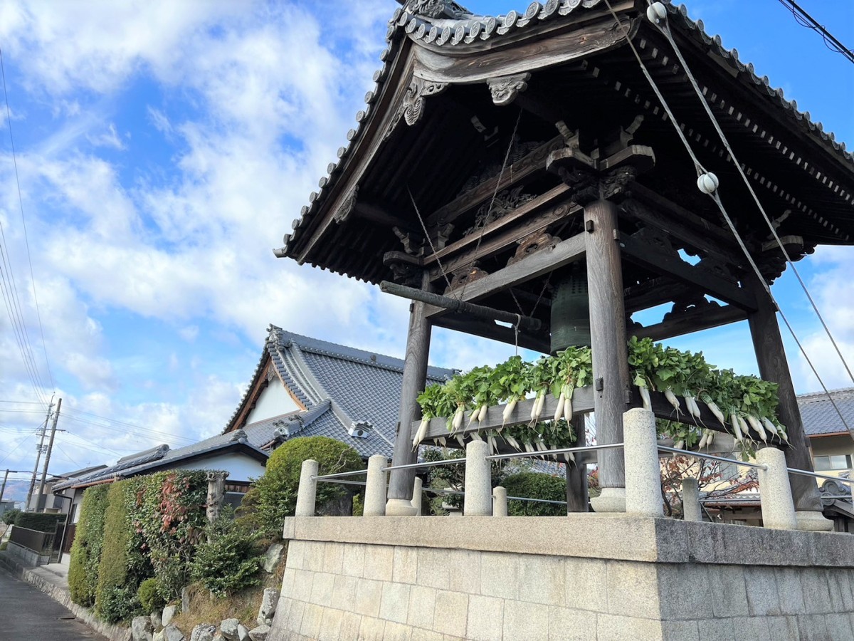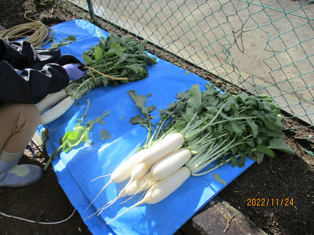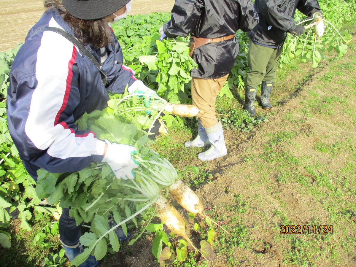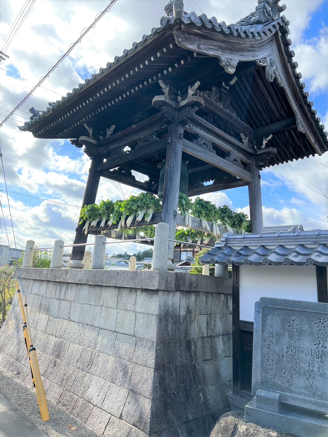 11月24日、ねずみ大根の収穫&干し作業を行いました。雨で日程がずれたため、少ない人数での開催となりましたが、お尻が丸くてかわいいねずみ大根150本をあっという間に収穫することができました。その後、まちづくりセンターへ持ち帰り、1本1本丁寧に洗います。大根の洗浄といえば冷たい水で手が凍えるイメージですが想像とは裏腹に、暖かい陽気で大根を洗う水も気持ちよく感じられました。洗い終わったねずみ大根は、先生から教わった、ほどけない結び方で4本組にしっかりまとめ、雨に濡れない場所で2週間ほど干して乾燥させます。干し場所は山田ならでは!? なんと鐘撞堂にたくさんの山田ねずみ大根が並びました!昔もこうして並べられていたようですが、今ではとても珍しくどこか懐かしさを感じる光景です。次回はいよいよたくあん漬け作業です!お楽しみに!