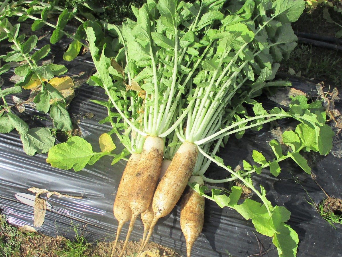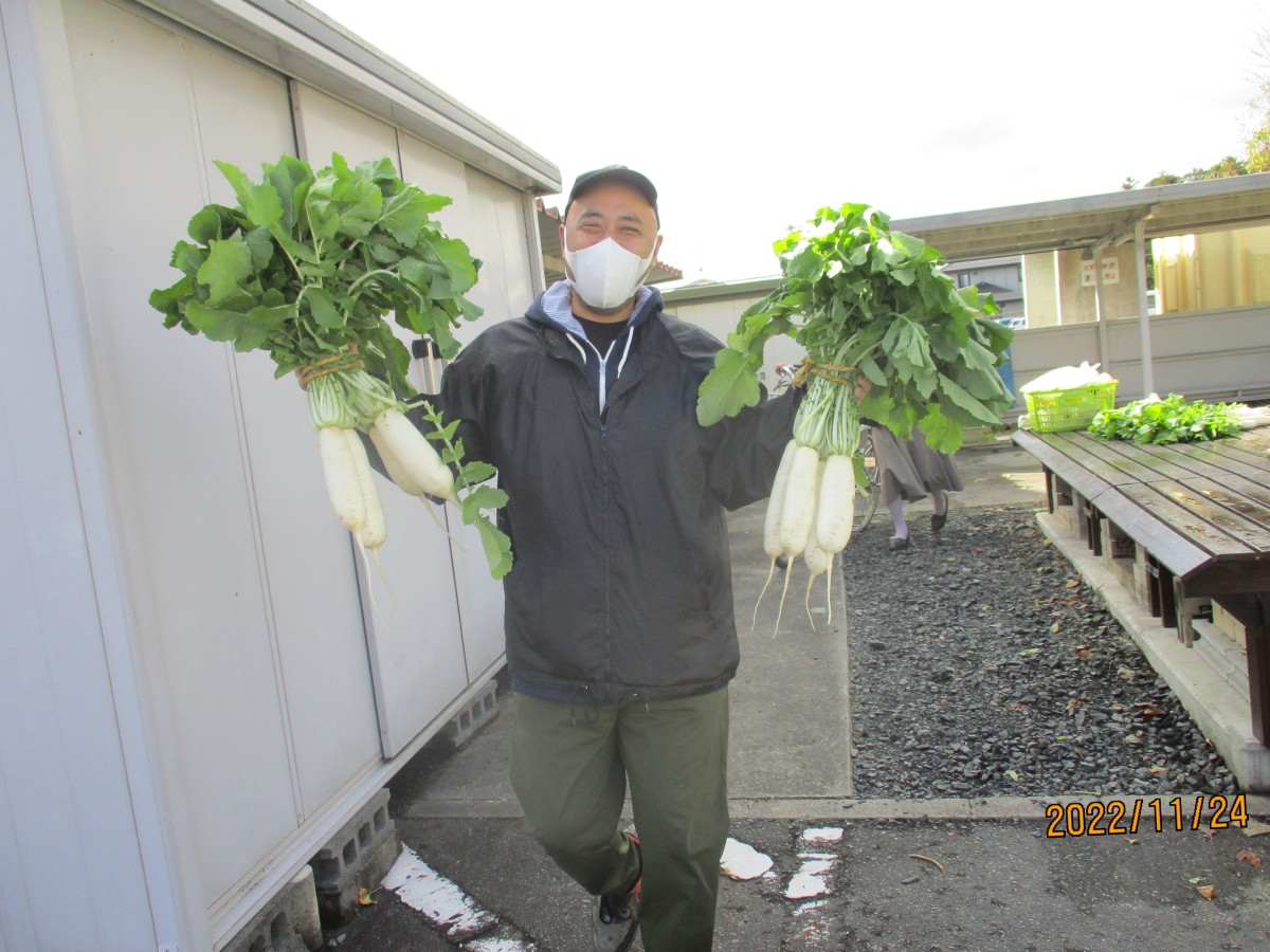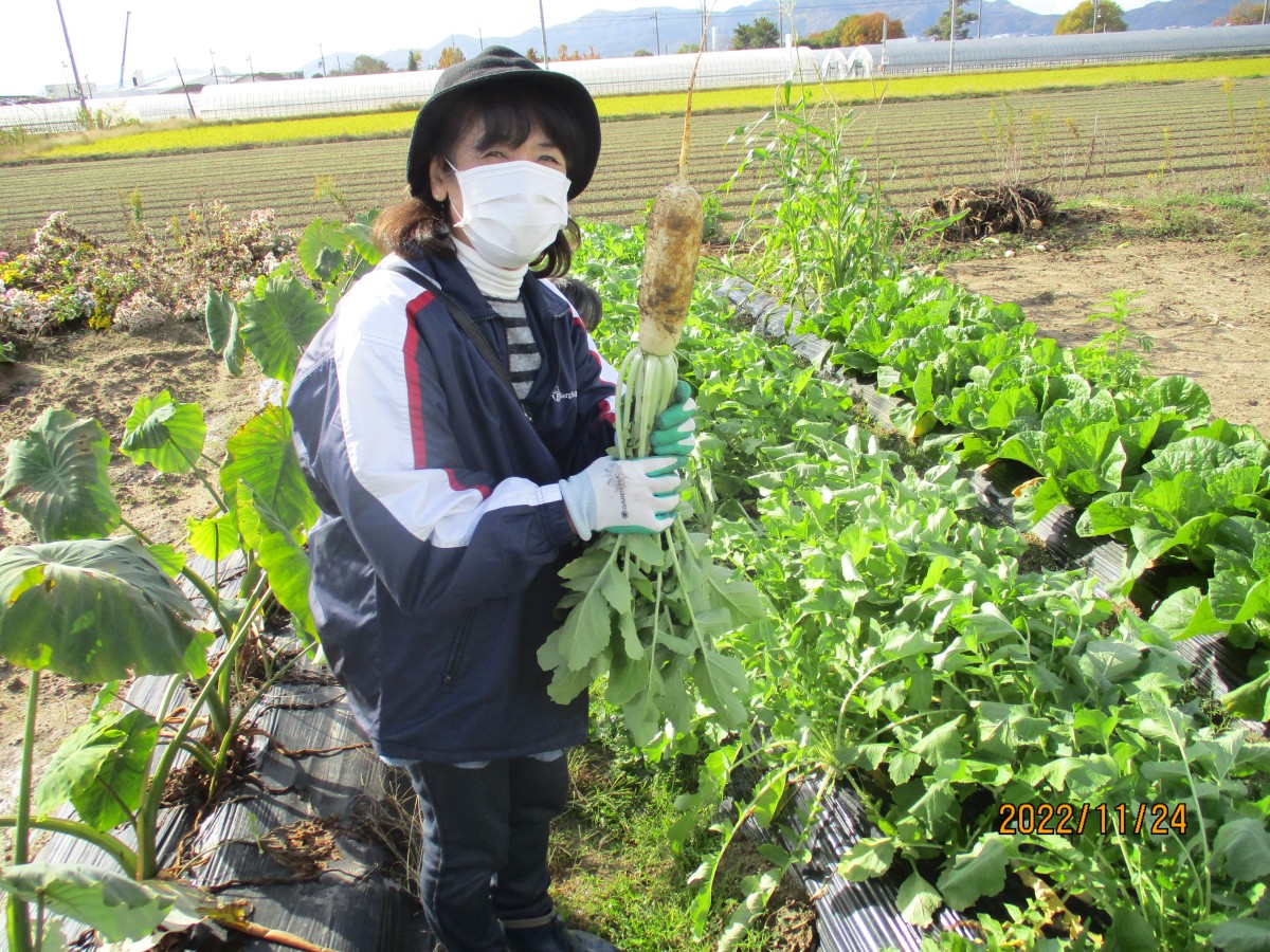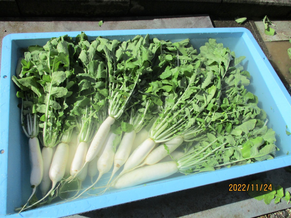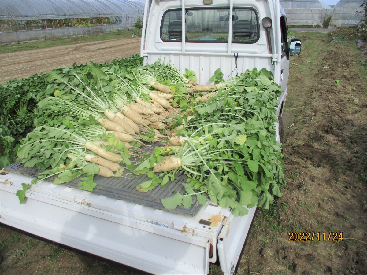 11月24日、ねずみ大根の収穫&干し作業を行いました。雨で日程がずれたため、少ない人数での開催となりましたが、お尻が丸くてかわいいねずみ大根150本をあっという間に収穫することができました。その後、まちづくりセンターへ持ち帰り、1本1本丁寧に洗います。大根の洗浄といえば冷たい水で手が凍えるイメージですが想像とは裏腹に、暖かい陽気で大根を洗う水も気持ちよく感じられました。洗い終わったねずみ大根は、先生から教わった、ほどけない結び方で4本組にしっかりまとめ、雨に濡れない場所で2週間ほど干して乾燥させます。干し場所は山田ならでは!? なんと鐘撞堂にたくさんの山田ねずみ大根が並びました!昔もこうして並べられていたようですが、今ではとても珍しくどこか懐かしさを感じる光景です。次回はいよいよたくあん漬け作業です!お楽しみに!