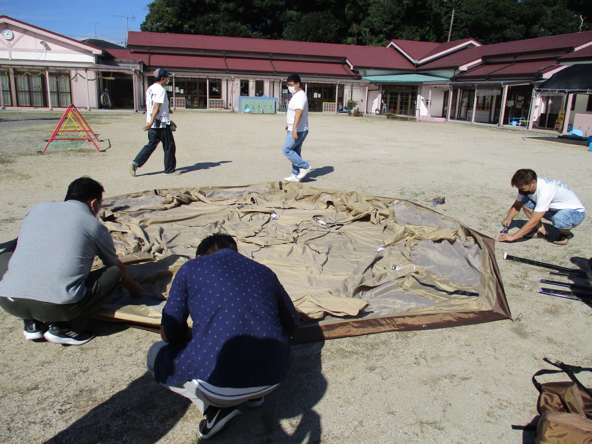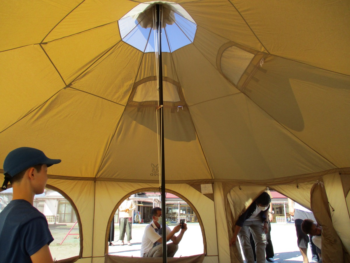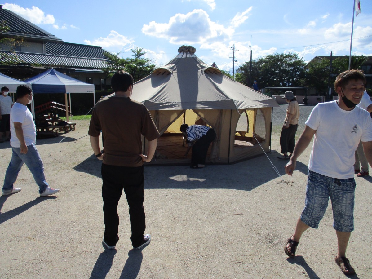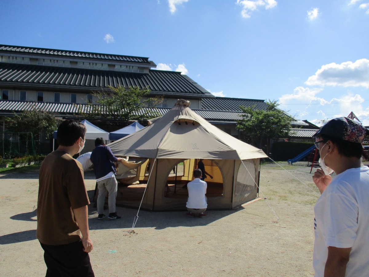 大人もテンションが上がる八角形ののベルテント!八つの面それぞれが入口になっていて見晴らしがよく、子どもたちが喜びそうなテントに盛り上がりました。皆にお披露目できる日が楽しみです!