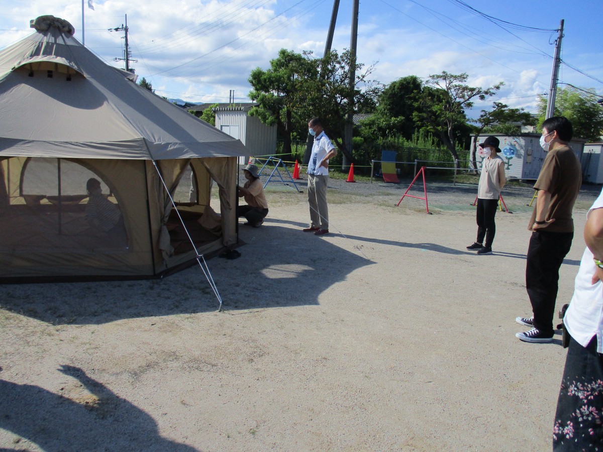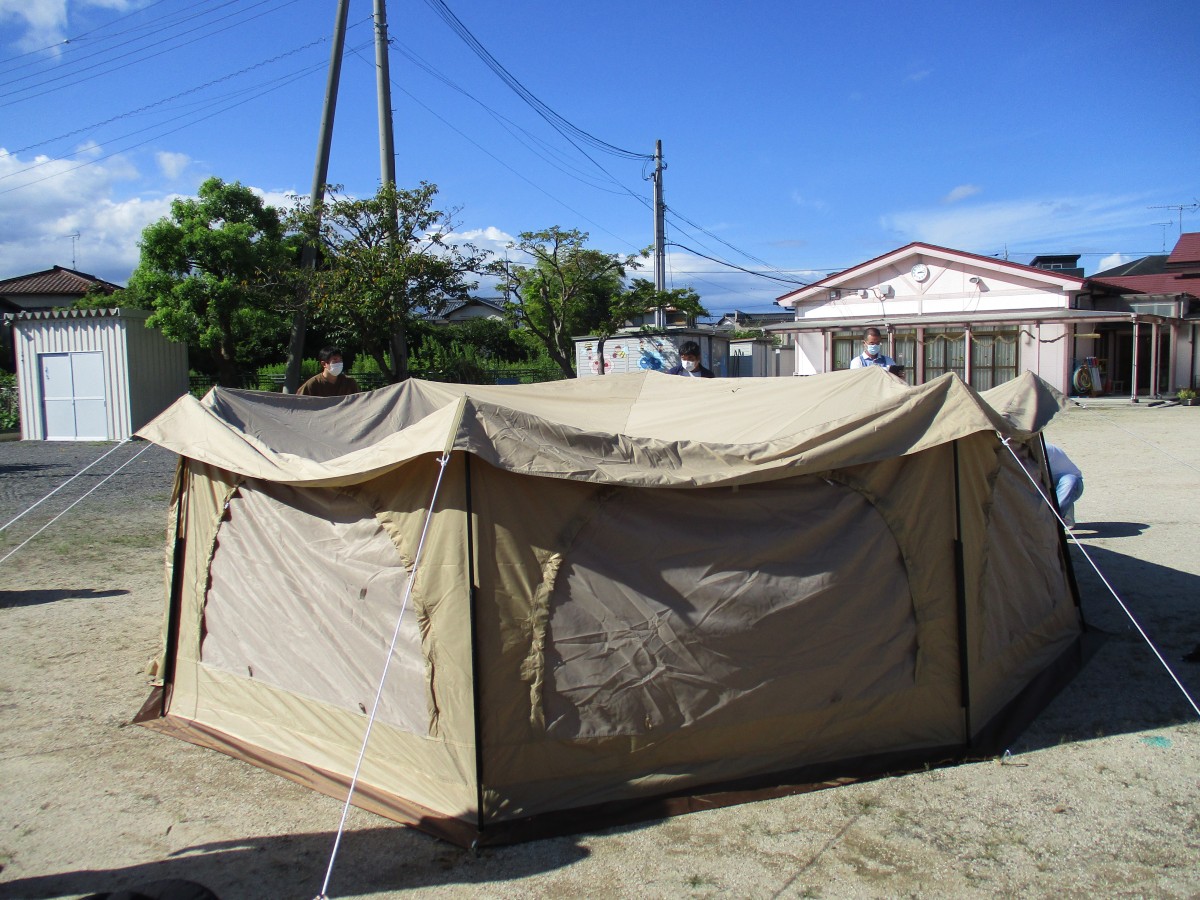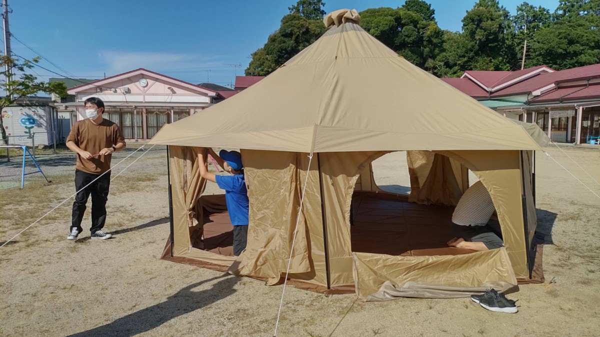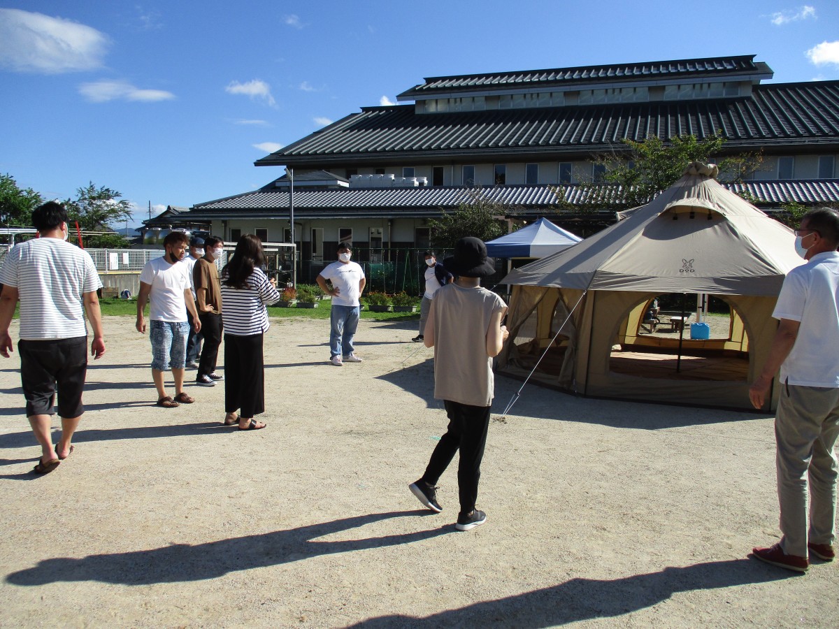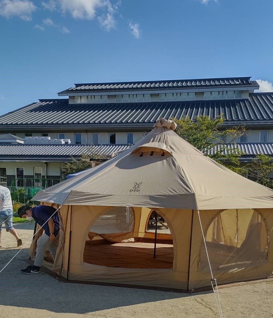 大人もテンションが上がる八角形ののベルテント!八つの面それぞれが入口になっていて見晴らしがよく、子どもたちが喜びそうなテントに盛り上がりました。皆にお披露目できる日が楽しみです!