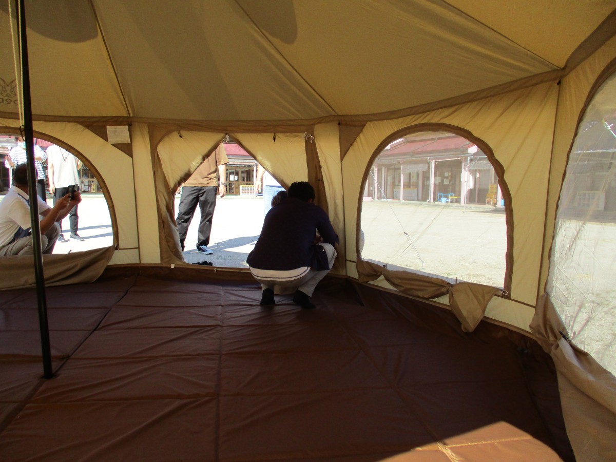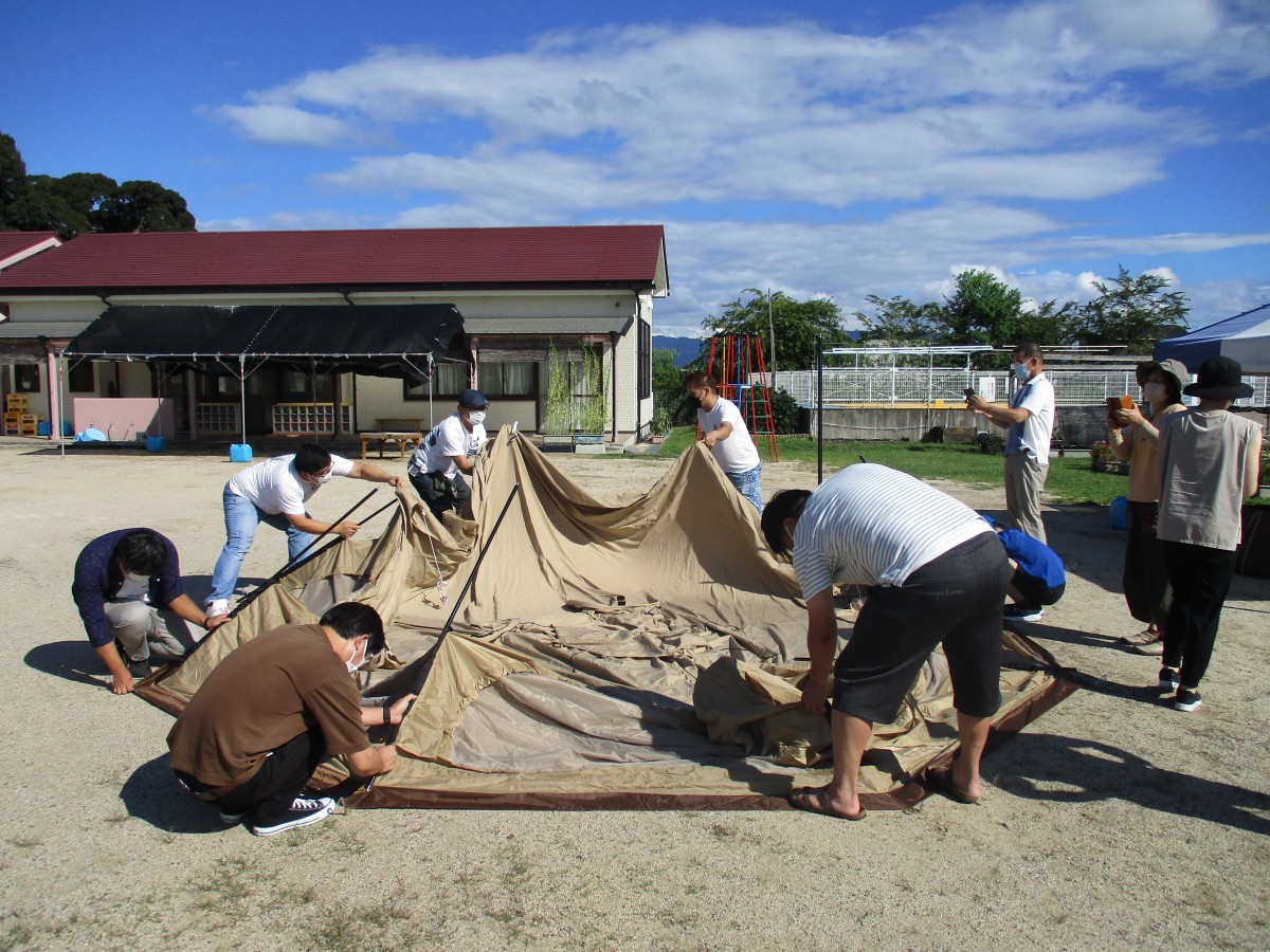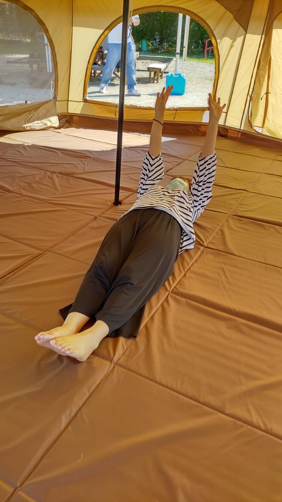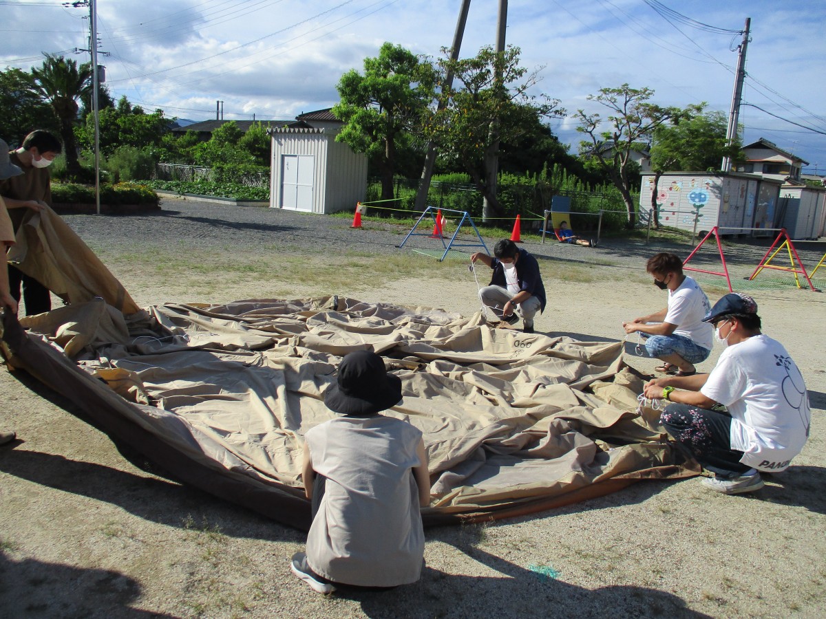 大人もテンションが上がる八角形ののベルテント!八つの面それぞれが入口になっていて見晴らしがよく、子どもたちが喜びそうなテントに盛り上がりました。皆にお披露目できる日が楽しみです!