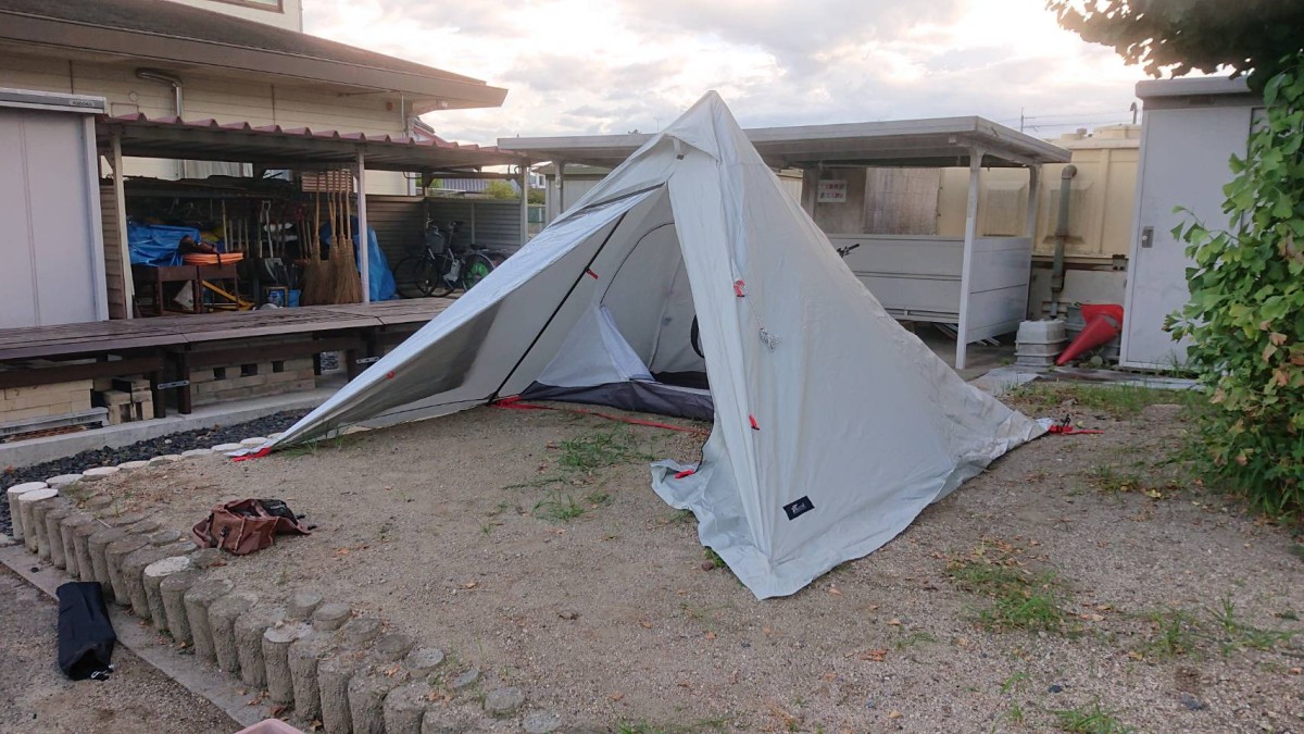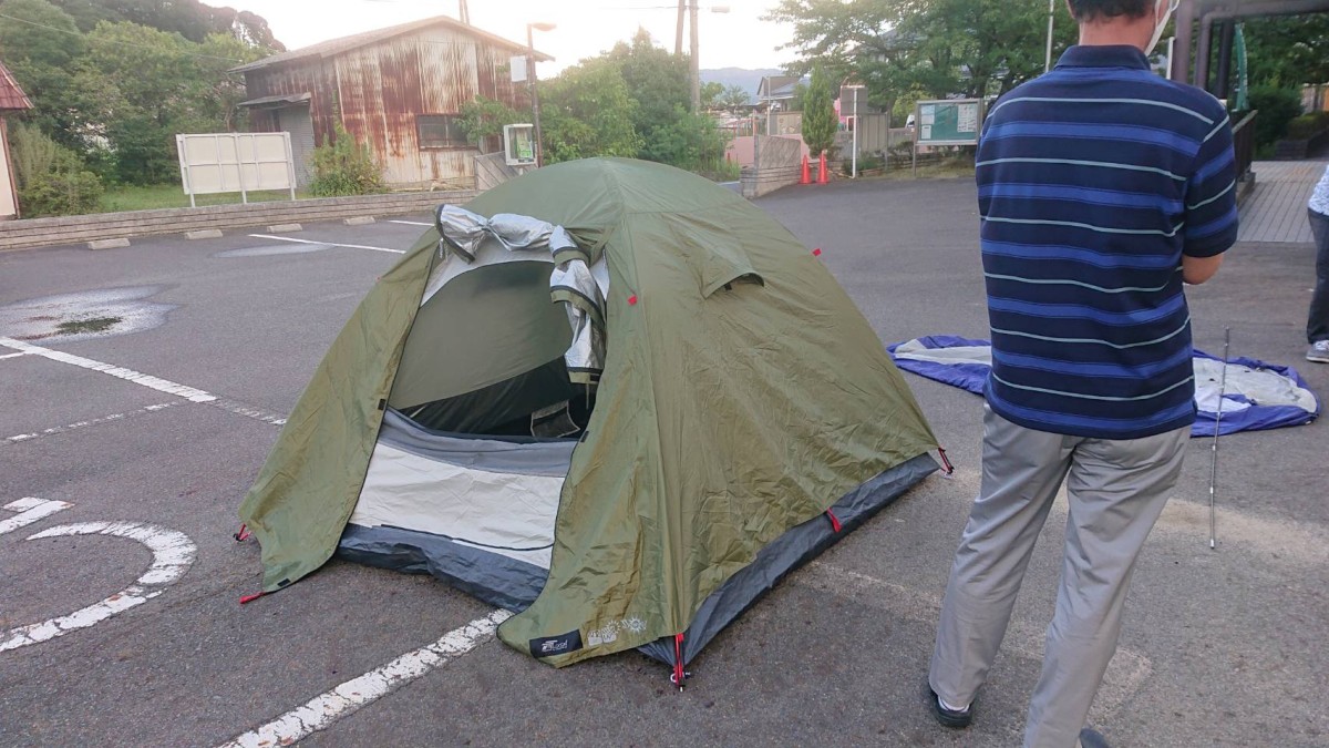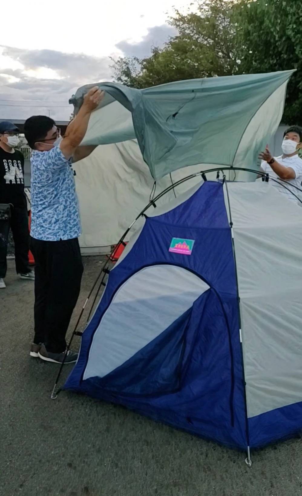 打ち合わせの後、今後のテント購入に向けて、一度個人持ちのテントを立ててみました。どの形が使いやすいのか、子どもたちが自分で立てやすいのかなど確認してみました。