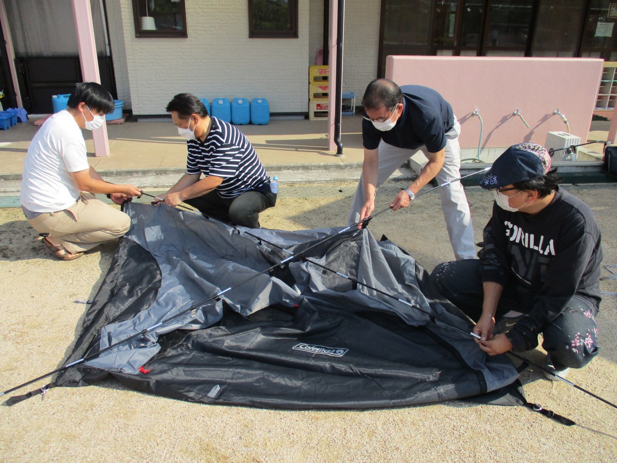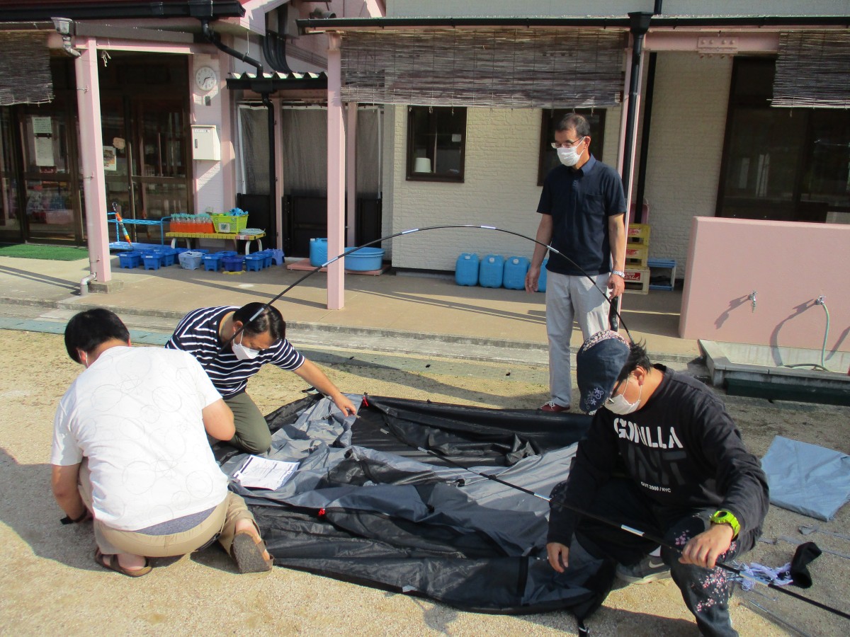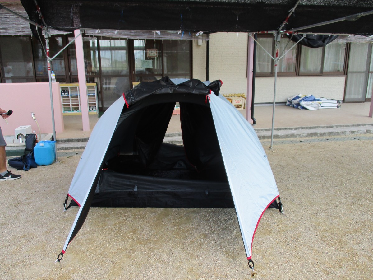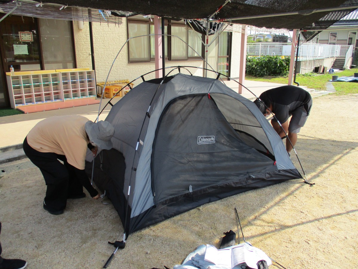 アウトドアチーム 小テント購入! シンボルテントの次は小テント!実際子どもたちが自分で立てて自分で片付けやすいのはどんなテントだろう、目的のテント泊にふさわしいテントってどんなテントだろうと悩みながらこれに決めました!2チームに分かれて手順書を読みながら立ててみました。中は真っ暗ですが、夏の紫外線をカットしてくれるすぐれもの!ふれあいまつりで子どもたちが立ててくれるのが楽しみです!