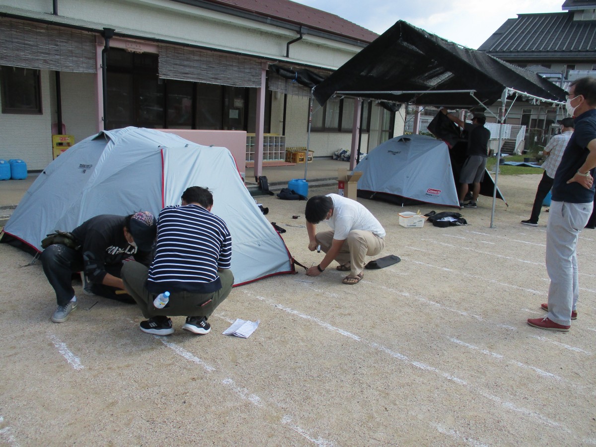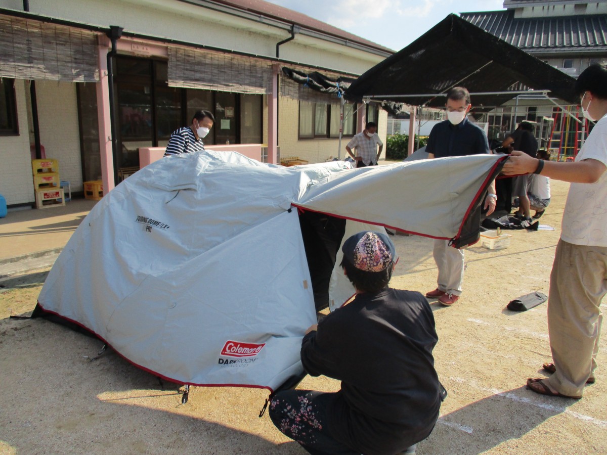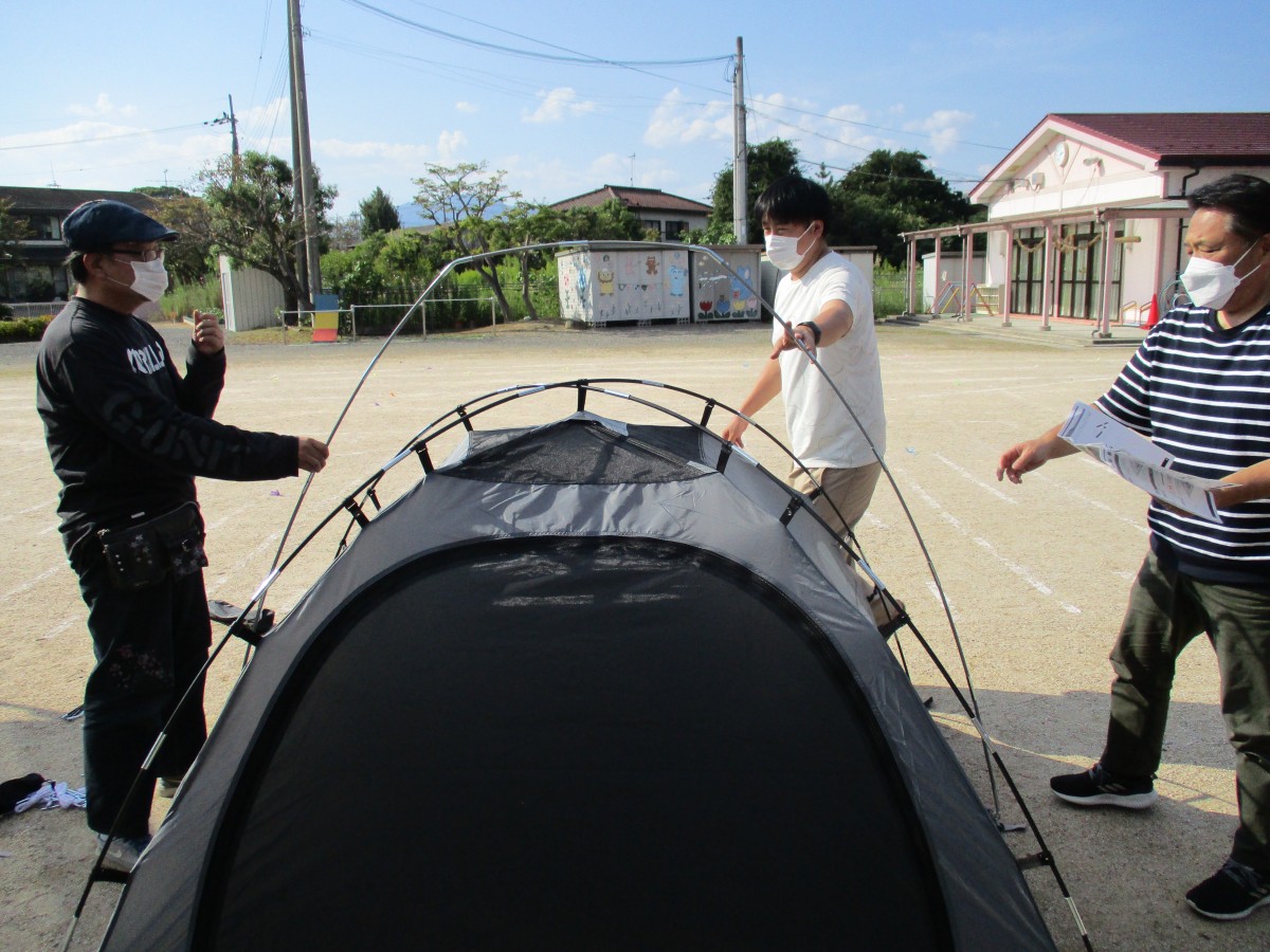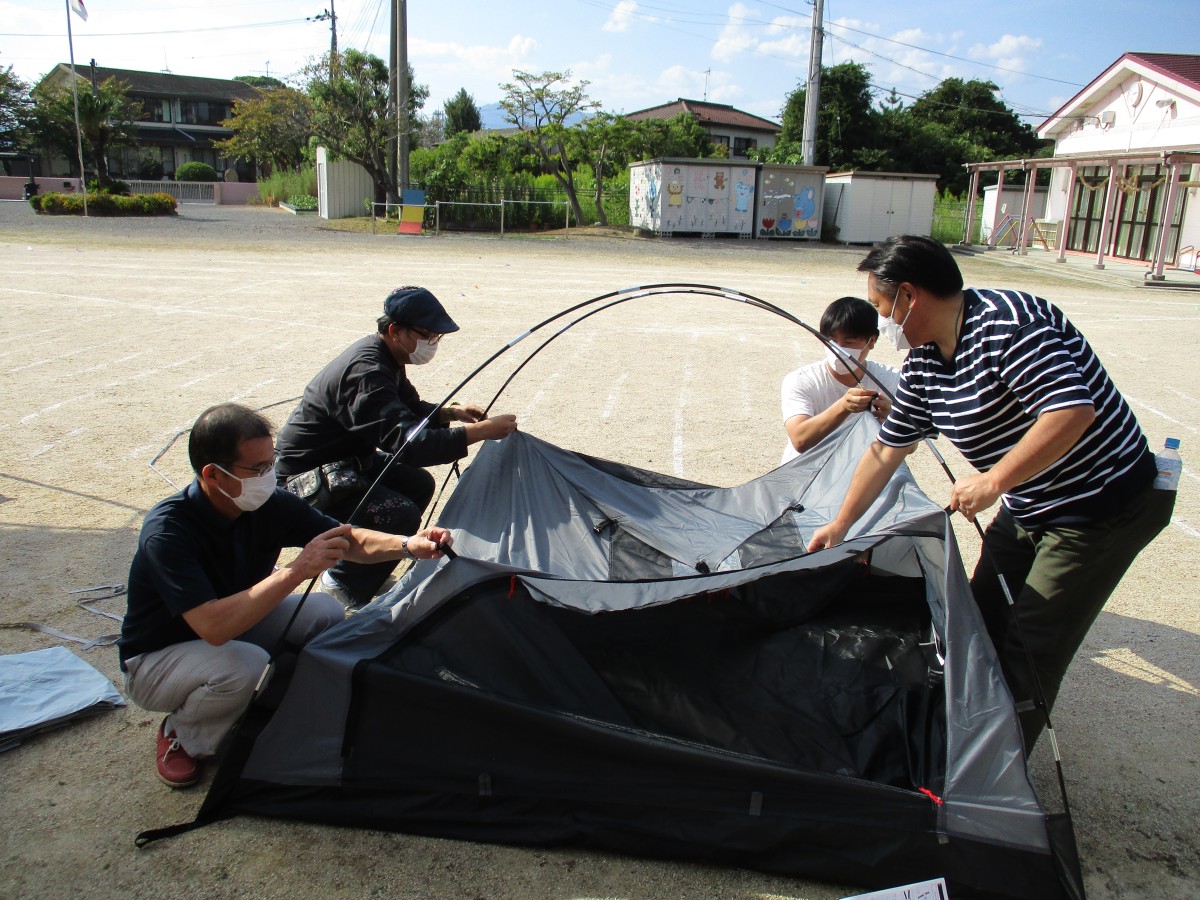 アウトドアチーム 小テント購入! シンボルテントの次は小テント!実際子どもたちが自分で立てて自分で片付けやすいのはどんなテントだろう、目的のテント泊にふさわしいテントってどんなテントだろうと悩みながらこれに決めました!2チームに分かれて手順書を読みながら立ててみました。中は真っ暗ですが、夏の紫外線をカットしてくれるすぐれもの!ふれあいまつりで子どもたちが立ててくれるのが楽しみです!