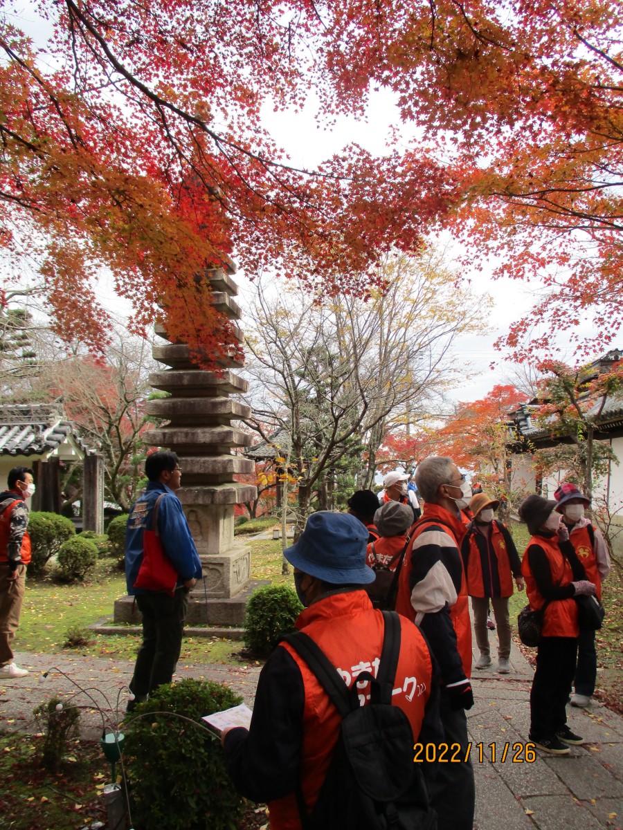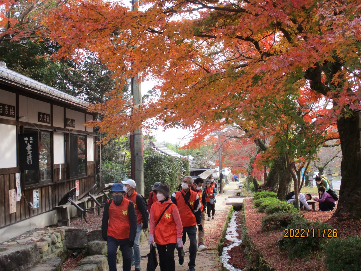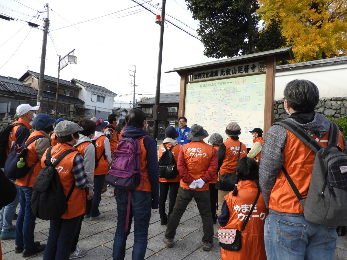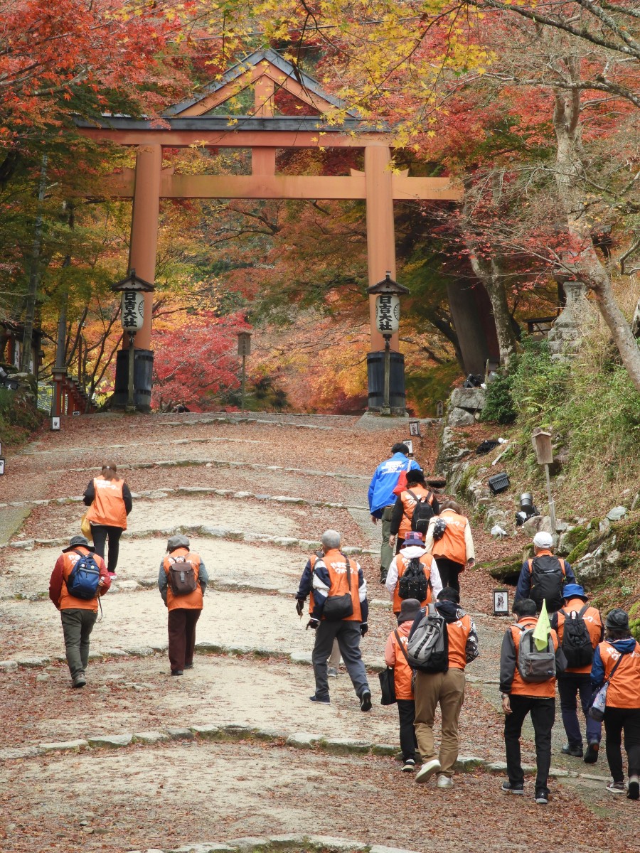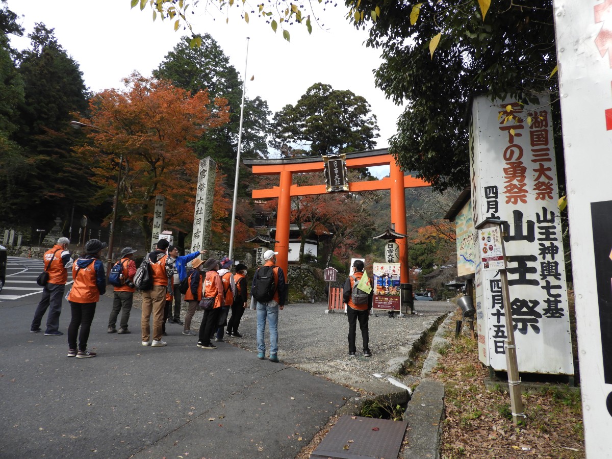11月26日爽やかな天候に恵まれた中、第2回やまだウォークを開催することが出来ました。センターから大津市坂本までバスで移動後、国の重要伝統的建造物群保存地区を歴史を味わい楽しんできました。出発前、坂本地区をこよなく愛するボランティアガイドさんから、坂本界隈の歴史のレクチャーを受けた後、立ち寄った「旧竹林院」「日吉大社」「西教寺」までの道のりを神仏習合や戦国武将などまさにタイムスリップしたような感覚で歴史を味わいながらのウォーキングは参加者も興味をそそられた様子でした。距離は4Kmと意外と短いわりには上り坂が多い中、小学生から年配の方々全員が気持ちの良い汗をかく事ができました。晩秋の中、歴史ある門前町と赤や黄に染まった木々の景色の中で身も心も清められたまち歩きとなりました。皆さんお疲れさまでした。