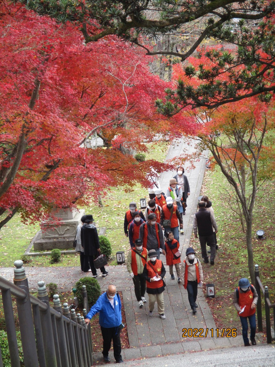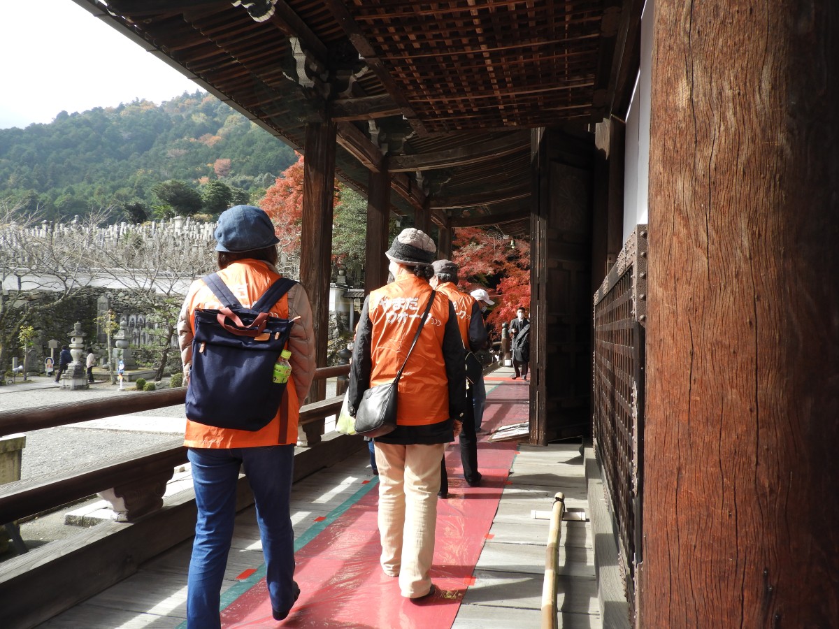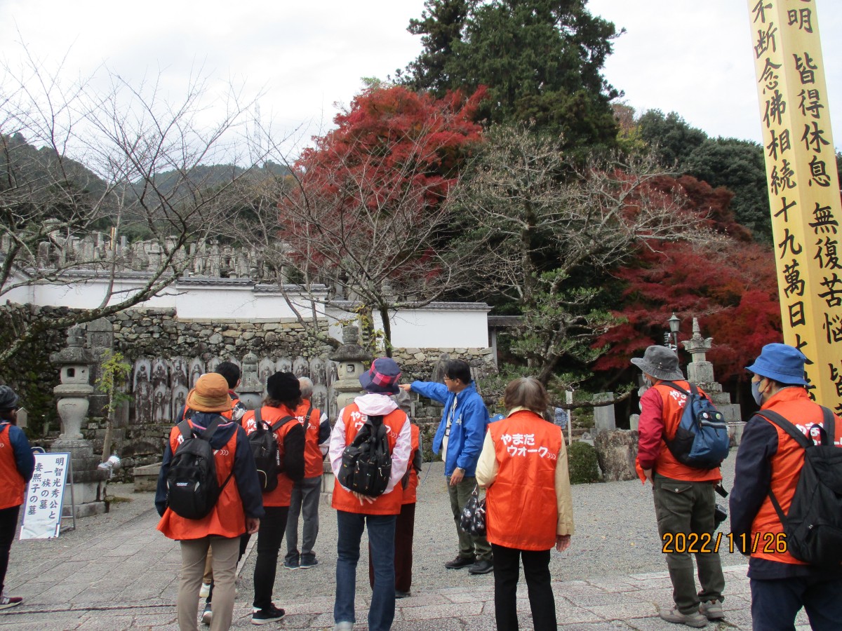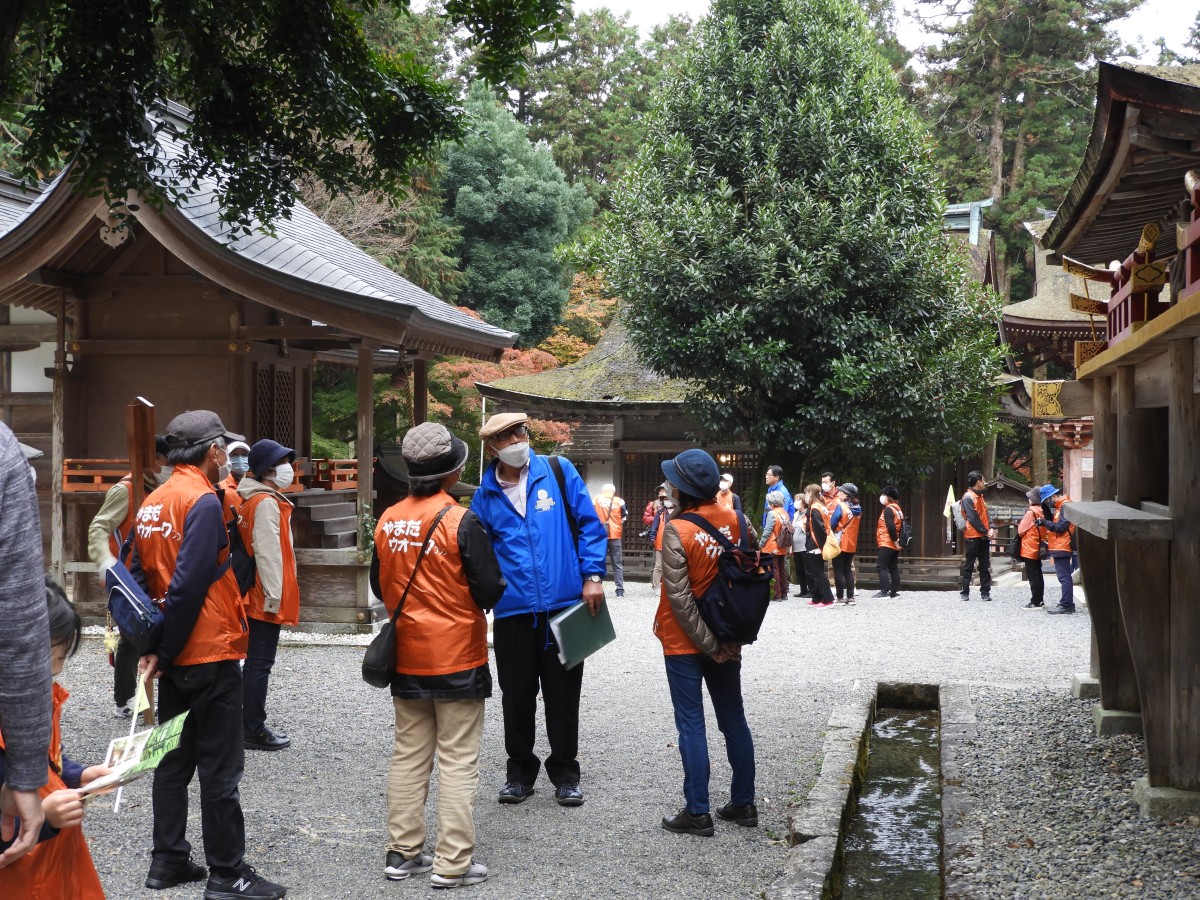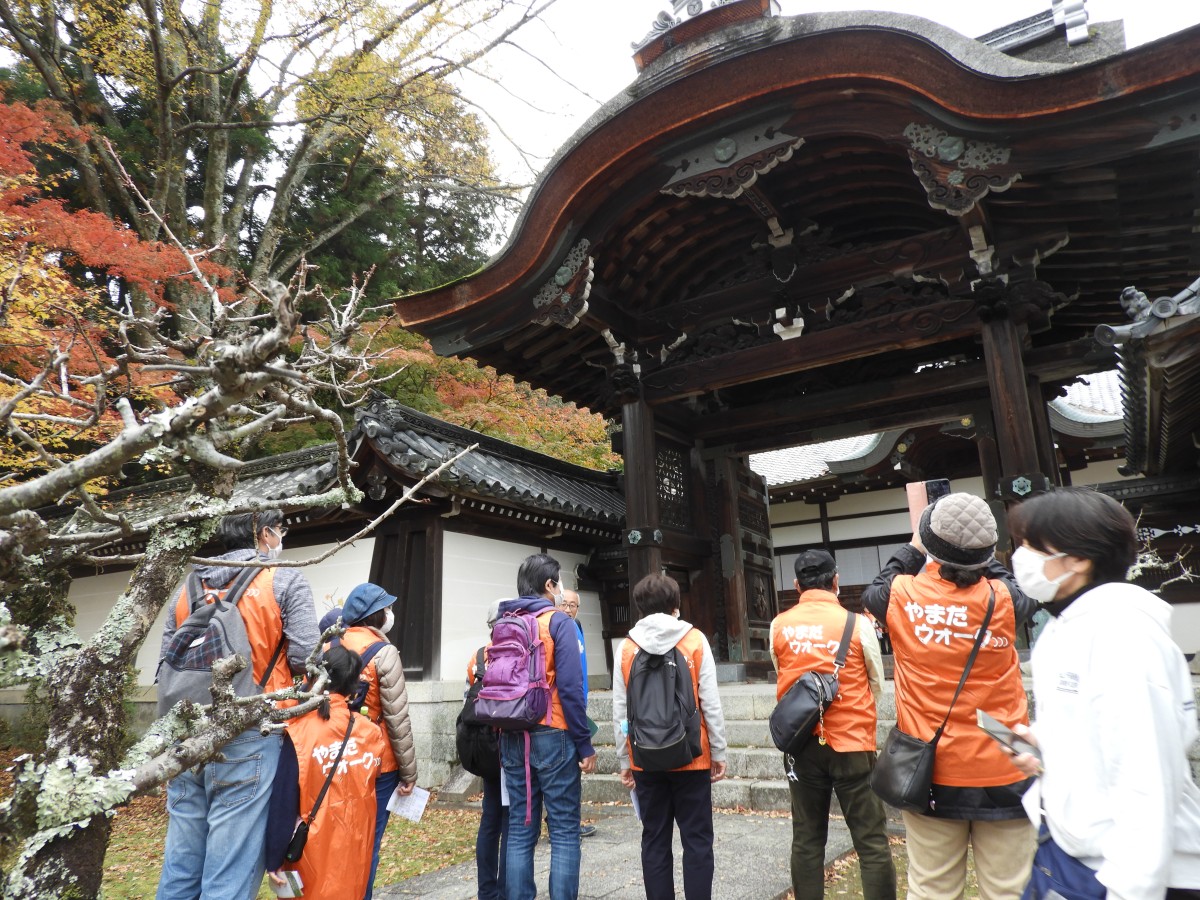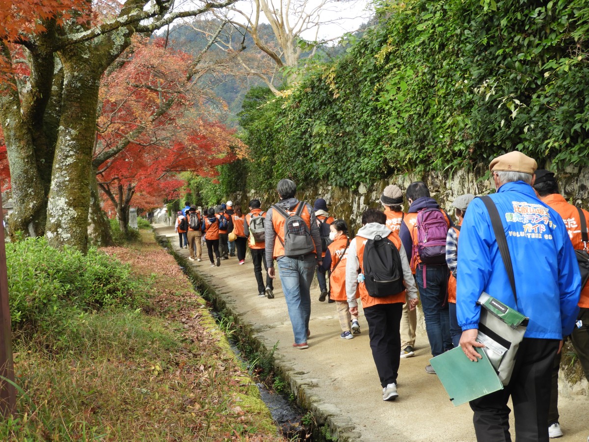11月26日爽やかな天候に恵まれた中、第2回やまだウォークを開催することが出来ました。センターから大津市坂本までバスで移動後、国の重要伝統的建造物群保存地区を歴史を味わい楽しんできました。出発前、坂本地区をこよなく愛するボランティアガイドさんから、坂本界隈の歴史のレクチャーを受けた後、立ち寄った「旧竹林院」「日吉大社」「西教寺」までの道のりを神仏習合や戦国武将などまさにタイムスリップしたような感覚で歴史を味わいながらのウォーキングは参加者も興味をそそられた様子でした。距離は4Kmと意外と短いわりには上り坂が多い中、小学生から年配の方々全員が気持ちの良い汗をかく事ができました。晩秋の中、歴史ある門前町と赤や黄に染まった木々の景色の中で身も心も清められたまち歩きとなりました。皆さんお疲れさまでした。