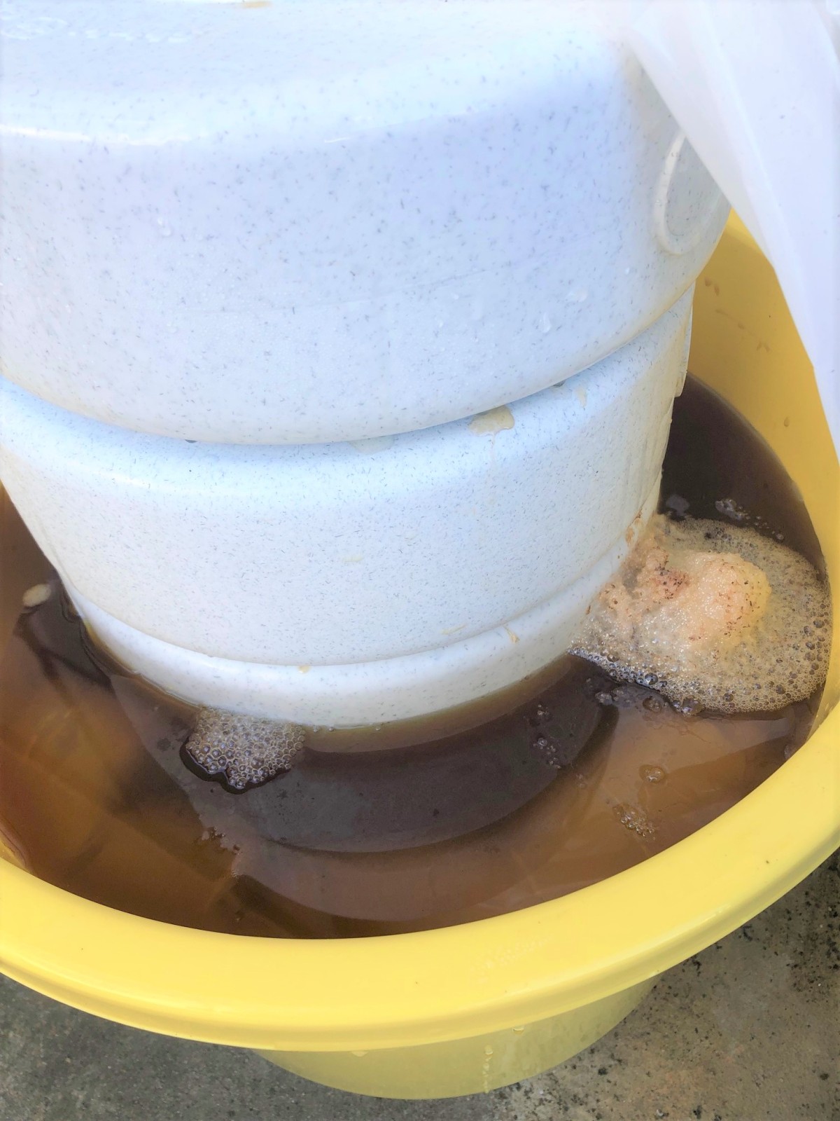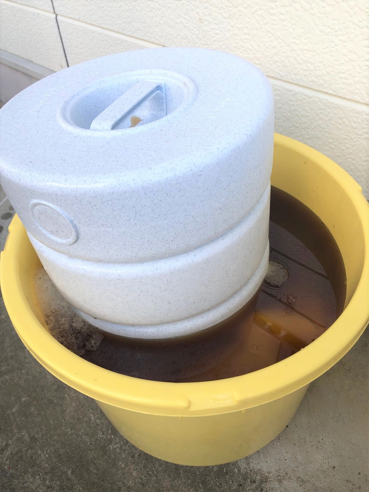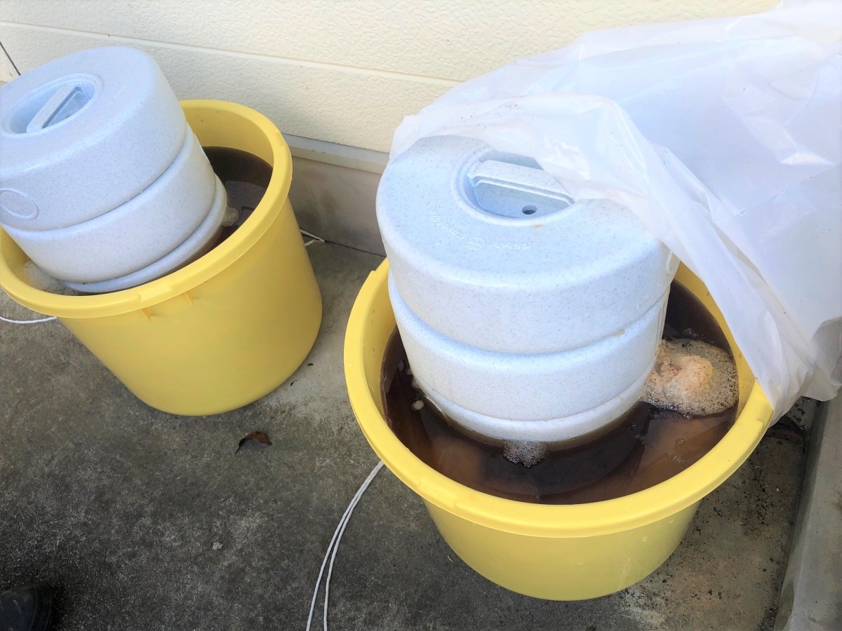 12月11日に漬け作業を終えて3週間ちょっと経過しました。12月25日に覗いた際、1L塩水をプラスした方は、少し傾いて半分漬け汁につかっていませんでしたが、今回はしっかり全体に漬け汁が上がってきていました!