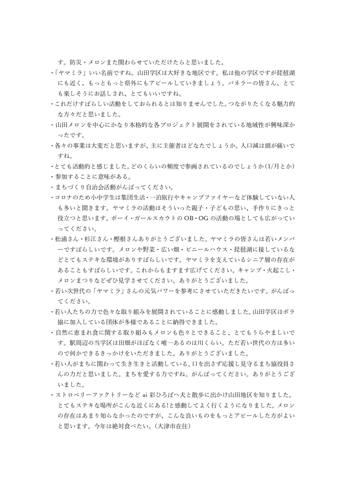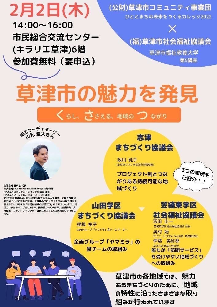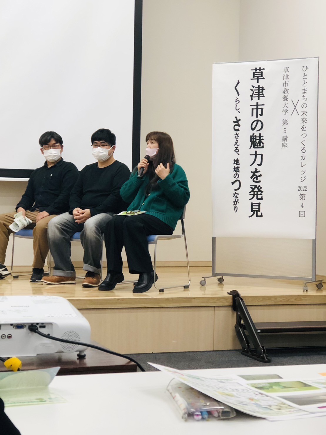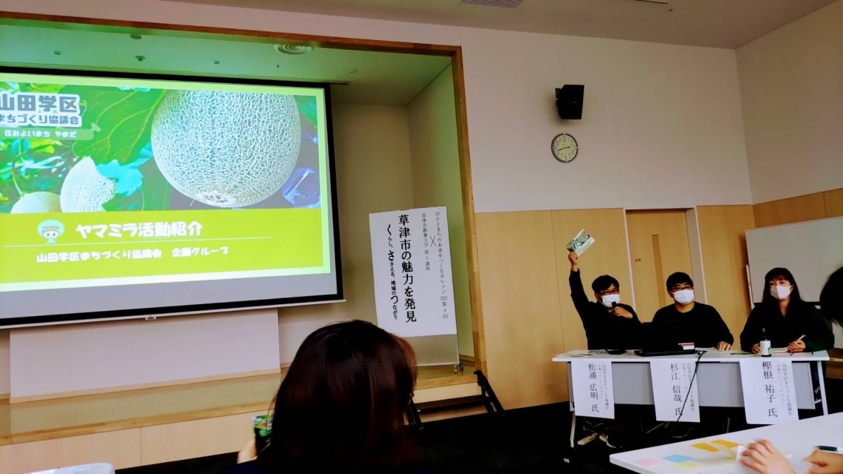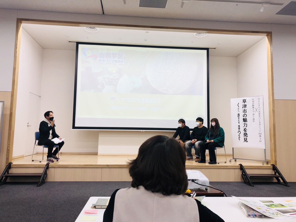 2月2日にキラリエ草津で、ひととまちの未来をつくるカレッジ2022 第4回「草津市の魅力を発見 ~くらし ささえる 地域のつながり~」が開催されました。草津市内の地域独自のユニークな取り組みが3例紹介され、山田学区からは、企画グループ ヤマミラメンバーの樫根祐子さん、松浦広明さん、杉江信哉さんがヤマミラの活動を発表しました。