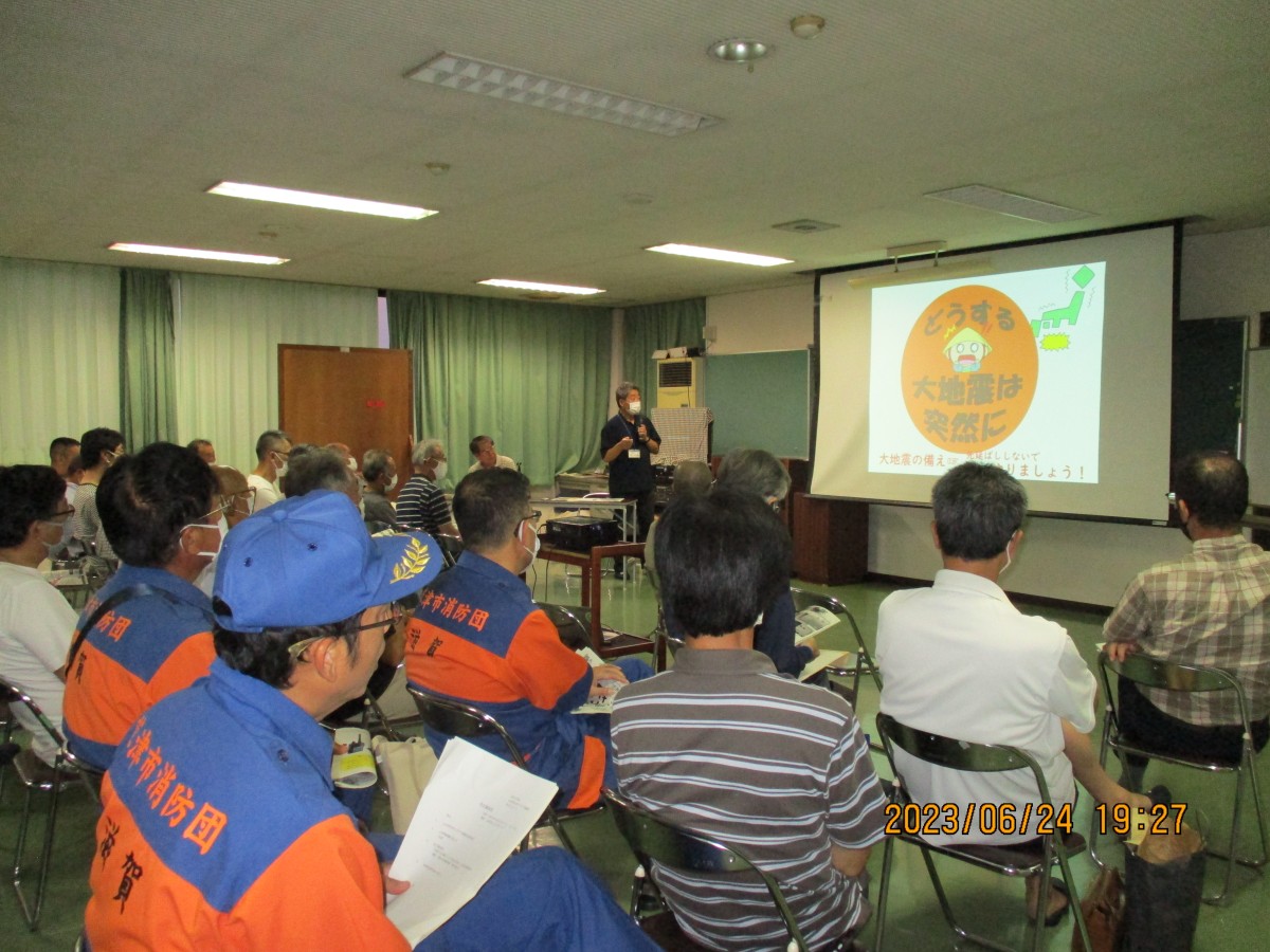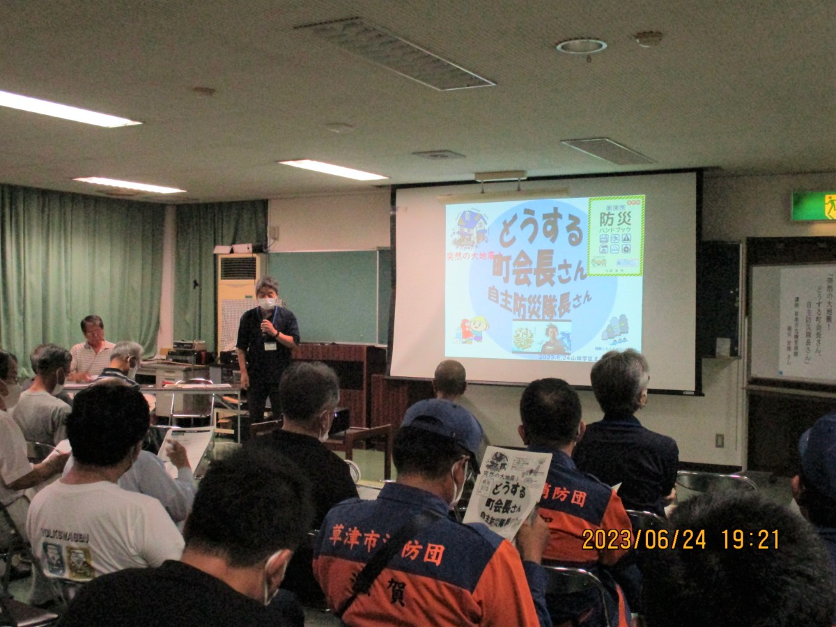 6月24日、草津市危機管理課の徳田安雄さんを講師に招いて「大地震!どうする町会長さん、自主防災隊長さん」をテーマに防災講習会を開催しました。各町の町内会長と防災関係者合わせて、42名の参加がありました。風水害と、予測できない地震では避難行動が違うということや、草津市の防災体制について説明を受けました。市の体制が立ち上がり、避難所の開設までにどうしても時間がかかるので、まずは町内会での自助共助が必要です。発生直後は、まず自分を守り、その次は隣近所での安全確認。各家庭や町内で日頃の準備・対策をして、大切な命を守りましょう。