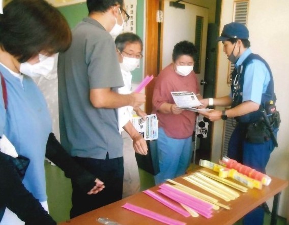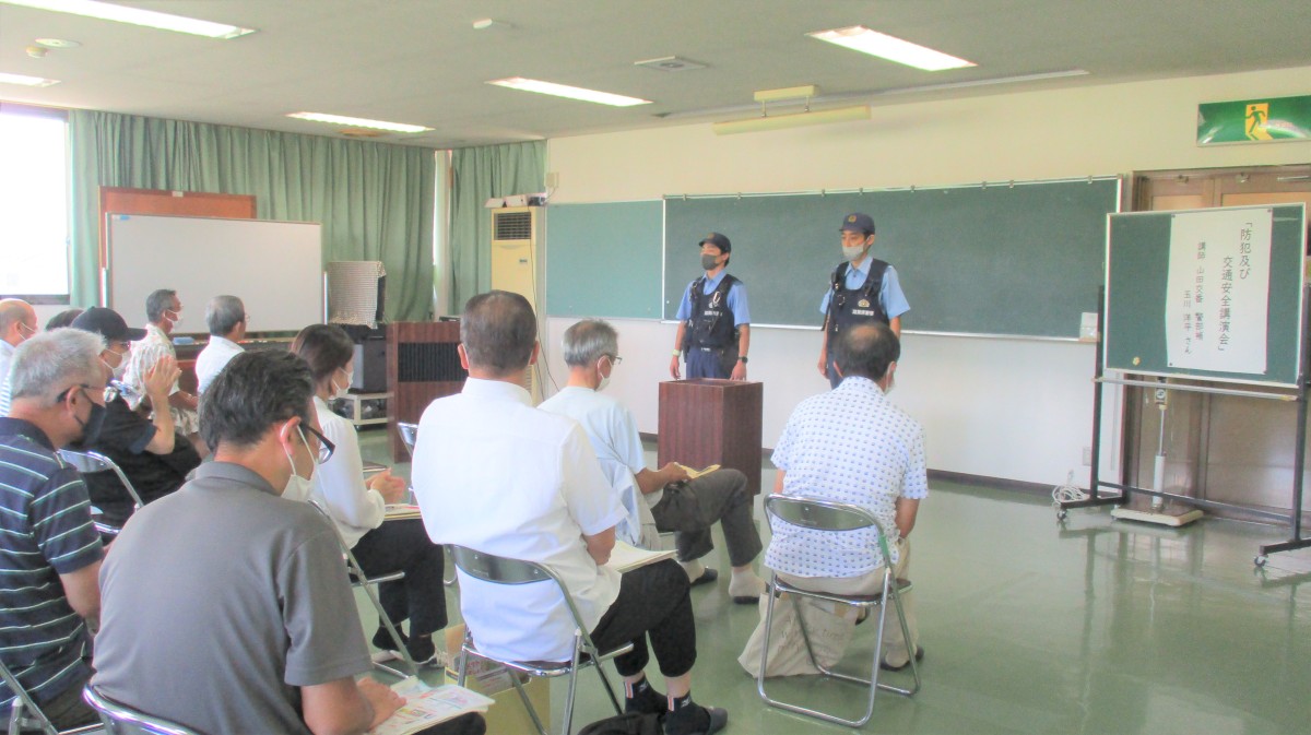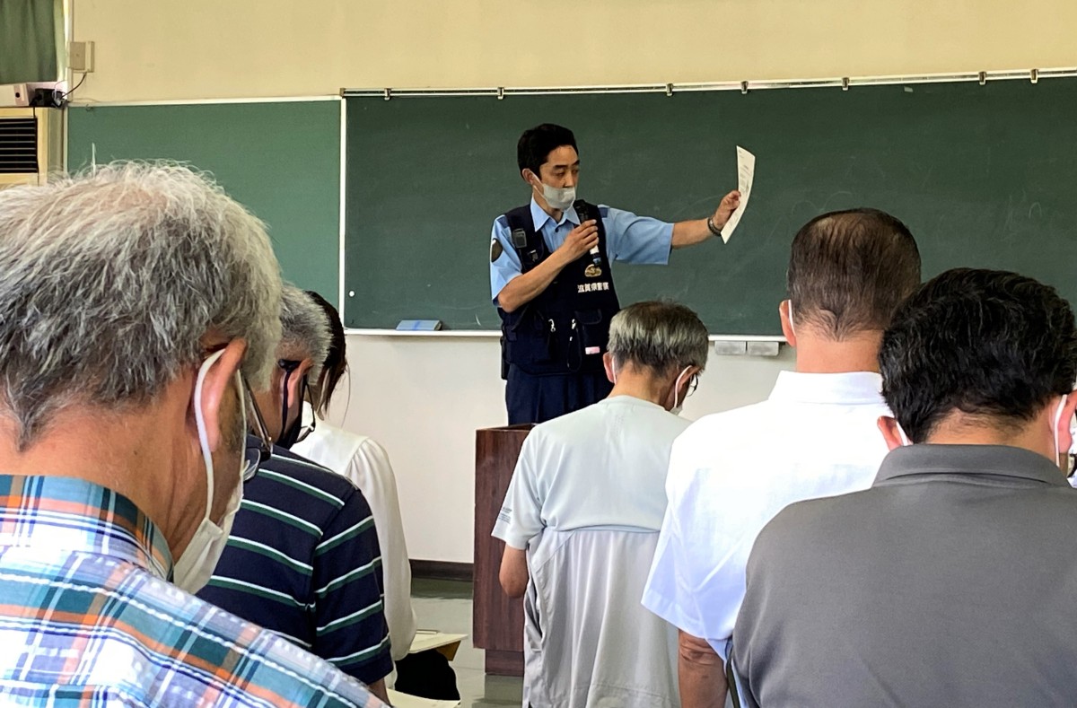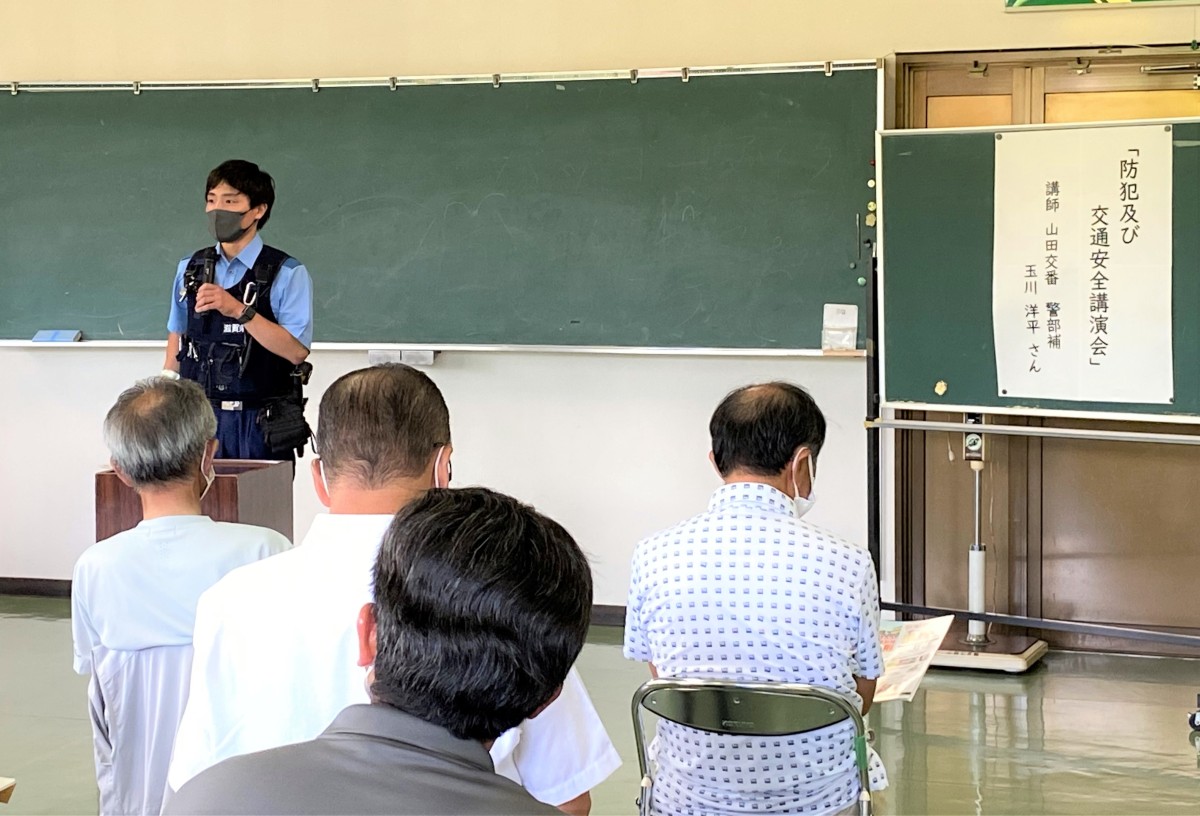 8月19日、草津栗東交通安全協会山田支部と安全環境グループの共催で、山田交番の玉川警部補と新宮巡査長による防犯講演会を、山田まちづくりセンターで開催しました。草津市内でも発生している高齢者を狙った詐欺事件や不用品の買取を口実にした「押し買い」などの実例の紹介や、最近努力義務になった自転車のヘルメットの必要性、道路を走行する時の注意など、日常の犯罪や危険についてのお話がありました。他人事ではないと考えさせられた、講演でした。