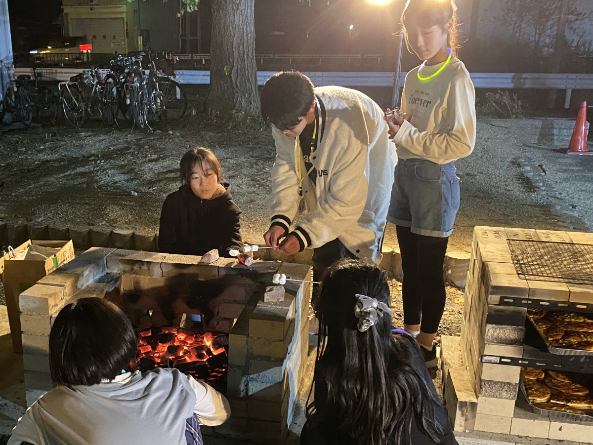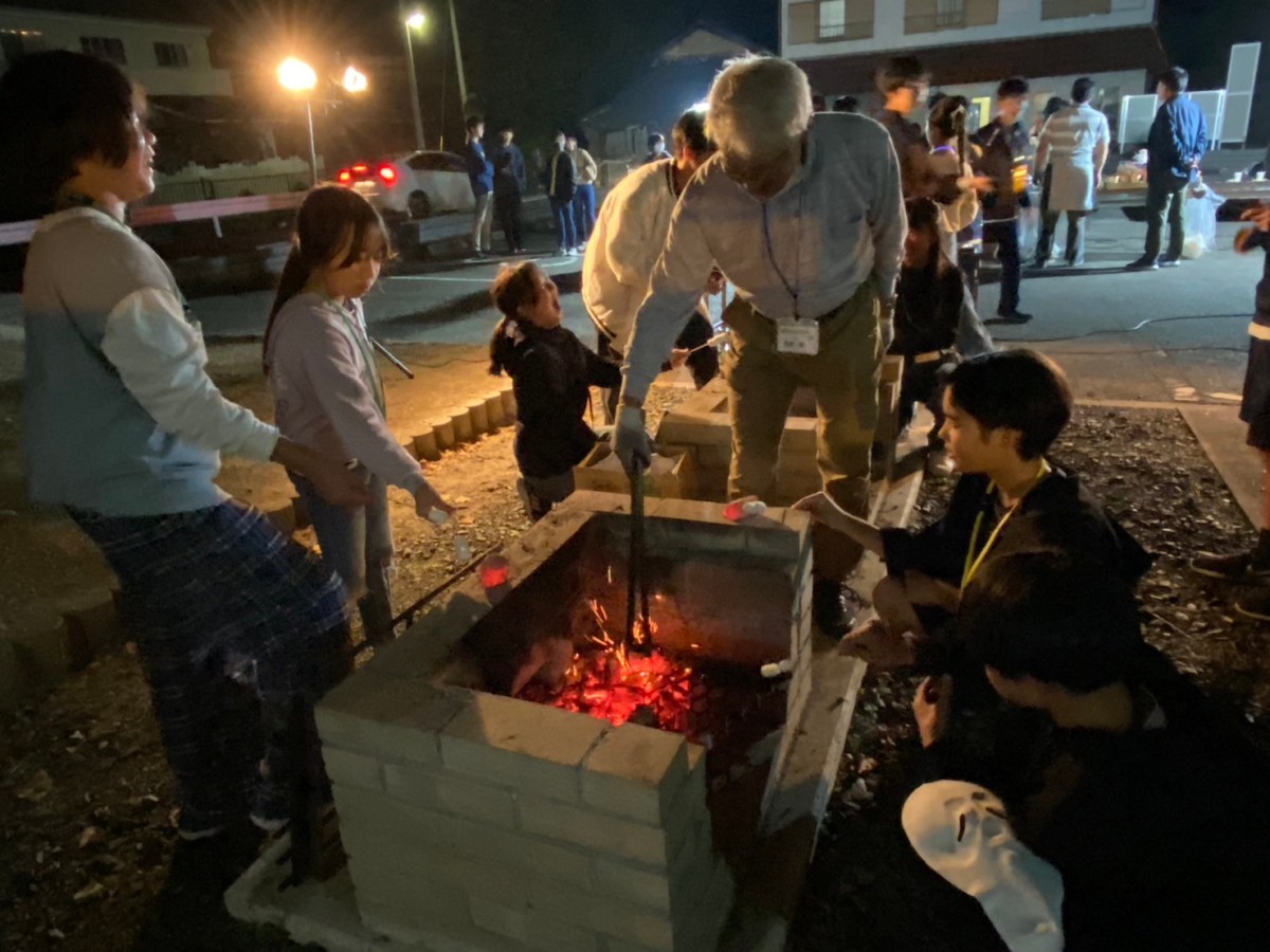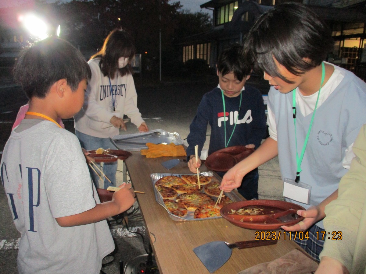 その後は「ジェスチャーゲーム」と「仲間探しゲーム」そして「ビンゴゲーム」です。言葉を話さずにお題をジェスチャーで表現したり、仲間を探したり。ビンゴゲームはワクワクドキドキ!どの景品がもらえるかなぁー。夕食メニューも企画チャレンジャーの考案。バーベキューにピザ、焼きそばです。皆で食べる食事は美味しいですね。そして最後は恒例の度胸だめしと、ほっこりぬくぬくのかまど体験。今年のアドベンチャーハウスは盛りだくさんで、皆の歓声があちこちであがっていました。