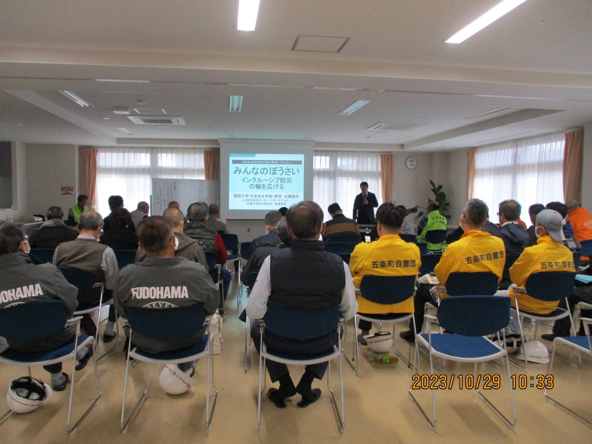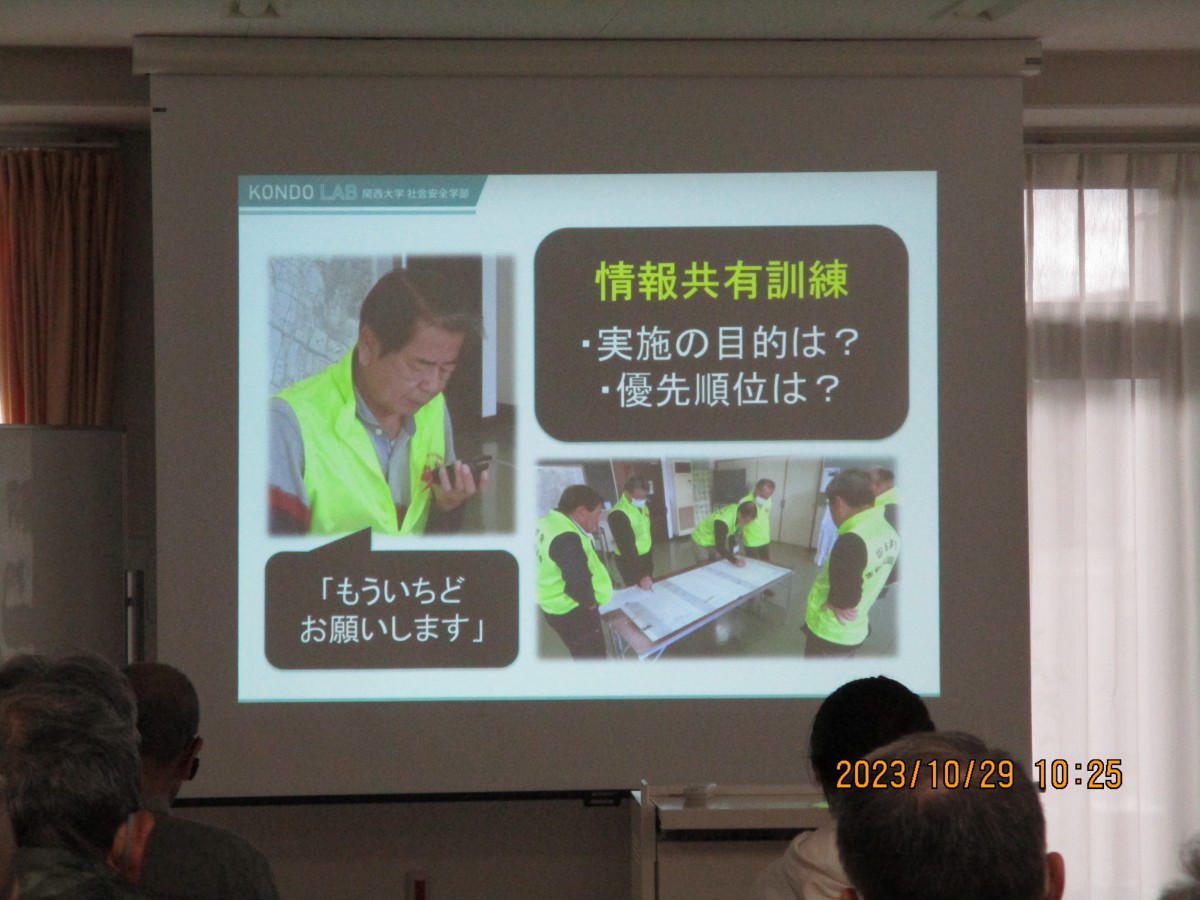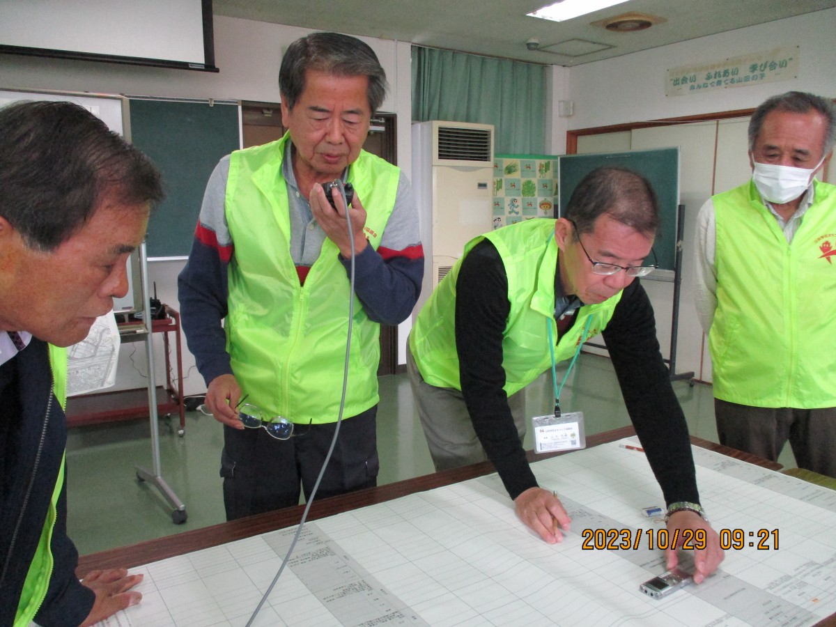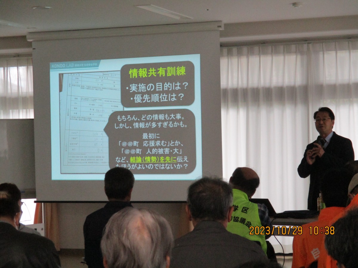 10月29日、震度6強の地震が発生したとの想定で、山田学区防災訓練を行いました。今回は前半に各町内会の対策本部を立ち上げ、被害・安否確認を実施。それを踏まえて『山田学区地区防災計画』に基づく学区対策本部と、各町内会との無線機を使った情報伝達訓練をしました。後半には山田学区の防災に関わっていただいている、関西大学社会安全学部の近藤誠司教授に講演をしていただきました。テーマは「みんなのぼうさい~インクル-シブ防災の輪を広げる~」で、会場となった山田学区防災ふれんどしっぷ協定第1号の「えんゆうの郷」には、各町の町内会長と防災関係者合わせて45名の参加がありました。情報伝達訓練では、各町内会からの被害状況報告を何度か確認する場面や「声が小さい」「早口で聞き取りが出来ない」等、様々な問題がありました。近藤教授の講評では、実施の目的や優先順位を考える事、どの情報も大事だが情報が多すぎるので、最初に「〇〇町 応援求む」とか「〇〇町 人的被害大」など結論(情勢)を先に伝えたほうがよいのではないかというアドバイスをいただきました。高齢化社会でもあり、災害発生時の避難等に特に支援を要する方など、あらゆる「人」を取り残さない「インクル-シブ防災」の輪を広げる取り組みや、防災と福祉にまたがる領域についての講演でした。