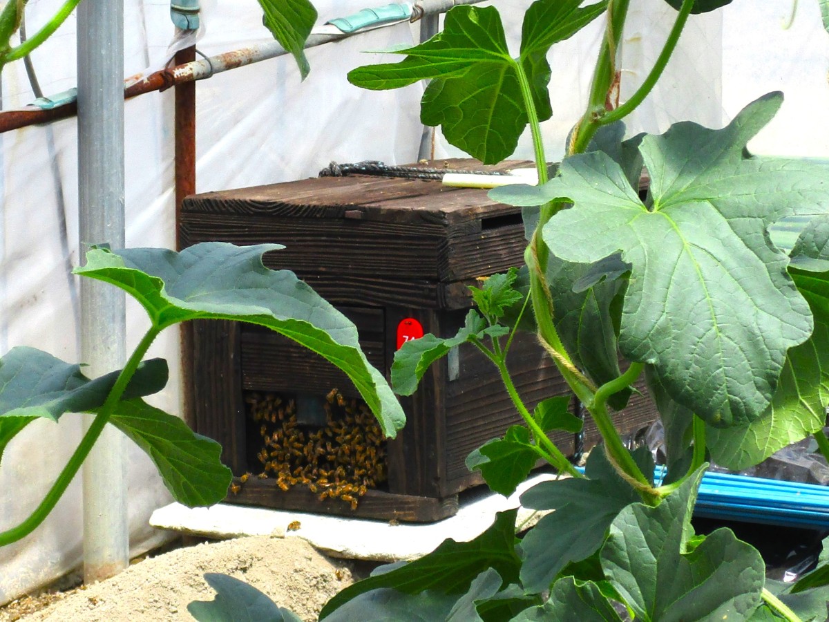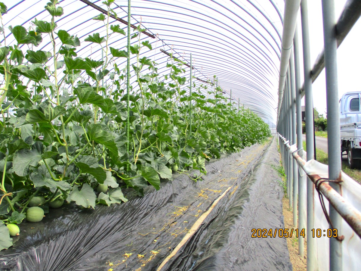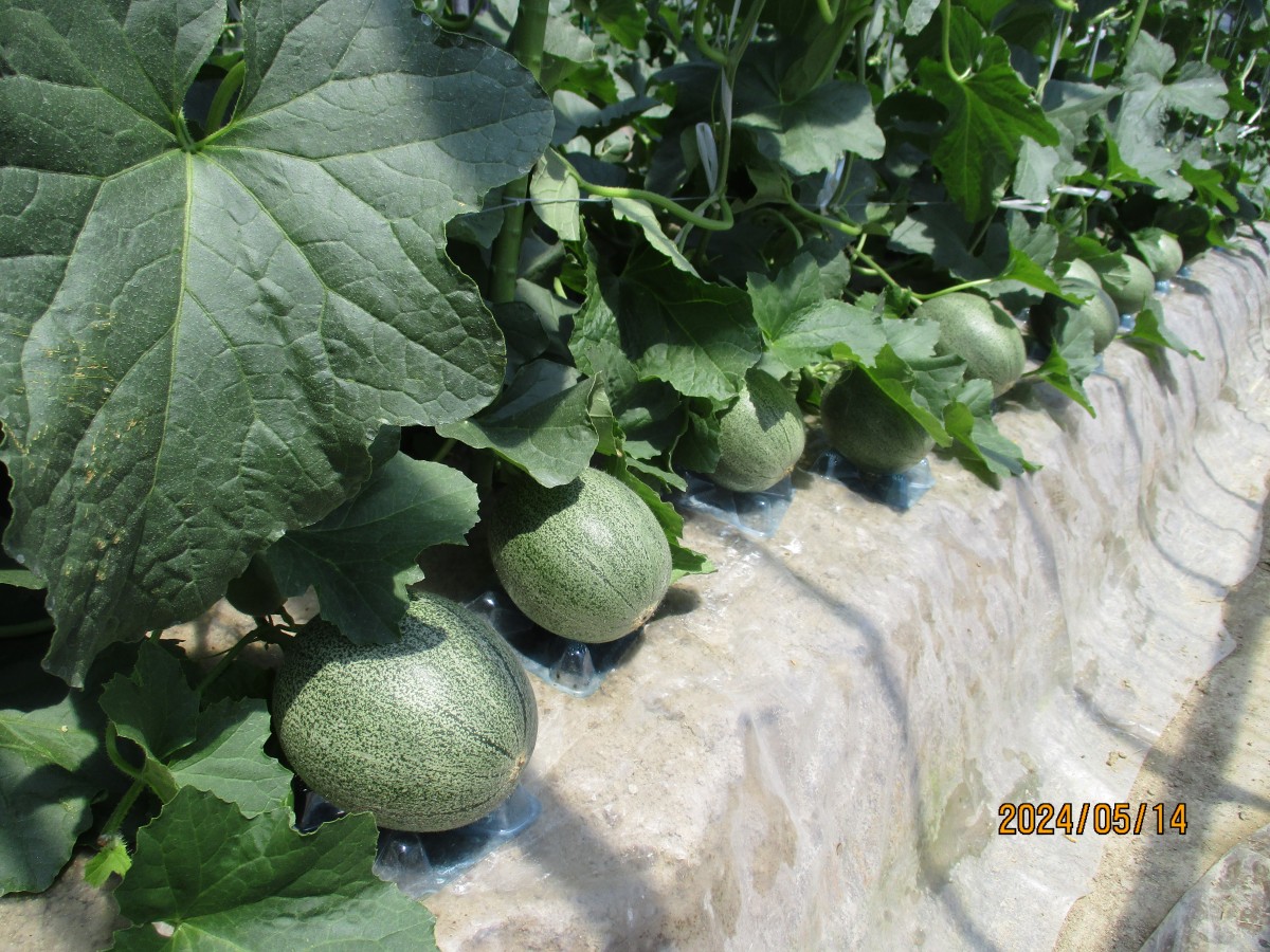 まずは、五条の清水さんのビニールハウスにお邪魔しました。こちらでは3月8日に植えられた「アムスメロン」と「レノンハート」を見せてもらいました。受粉を手助けするミツバチの巣箱があり、ハウス内には蜂がぶんぶん飛んでいました。お天気がよい日だったので、ハウス内は25℃ほどありました。昼頃にはもっと高くなり、温度管理や湿度管理がこれから大変なようです。