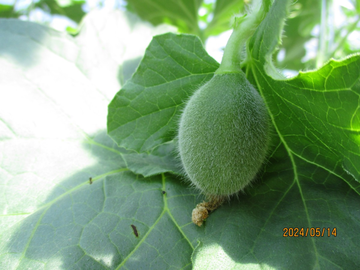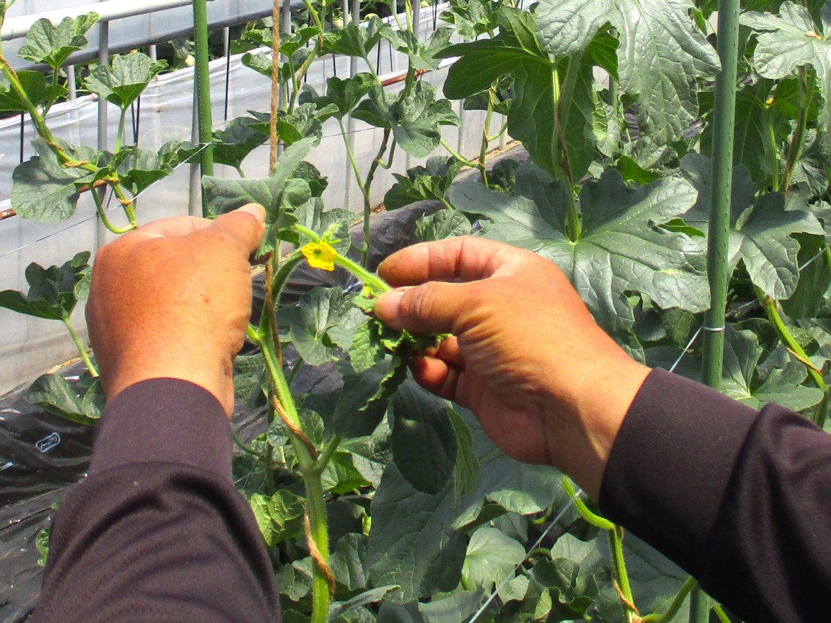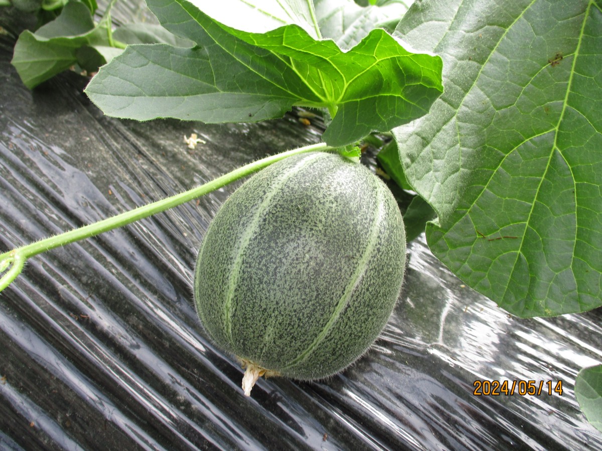 まずは、五条の清水さんのビニールハウスにお邪魔しました。こちらでは3月8日に植えられた「アムスメロン」と「レノンハート」を見せてもらいました。受粉を手助けするミツバチの巣箱があり、ハウス内には蜂がぶんぶん飛んでいました。お天気がよい日だったので、ハウス内は25℃ほどありました。昼頃にはもっと高くなり、温度管理や湿度管理がこれから大変なようです。