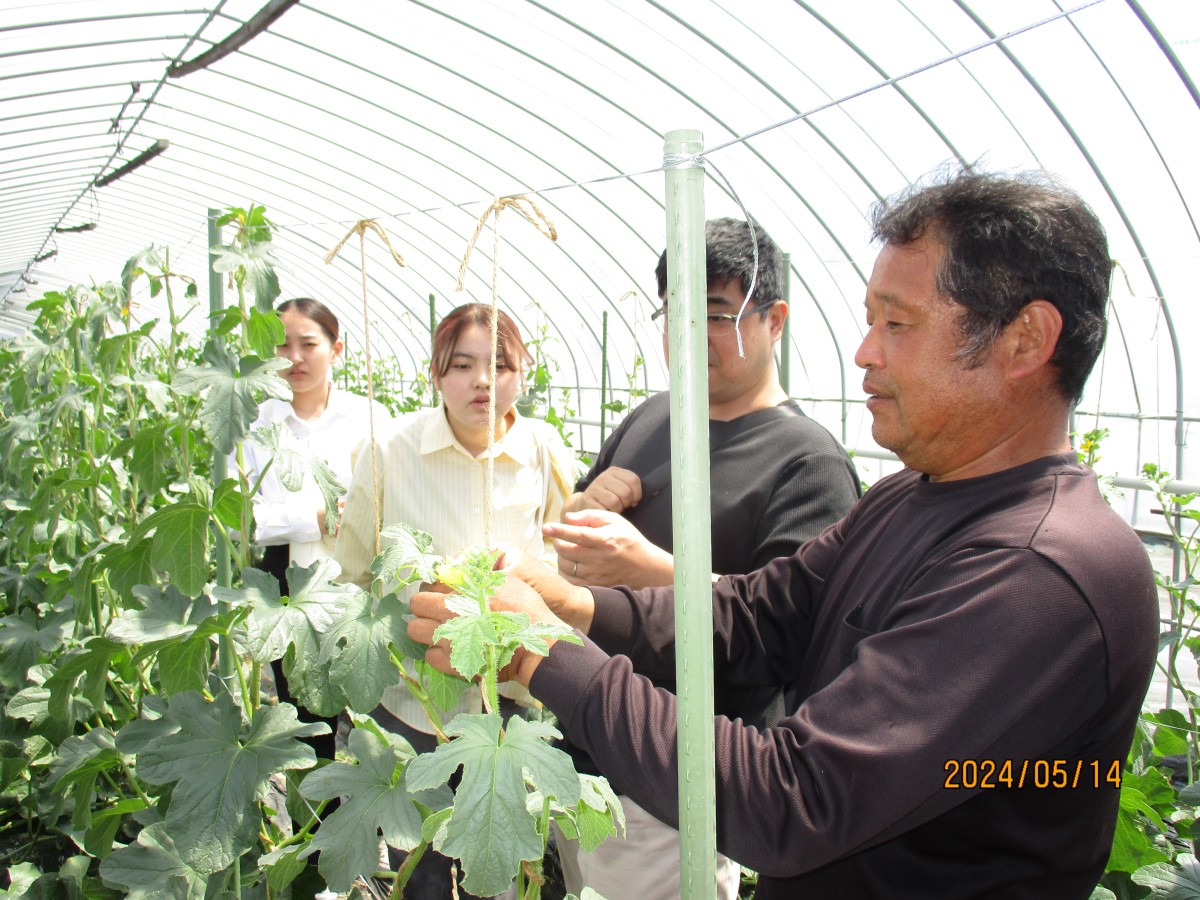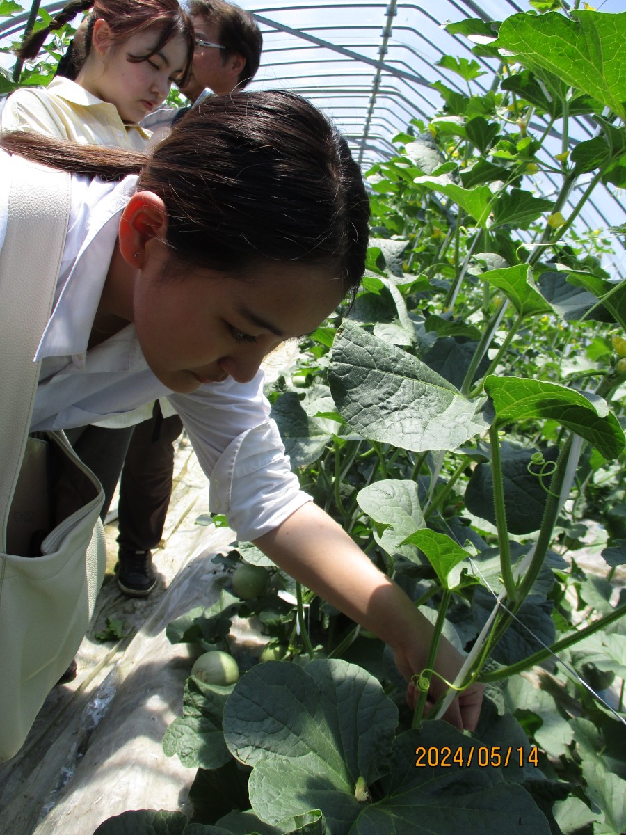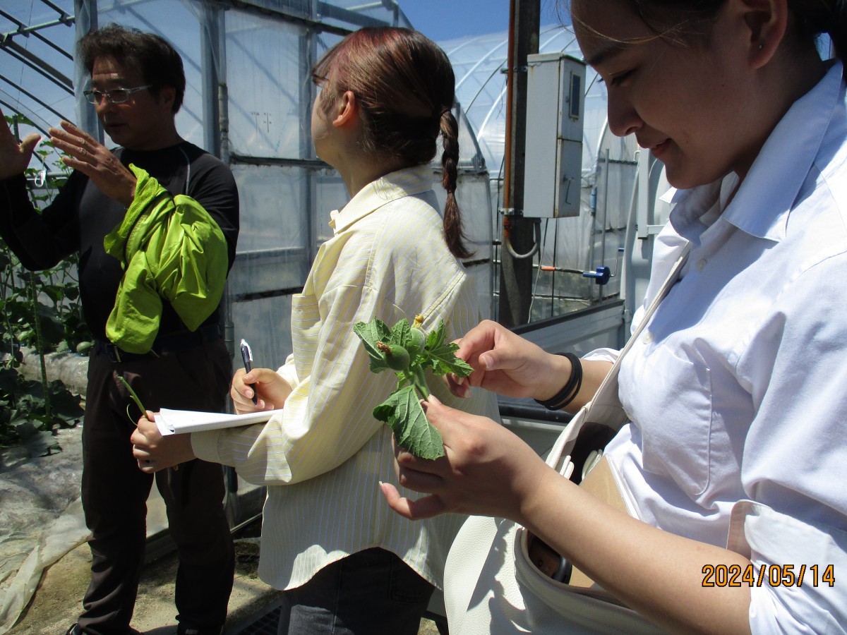 次に、北山田の池田さんのビニールハウスにお邪魔しました。こちらでは3月15日ごろに植えられた「タカミメロン」を見せてもらい、メロンの摘果作業を体験させていただきました。はじめての摘果作業に大学生もヤマミラも大興奮で、小さくて可愛いメロンを大事そうに持ち帰りました。新たに取り組みたいことや農家さんから大学生に望むことなど、たくさんお話を聞かせていただきました。