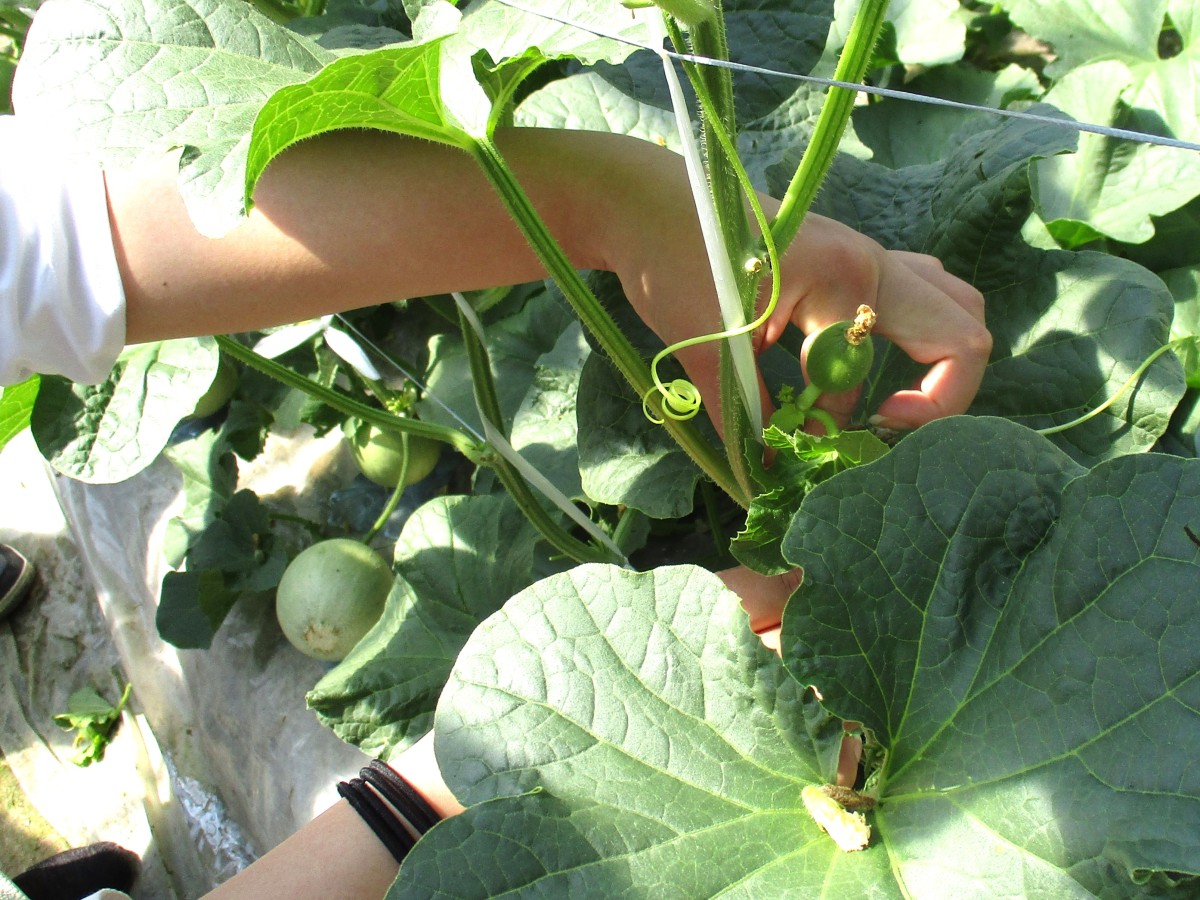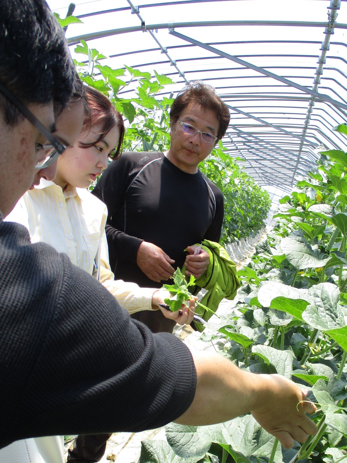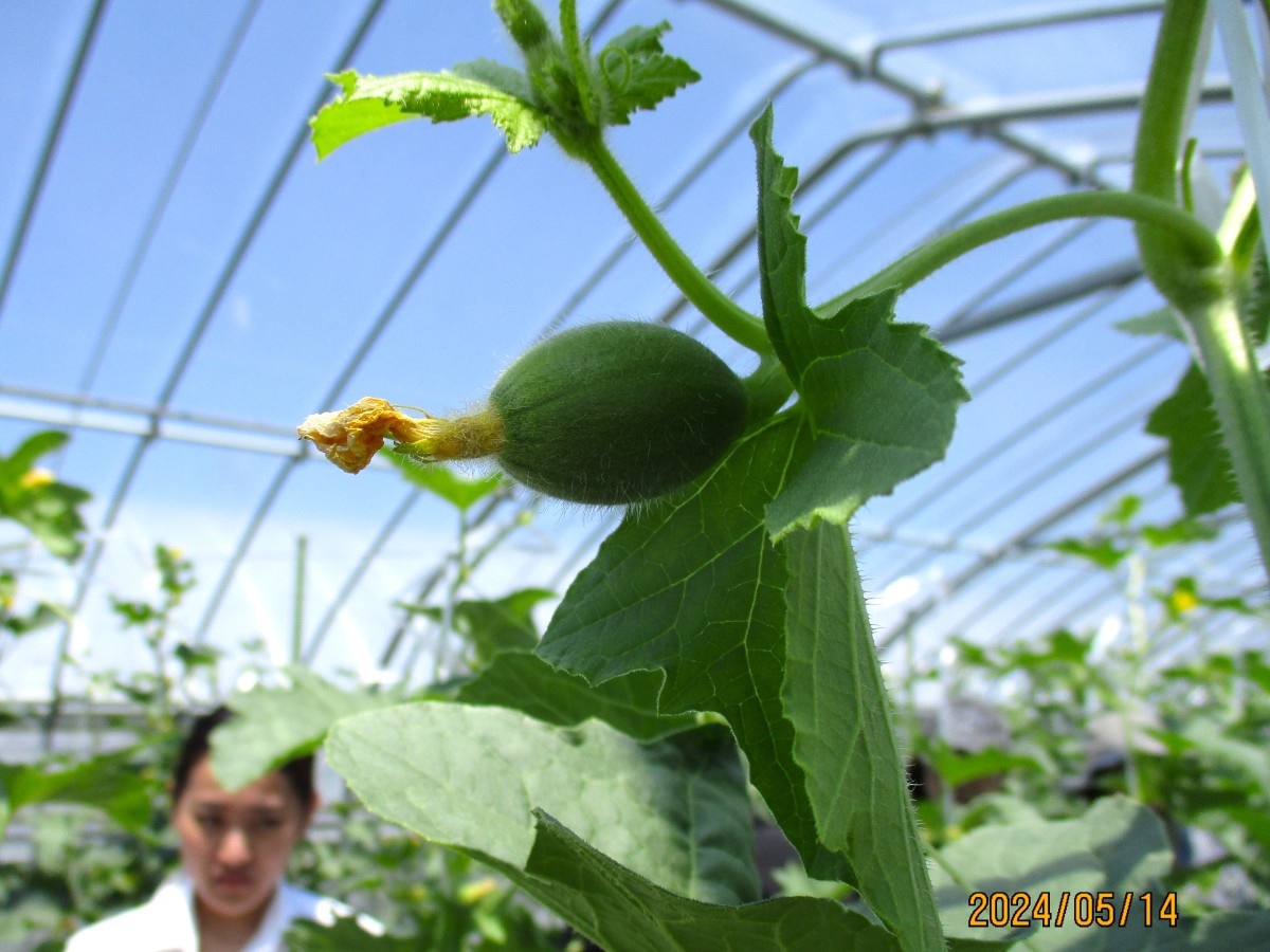 次に、北山田の池田さんのビニールハウスにお邪魔しました。こちらでは3月15日ごろに植えられた「タカミメロン」を見せてもらい、メロンの摘果作業を体験させていただきました。はじめての摘果作業に大学生もヤマミラも大興奮で、小さくて可愛いメロンを大事そうに持ち帰りました。新たに取り組みたいことや農家さんから大学生に望むことなど、たくさんお話を聞かせていただきました。