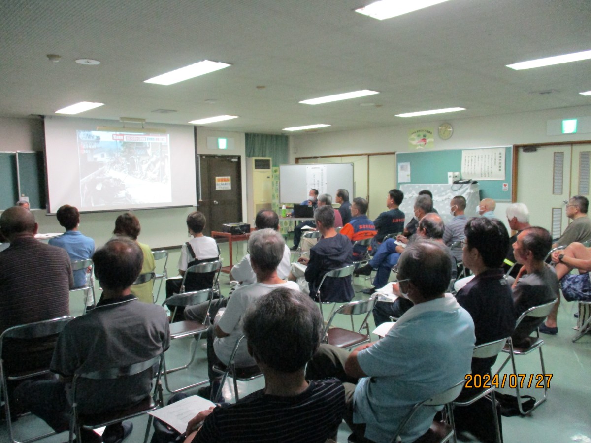各町の町内会長と防災関係者合わせて34名の参加がありました。現地での被災状況の話、避難している方の映像では揺れる電柱、崩壊する家屋、道路の地割れ等、生々しいシーンに参加者も熱心に見聞きしていました。