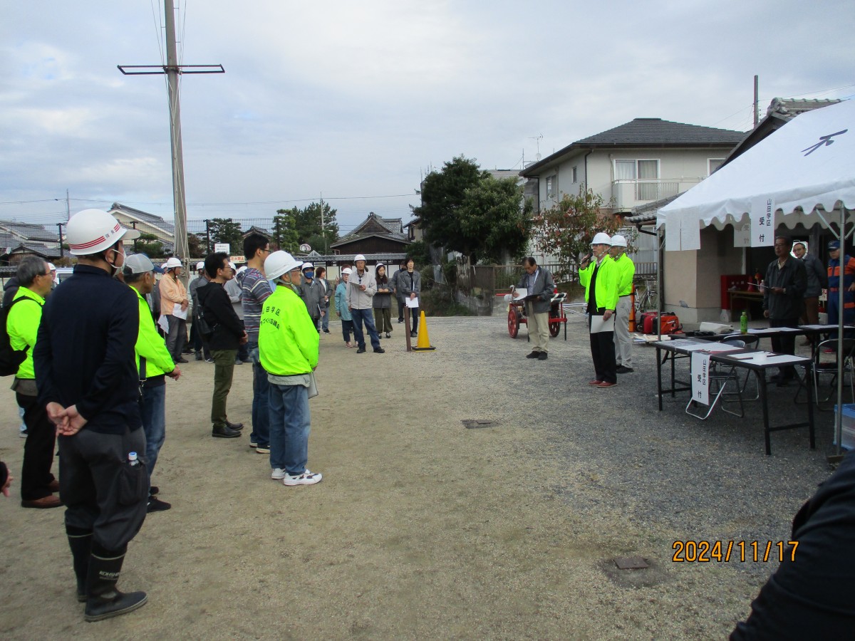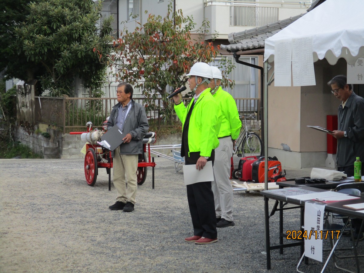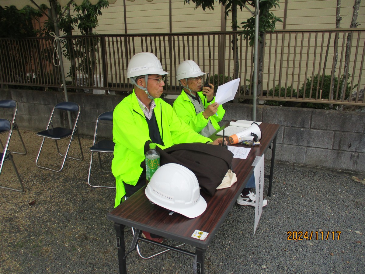 11月17日(日) 不動浜会館をメイン会場にして、今年度の防災訓練を実施しました。不動浜町の安否確認訓練に参加者も同行した被害状況の確認作業山田学区対策本部への無線による報告終了後、関西大学社会安全学部教授近藤誠司氏から初動の助けあいの為に自身や家族の防災力アップに努める夜間や雨天の状況も想定した訓練が必要で訓練を重ねる事で身体が反応するので災害時に活かせるよう今後も取組んでいただきたいとの講評がありました。