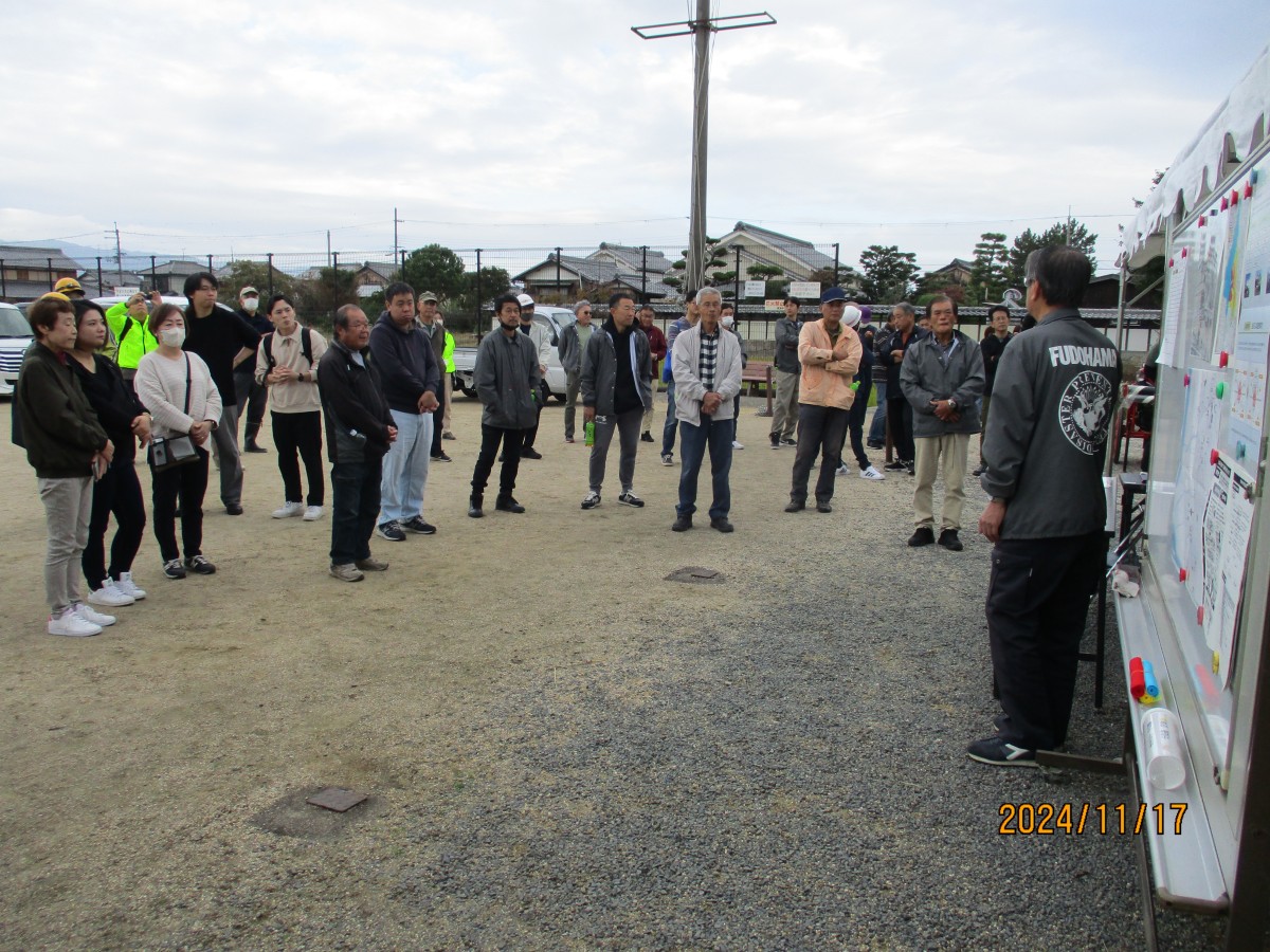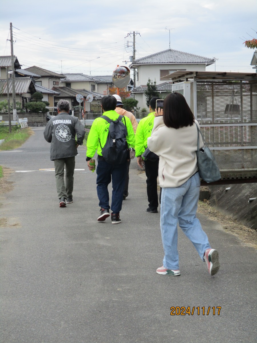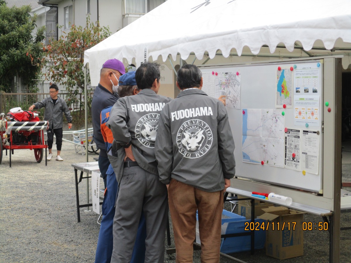 11月17日(日) 不動浜会館をメイン会場にして、今年度の防災訓練を実施しました。不動浜町の安否確認訓練に参加者も同行した被害状況の確認作業山田学区対策本部への無線による報告終了後、関西大学社会安全学部教授近藤誠司氏から初動の助けあいの為に自身や家族の防災力アップに努める夜間や雨天の状況も想定した訓練が必要で訓練を重ねる事で身体が反応するので災害時に活かせるよう今後も取組んでいただきたいとの講評がありました。
