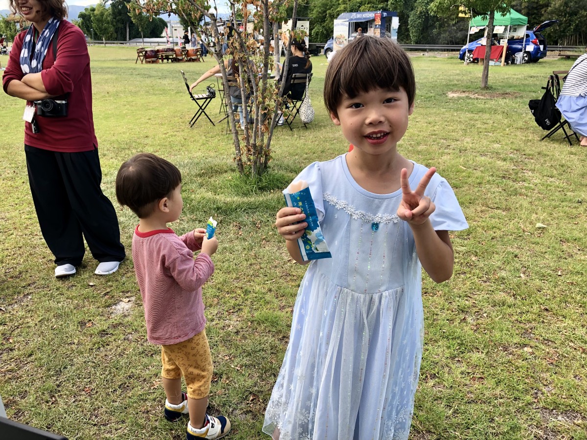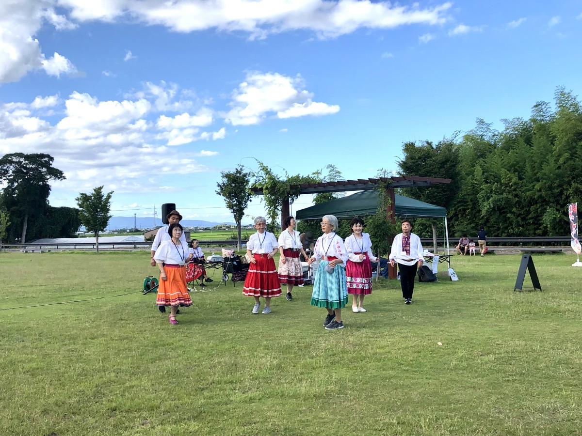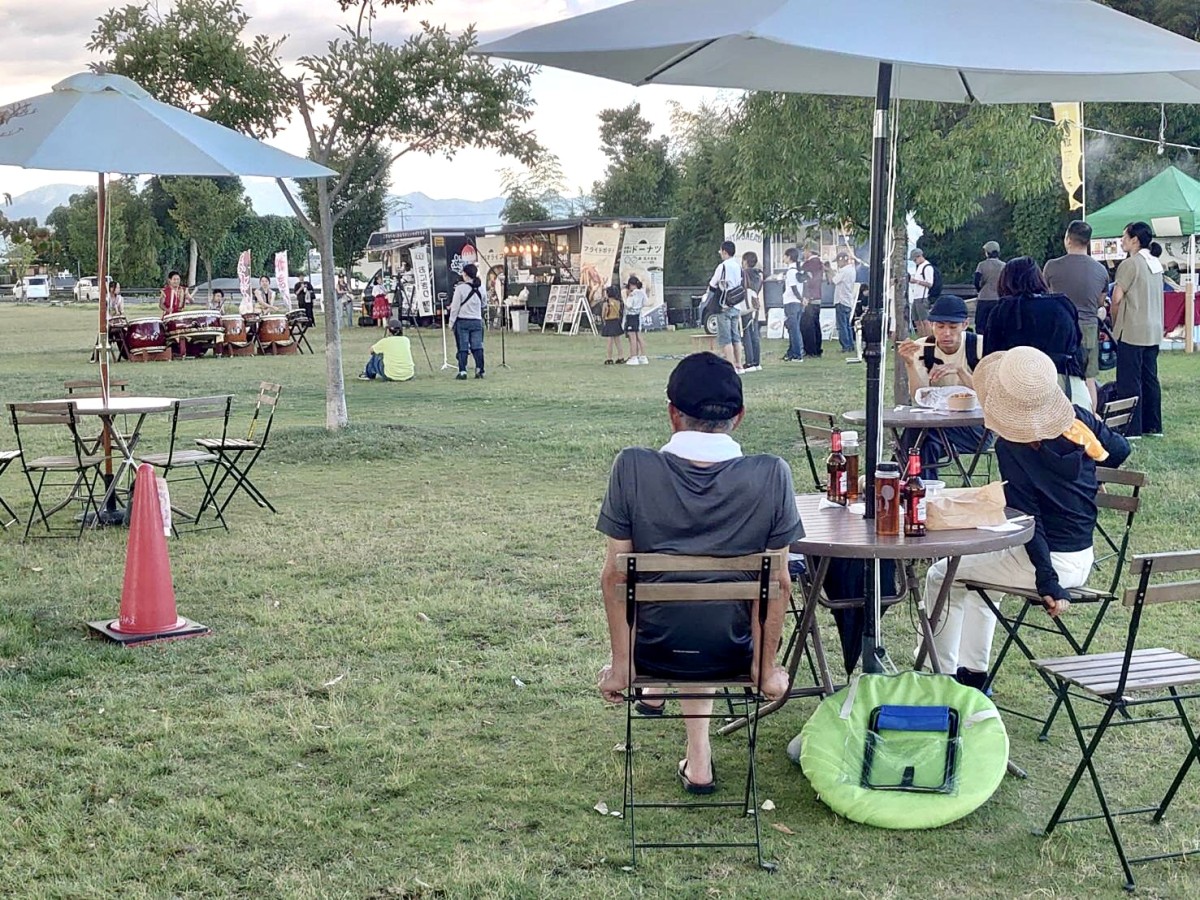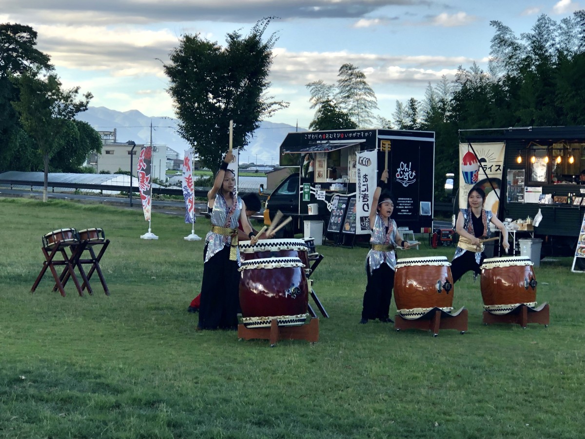太陽が照り気温が高い中でのスタートでしたが、間もなく日差しも和らぎ過ごしやすくなりました。広い芝生広場で走りまわっている子どもたちや家族で凍らせてシャーベットを食べる様子が見られました。また、大学生によるモルック体験や、スカーレットさんによるフォークダンスでは、子どもたちが一緒になって楽しんでいました。メロンまつりでも発表されたてんびん太鼓塾の和太鼓のパフォーマンスも会場を盛り上げていました。良い雰囲気の中でゆっくりと過ごすことができる納涼彩でした。
