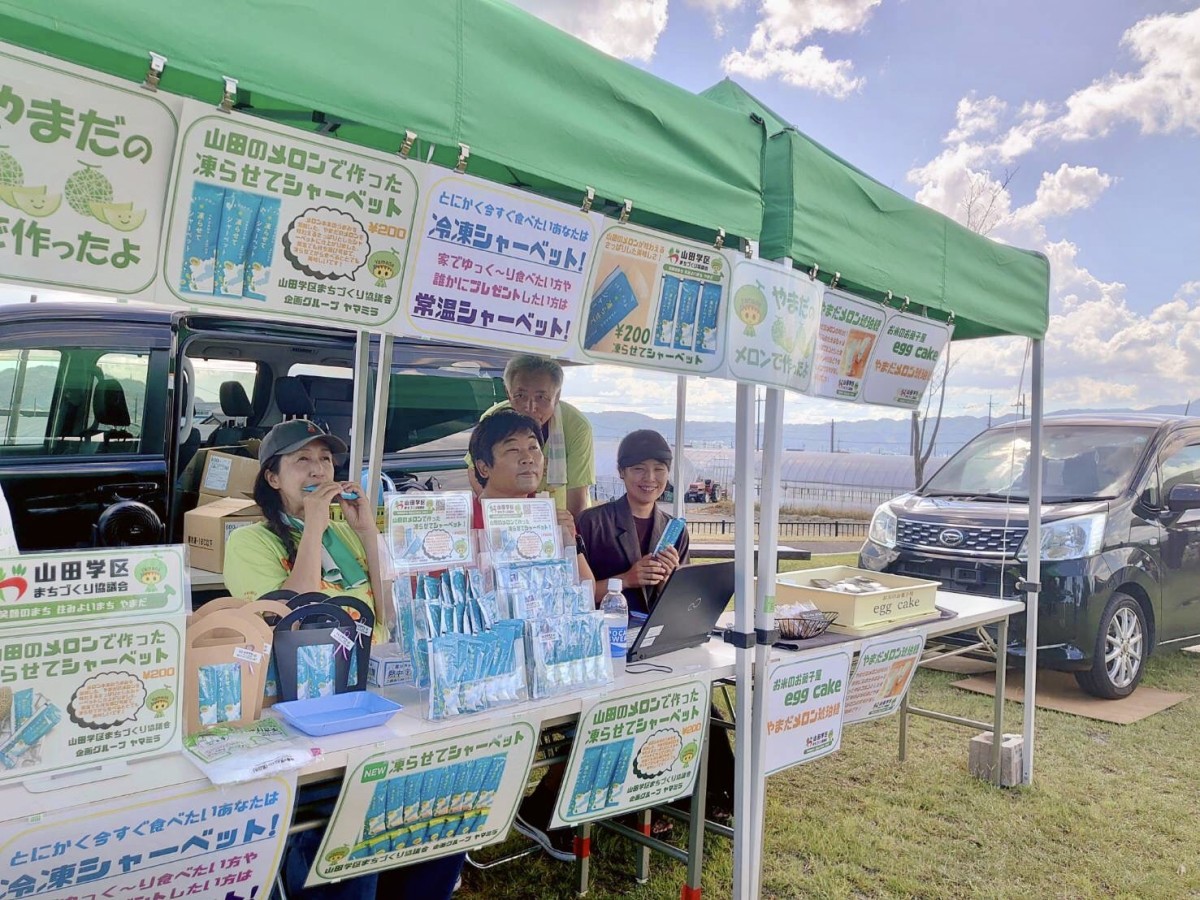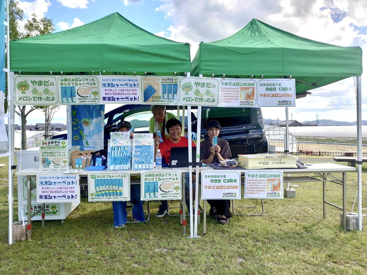 7月26日、ai彩ひろばの納涼彩で凍らせてシャーベットを出店しました。今回は山田のメロンで作った近江麦酒さんの「やまだメロンエール」やeggcakeさんの「やまだのメロン琥珀糖」も出店され、メロンシリーズが並びました。