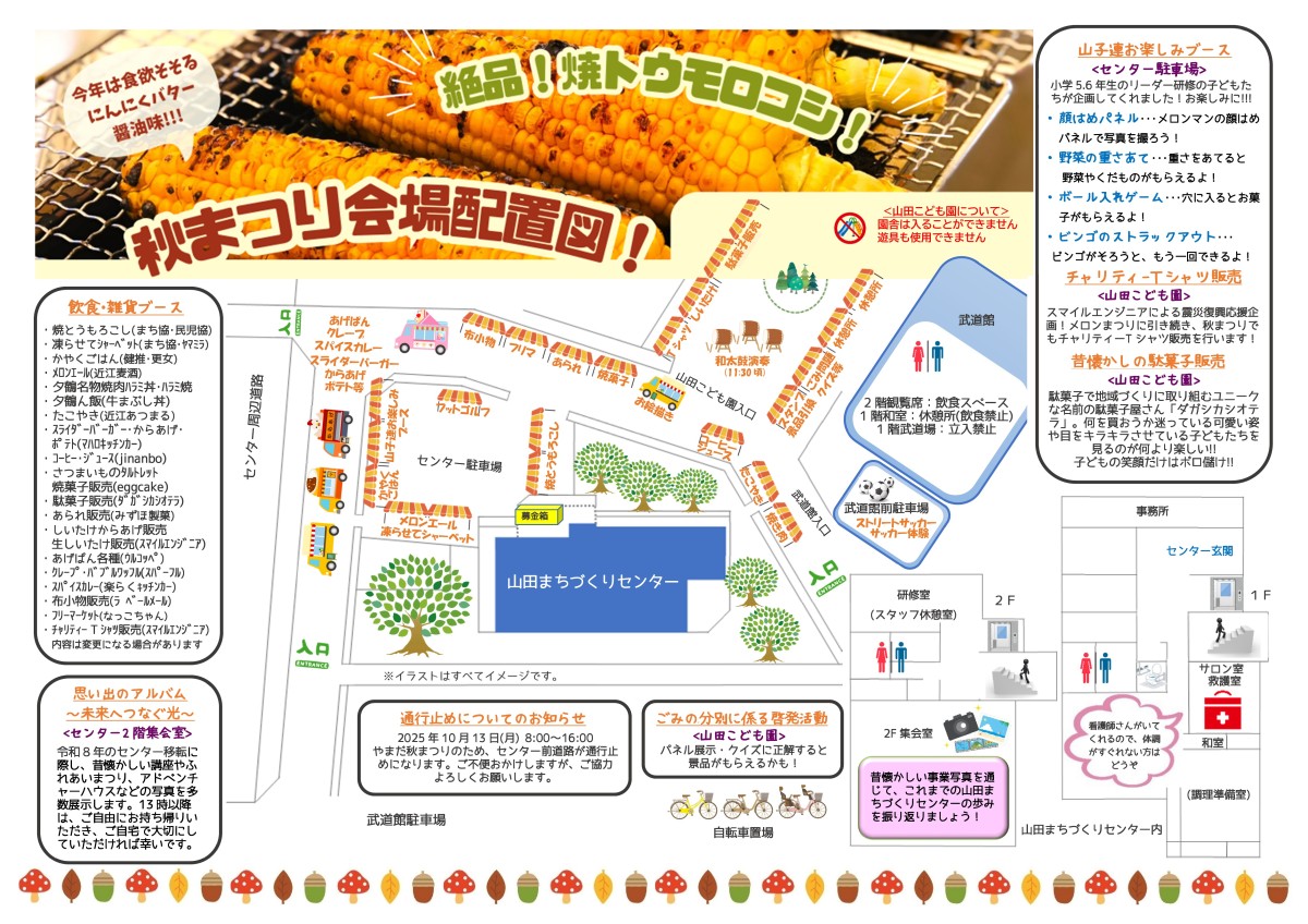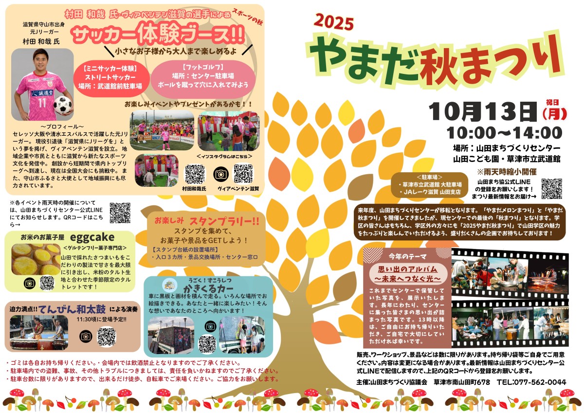 来年度、山田まちづくりセンターが移転となります。「やまだメロンまつり」と「やまだ秋まつり」を開催してきましたが、現センターでの最後の「秋まつり」となります。学区の皆さんはもちろん、学区外の方々にも「2025やまだ秋まつり」で山田学区の魅力をたっぷりと楽しんでいただけるよう、地域のお店、サッカーイベント企画、和太鼓演奏、チョークでお絵描き、キッチンカーなど盛りだくさんの企画でお待ちしております!