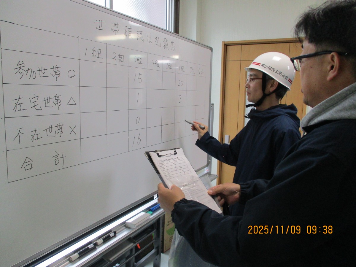 当日雨天の中、町内会長、各町の自主防災メンバーを主に42名が南山田町の安否確認訓練に参加しました。