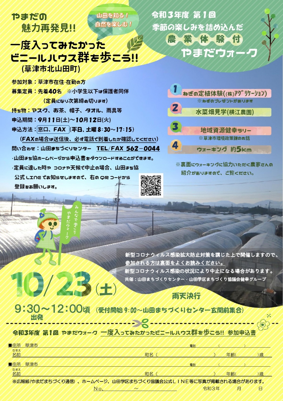 注:緊急事態宣言発令に伴って山田まちづくりセンターは9月30日(木)まで休館中のため、9月30日(木)まではFAXのみの申込とさせていただきます。FAXのない方は電話でお問い合わせください。