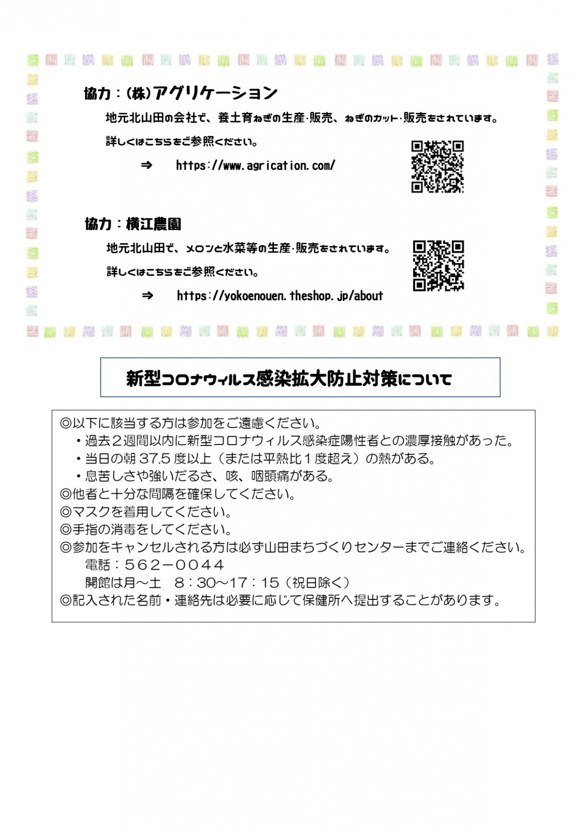 問い合わせ:山田まちづくりセンターTEL/FAX 562-0044