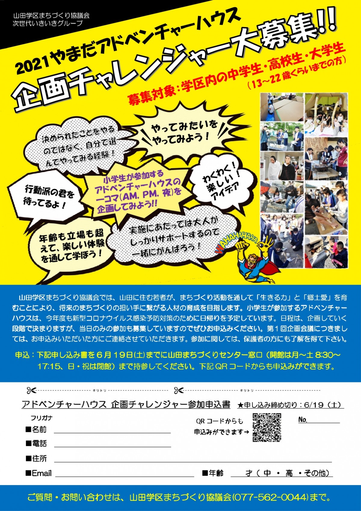 山田学区まちづくり協議会では、山田に住む若者が、まちづくり活動を通して「生きる力」と「郷土愛」を育むことにより、将来のまちづくりの担い手に繋がる人材の育成を目指します。小学生が参加するアドベンチャーハウスは、今年度も新型コロナウイルス感染予防対策のために日帰りを予定しています。日程は、企画していく段階で決まりますが、当日のみの参加も募集していますのでぜひお申込みください。第1回企画会議につきましては、お申込みいただいた方にご連絡させていただきます。