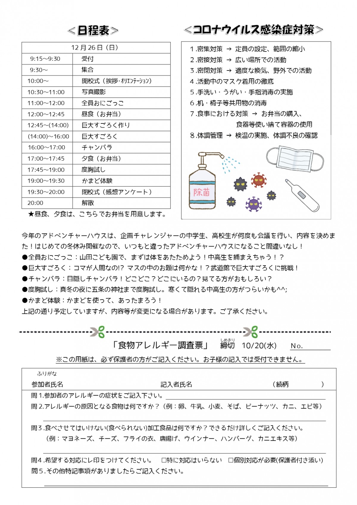 アドベンチャーハウス日程表とコロナウイルス感染症対策をご確認の上、お申込みください。昼食、夕食はこちらでお弁当を用意します。ご参加お待ちしています。